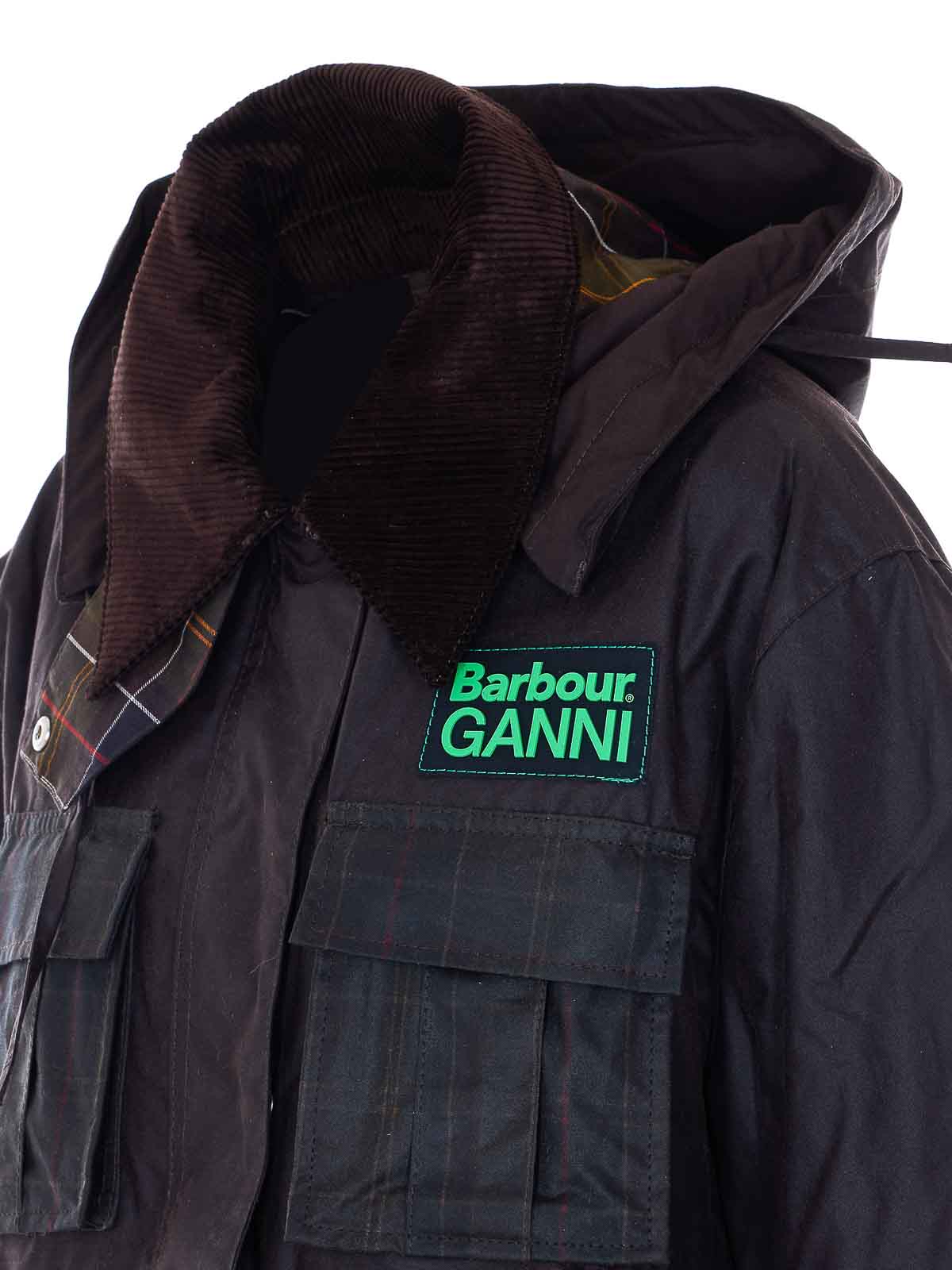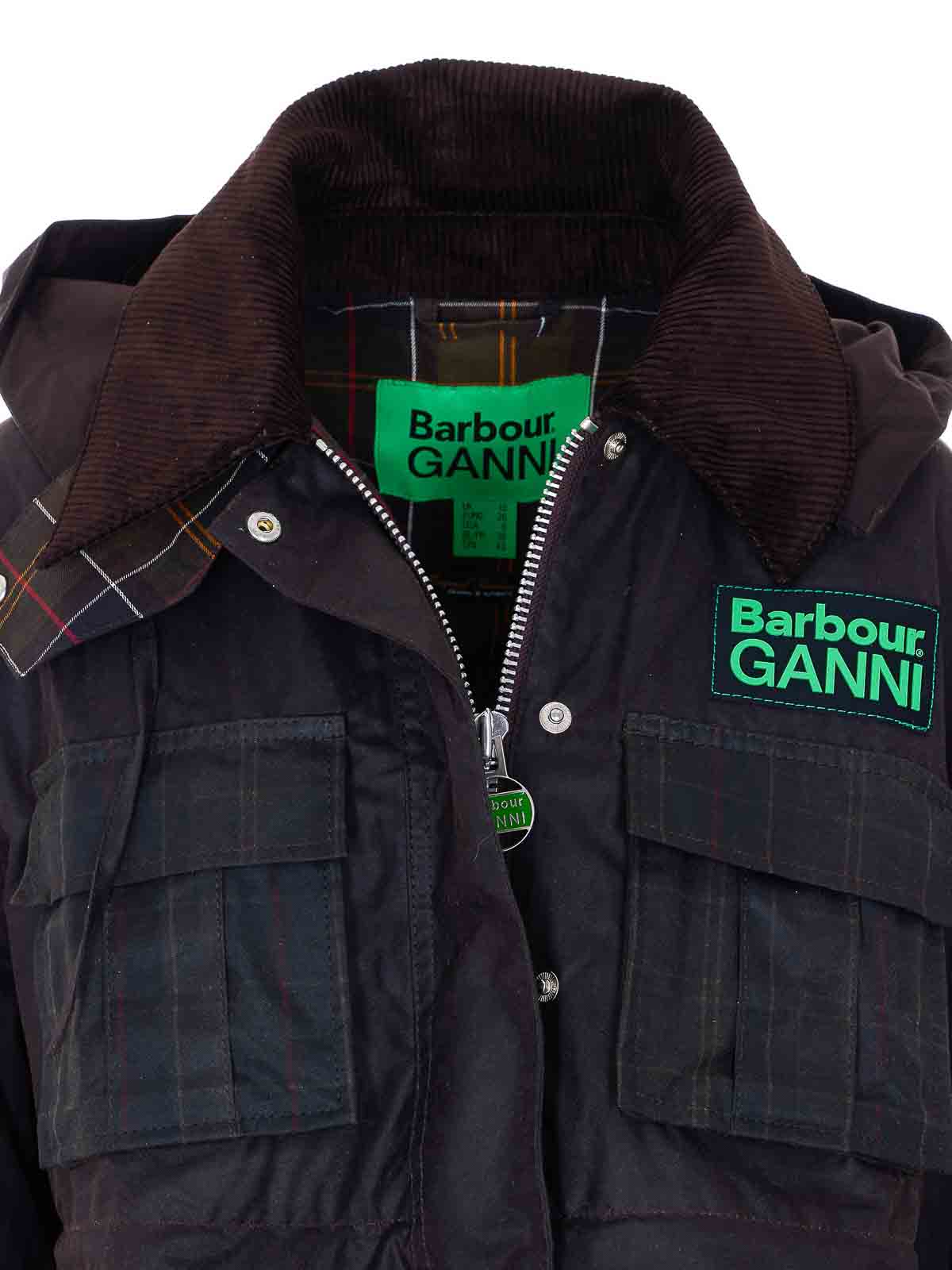 Giacca rustica in cera Barbour x ganni con chiusura frontale con zip e bottoni, colletto regolare, maniche lunghe, patch logo sul davanti, tasche con chiusura con bottoni, dettaglio removibile, cappuccio removibile