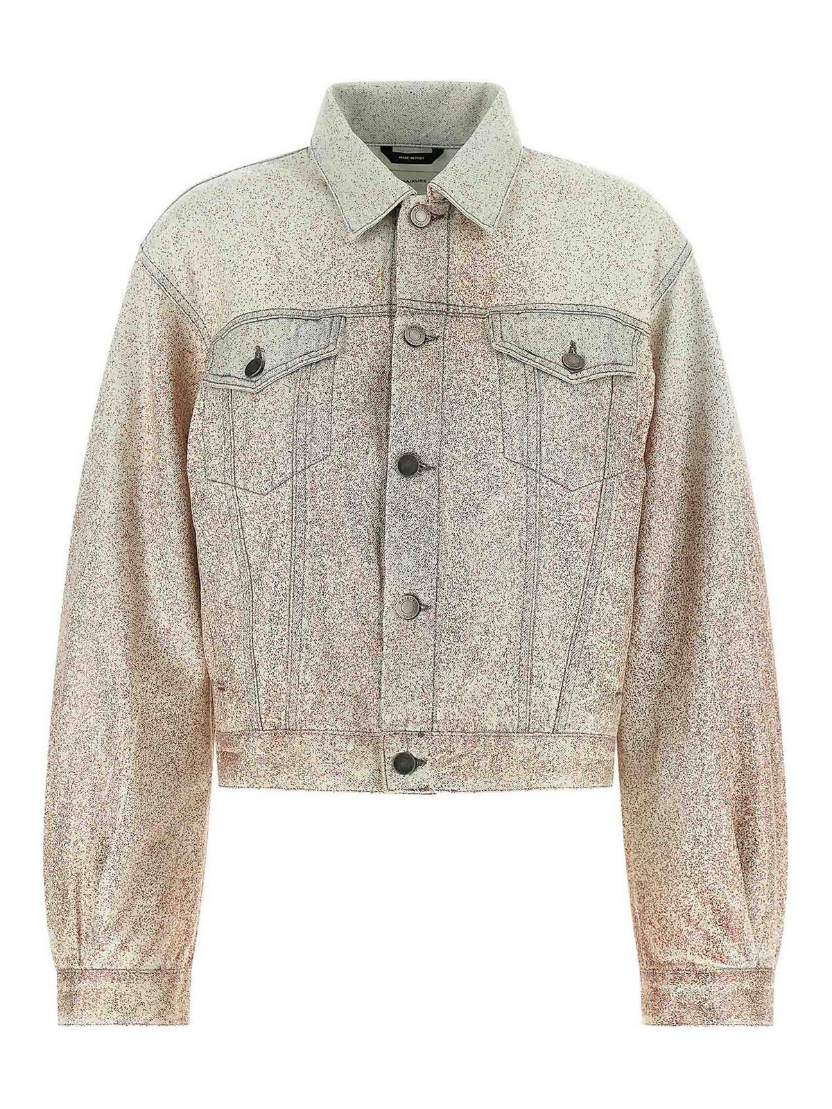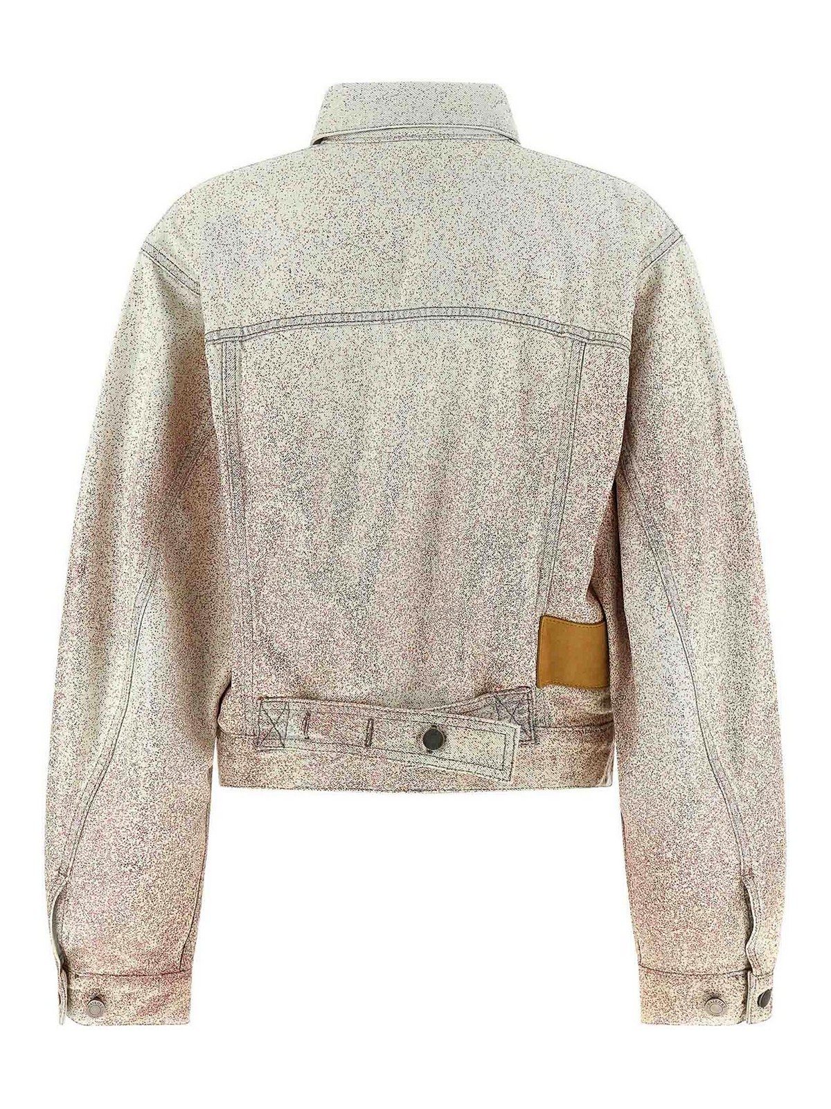 Giubbotto Simon' in denim di cotone con glitter multicolor all over, cuciture a contrasto, colletto a camicia, chiusura frontale con bottoni, tasche, maniche lunghe ampie con polsini e spalle scese, cinturino in pelle e targhetta logo posteriore. poiché i glitter vengono applicati a mano, aderiranno al capo in modo diverso, rendendo ogni capo unico.