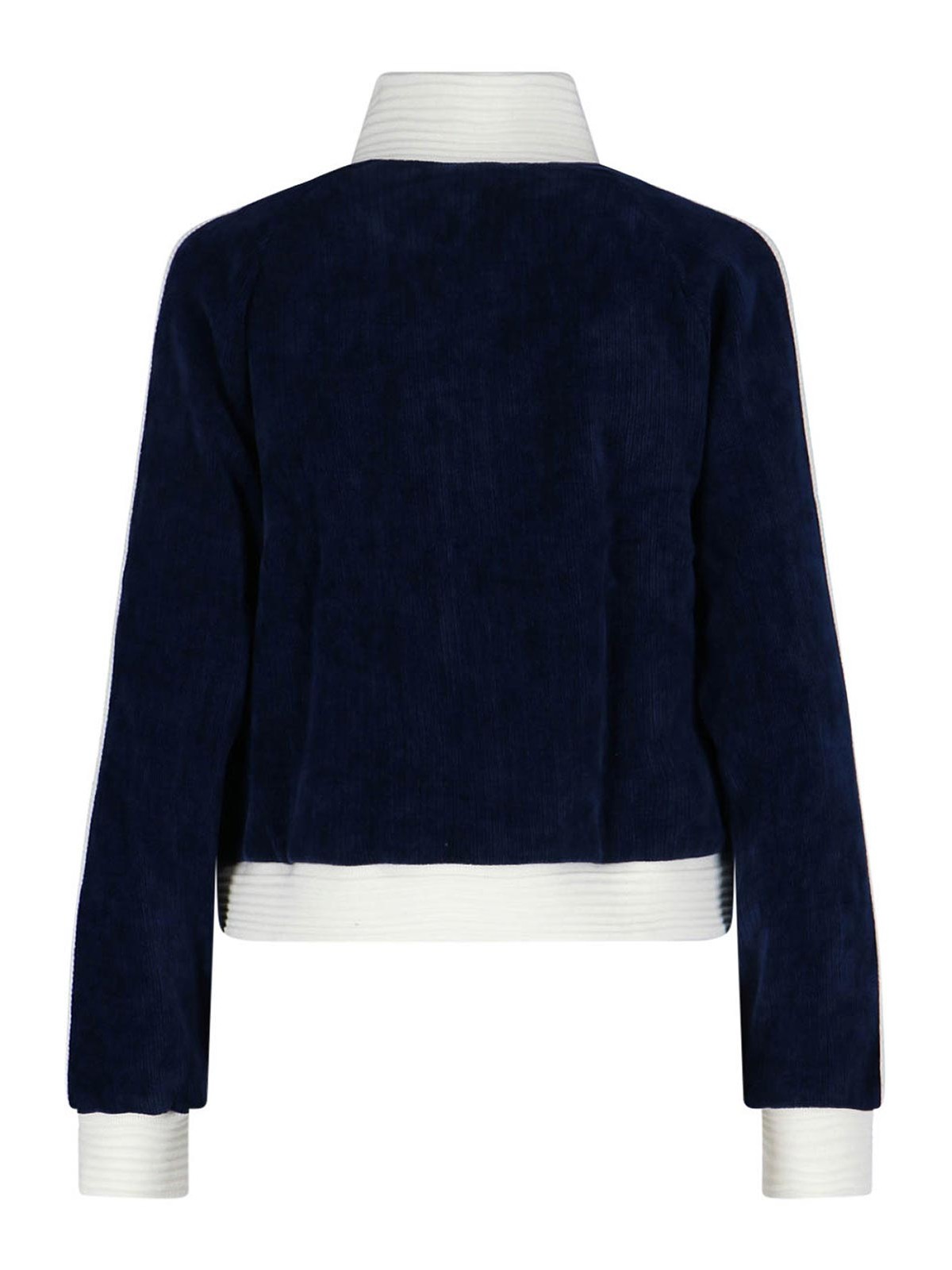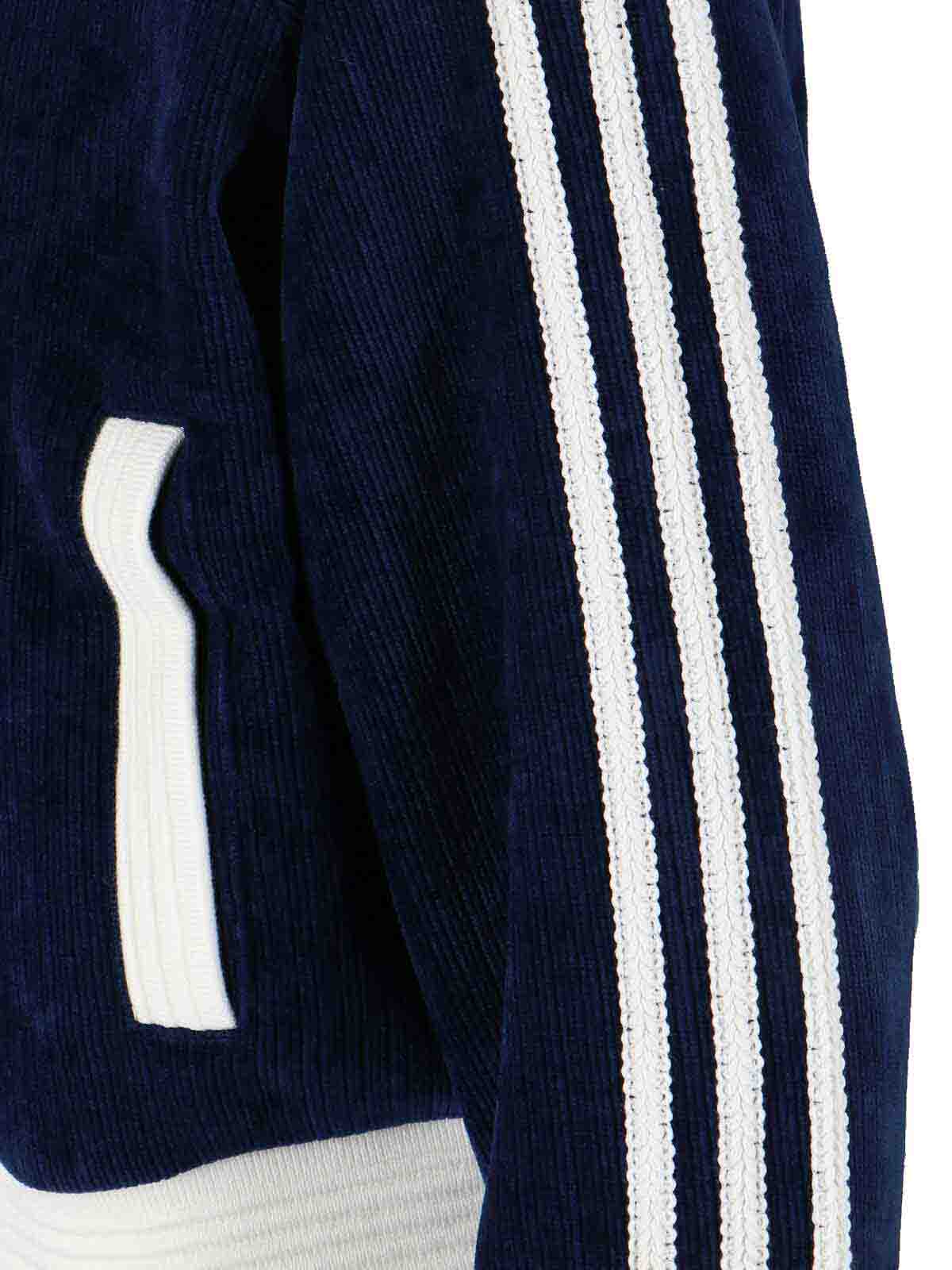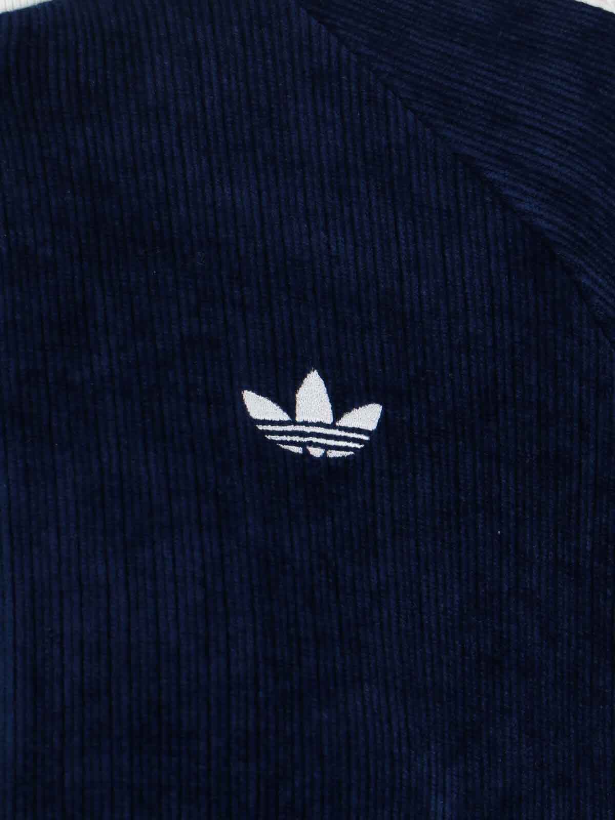 Giacca sportiva adidas in tessuto velour blu, tonalit scura, collo alto, chiusura zip contrasto, ricamo logo