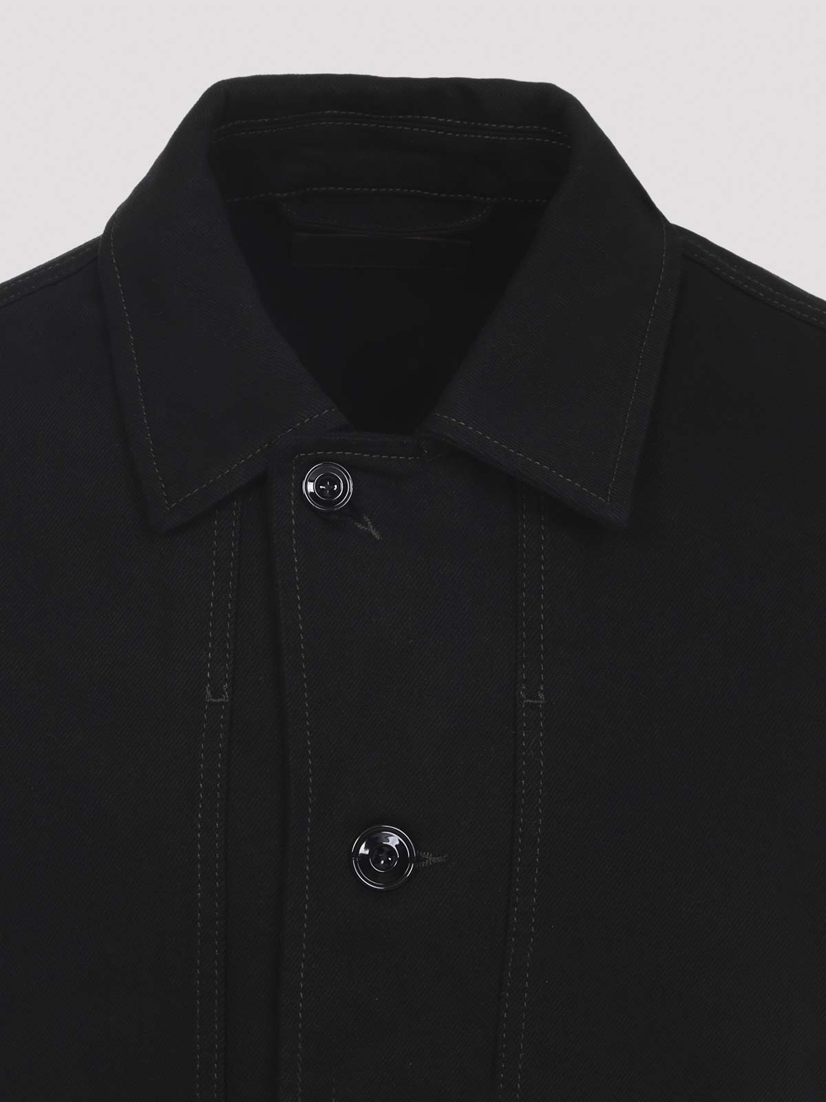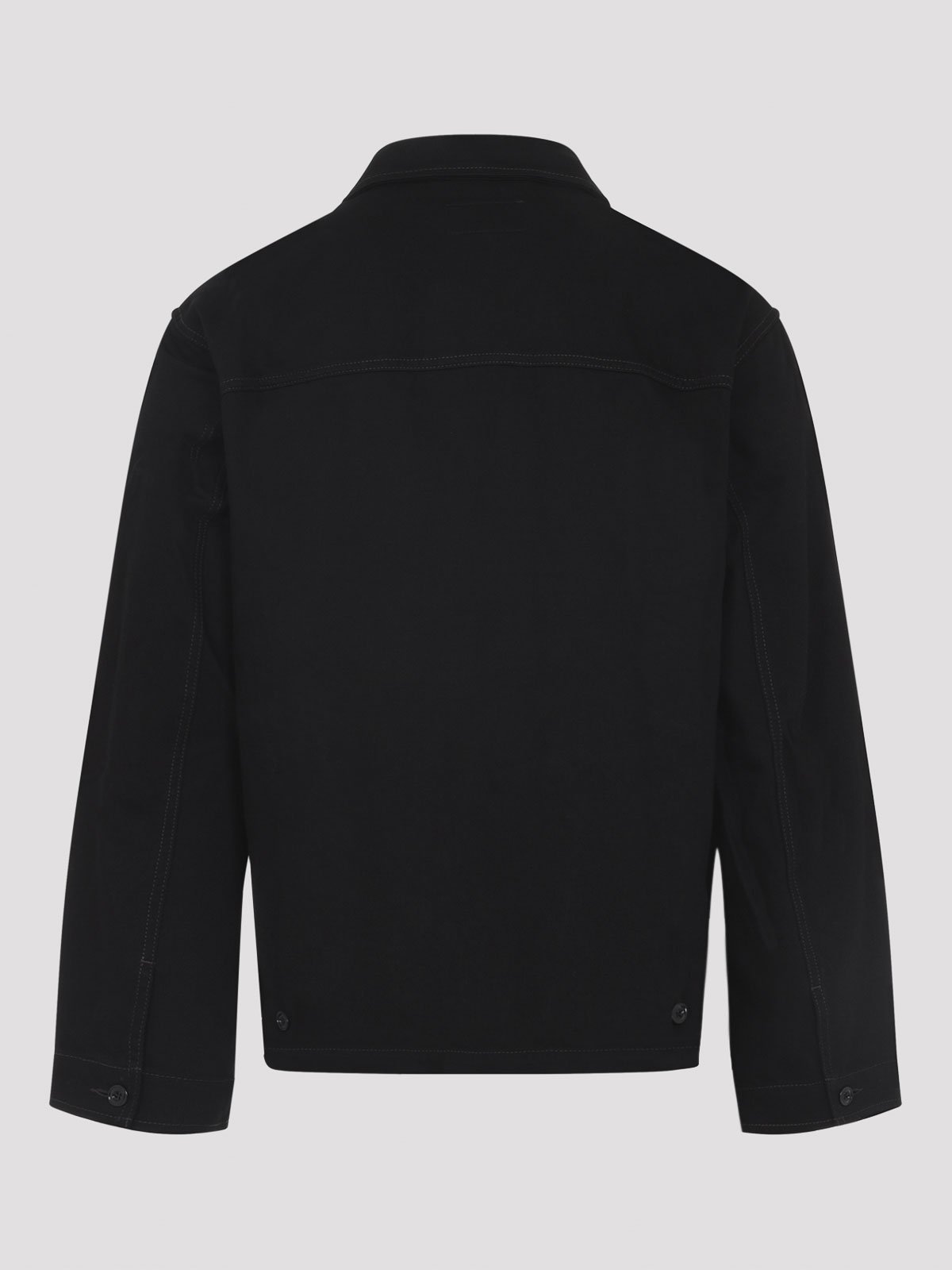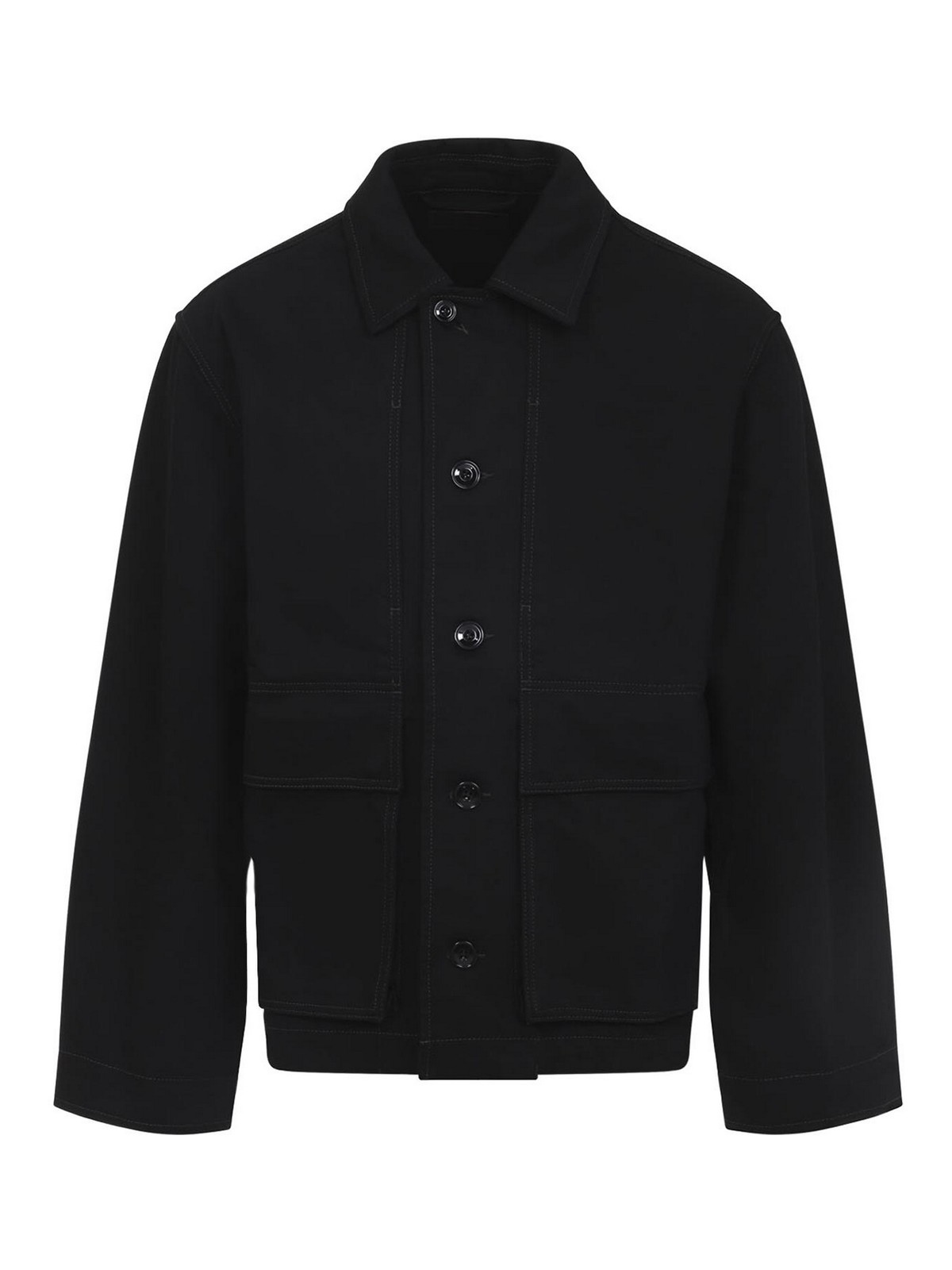 Giacca boxy Lemaire in cotone nero. Giacca in puro cotone nero, colletto a punta, chiusura frontale con bottoni, tasche laterali con patta, maniche lunghe, polsini con bottoni, fondo dritto.