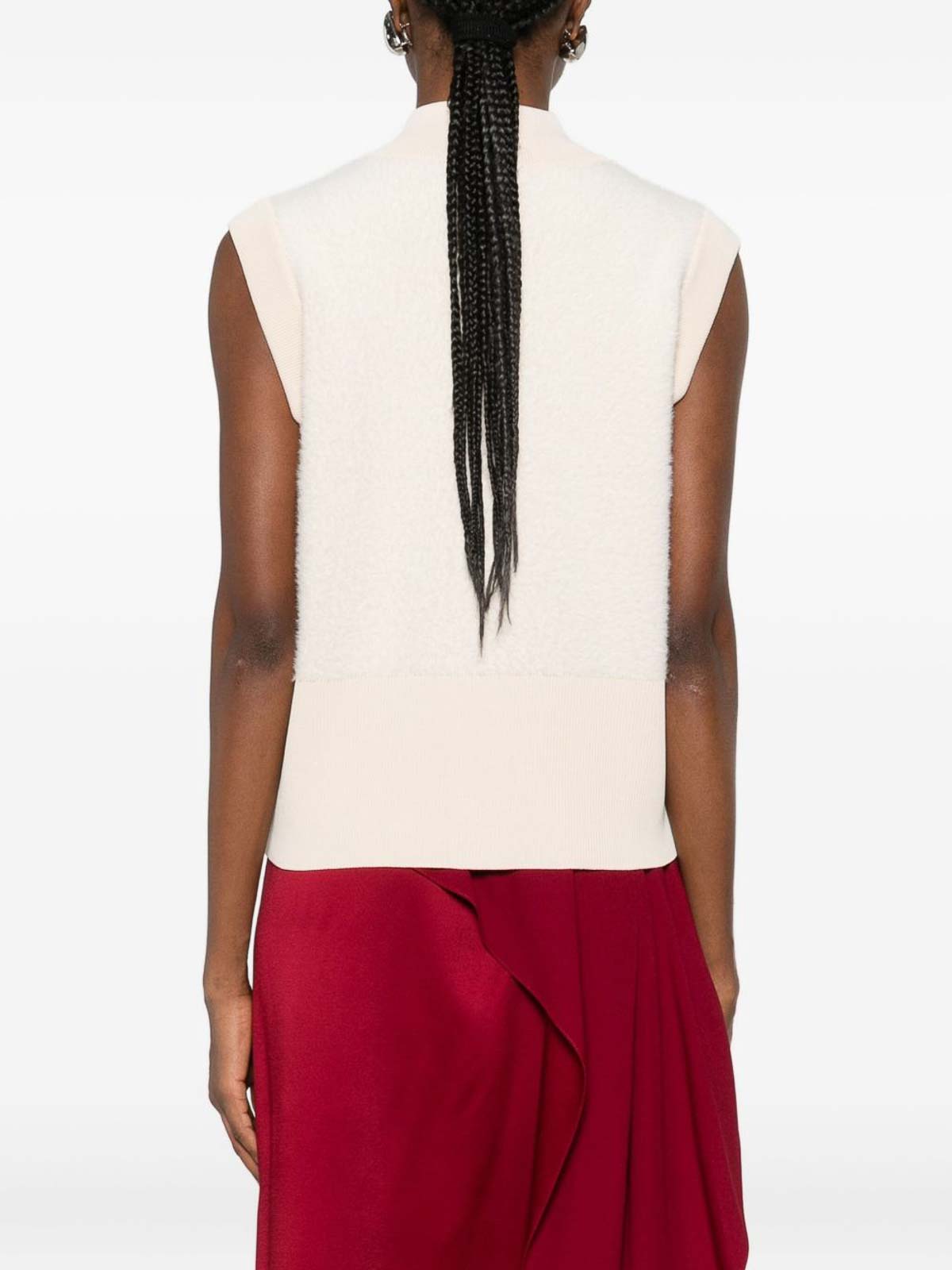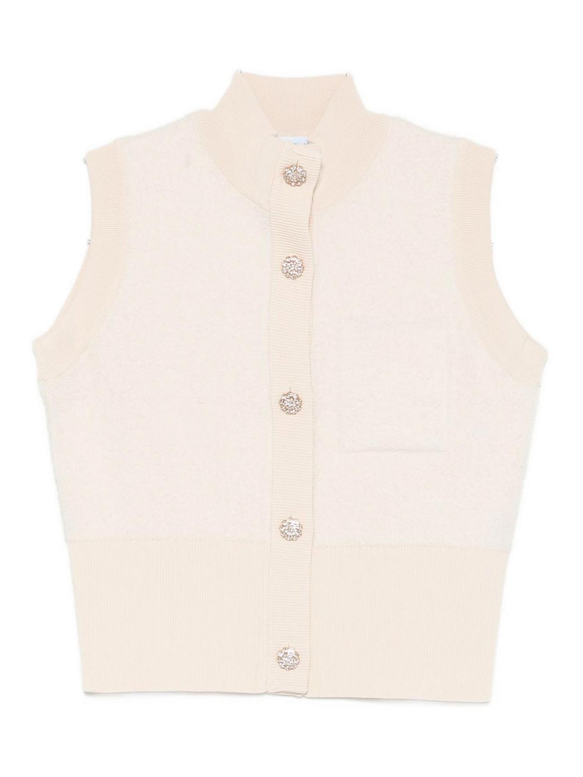 Gilet senza maniche ecru di blugirl caratterizzato da un bottone a collo alto e orlo a coste per una vestibilità comoda e sartoriale. Alta qualità, questo gilet combina stile contemporaneo e funzionalità, ideale da sovrapporre a camicie, maglioni o top per un look versatile ed elegante, un pezzo essenziale per chi cerca eleganza minimale e comfort, perfetto per completare outfit casual-chic o sofisticati.