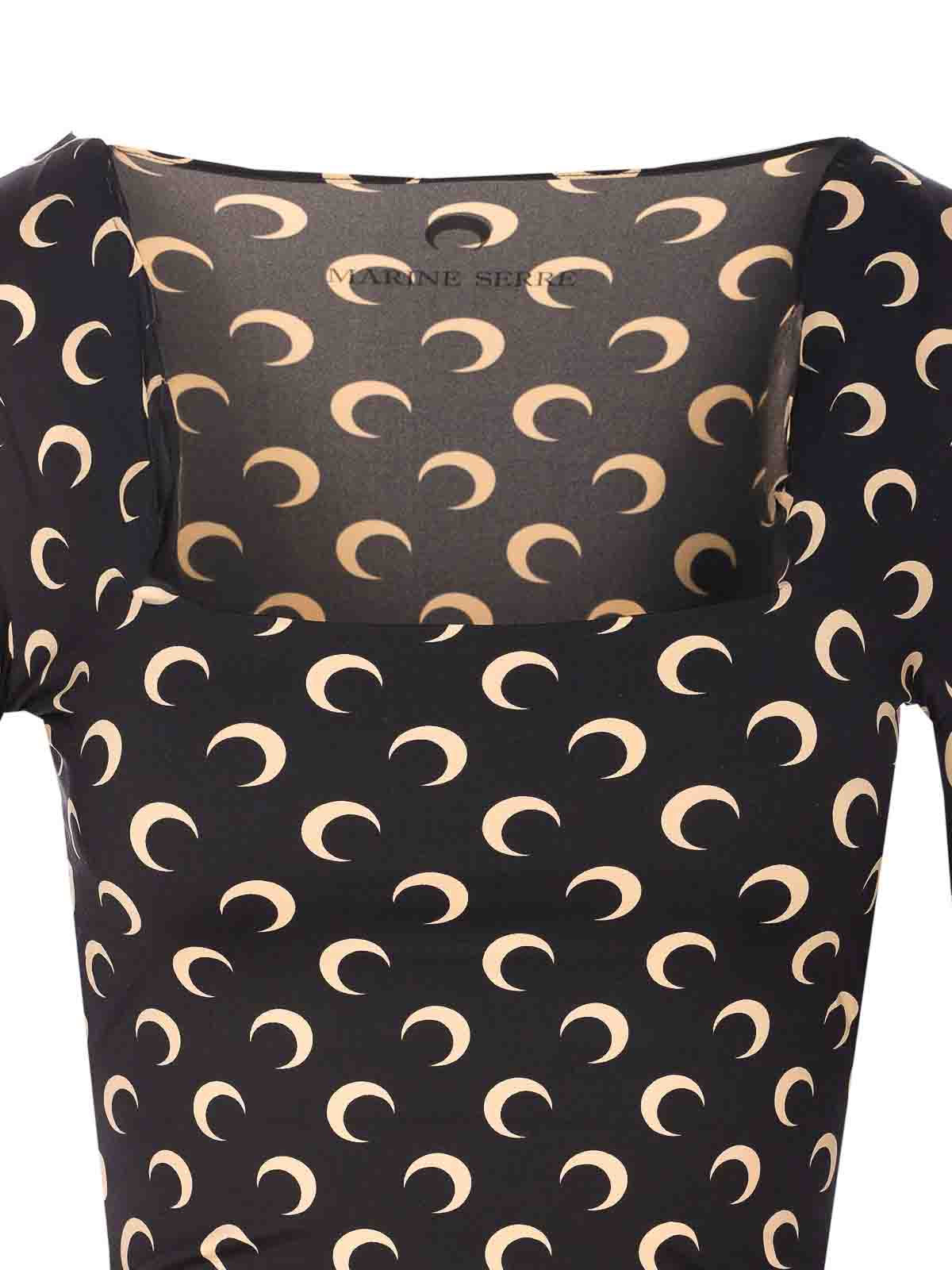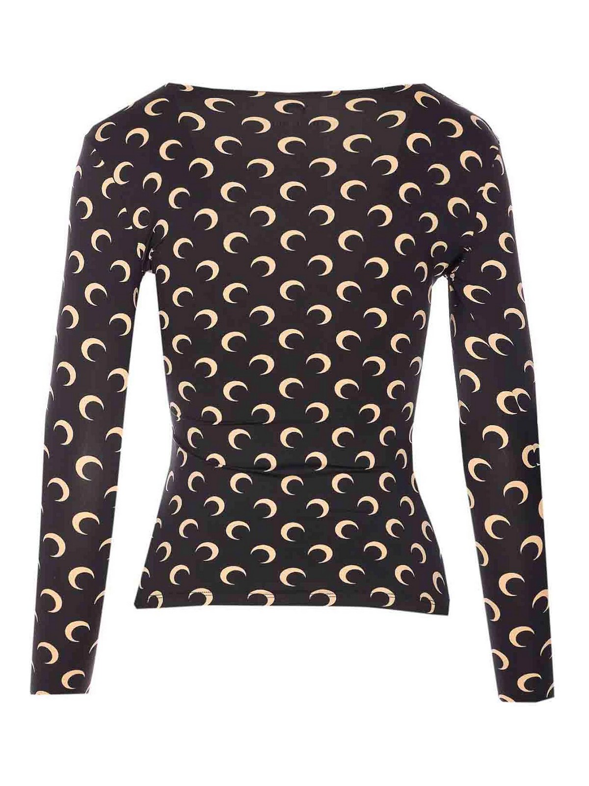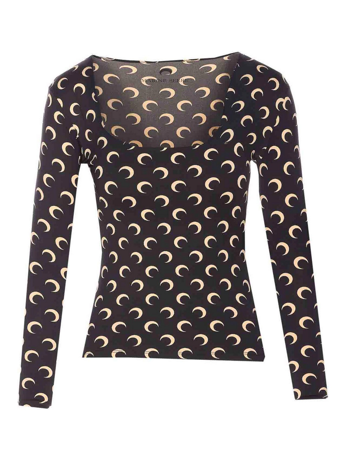 Top stampa Marine serre nero luna, ampio scollo squadrato, maniche lunghe, vestibilità elasticizzata e aderente