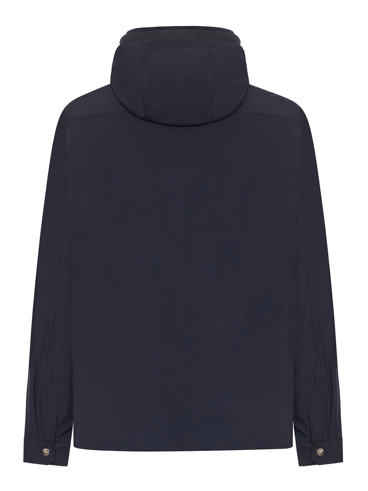 cappuccio fisso con coulisse regolabile, chiusura frontale con bottoni a pressione, tasche applicate al petto con pattine e bottoni, tasche inserite ai fianchi, polsini regolabili con bottoni, fondo dritto, tessuto tecnico liscio dalla mano ferma, leggermente imbottito, vestibilità regolare, colore: blu