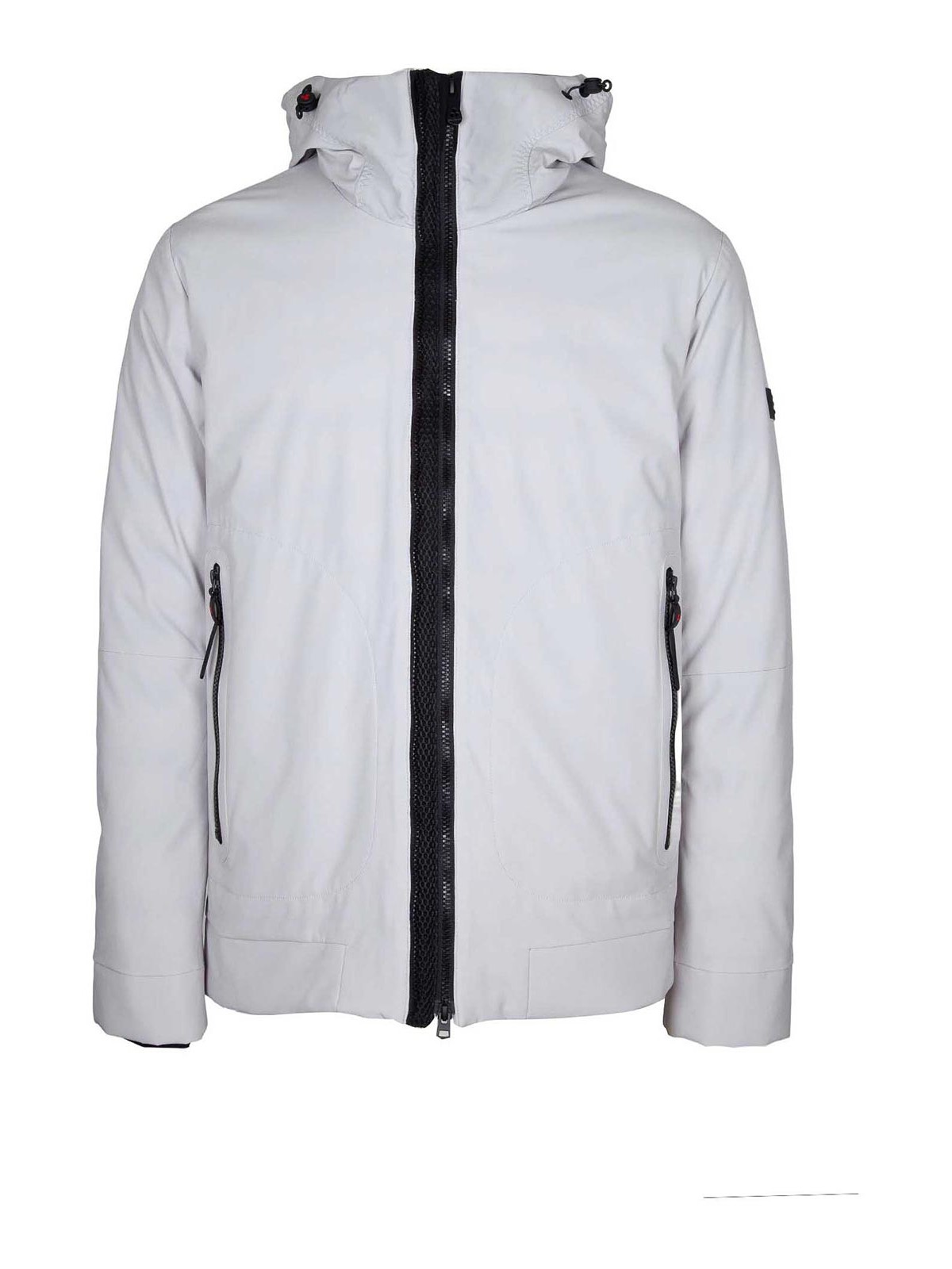 Giubbotto corto in tela di stretch accoppiata a chiaro in thermoplume cappuccio fisso con tiranti regolabili polsini antivento in maglina nera doppia zip centrale polsini antivento in maglina nera trattamento idrorepellente pfc free vestibilita' regolare