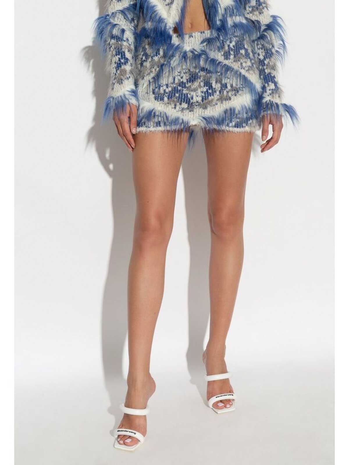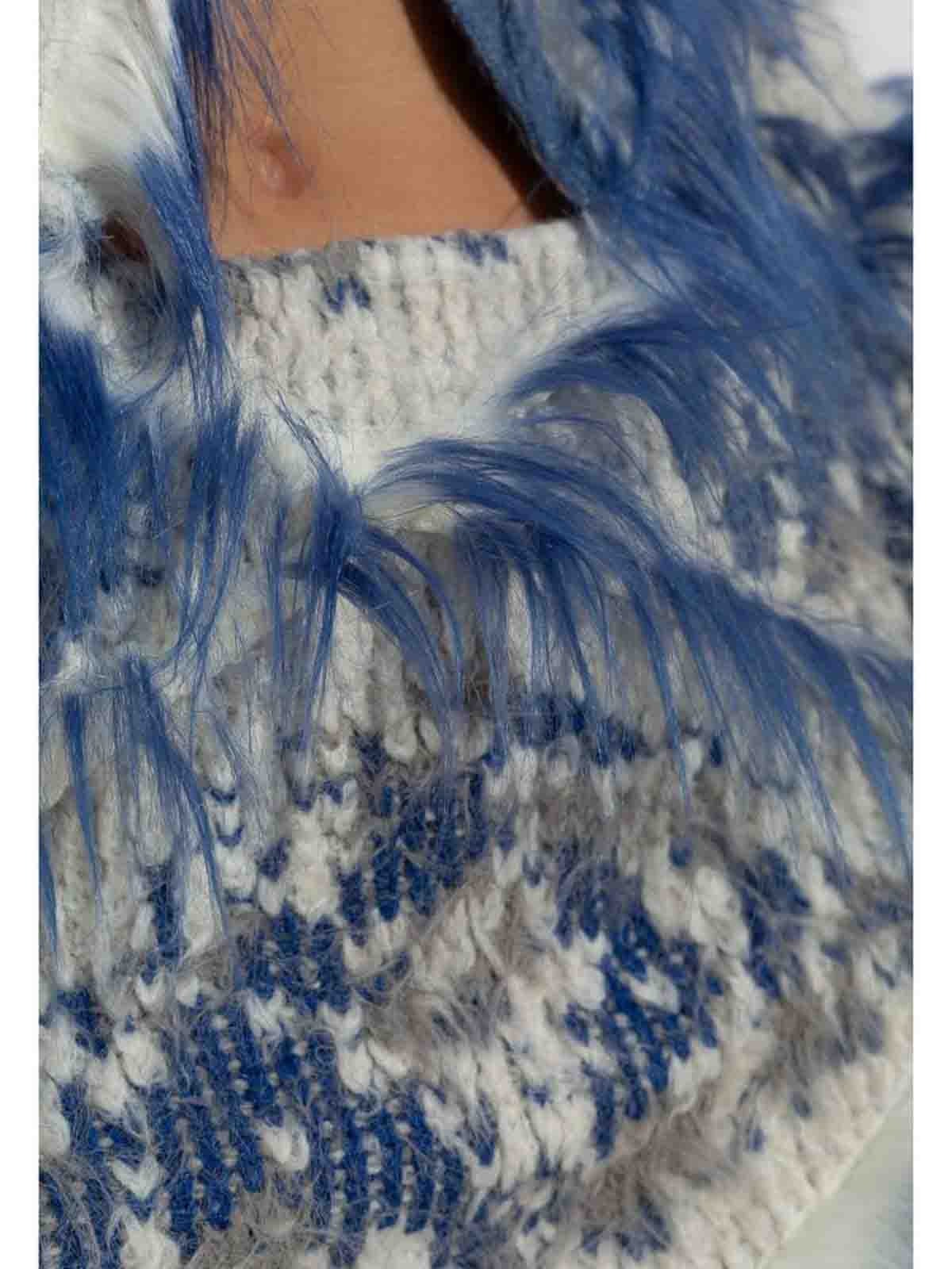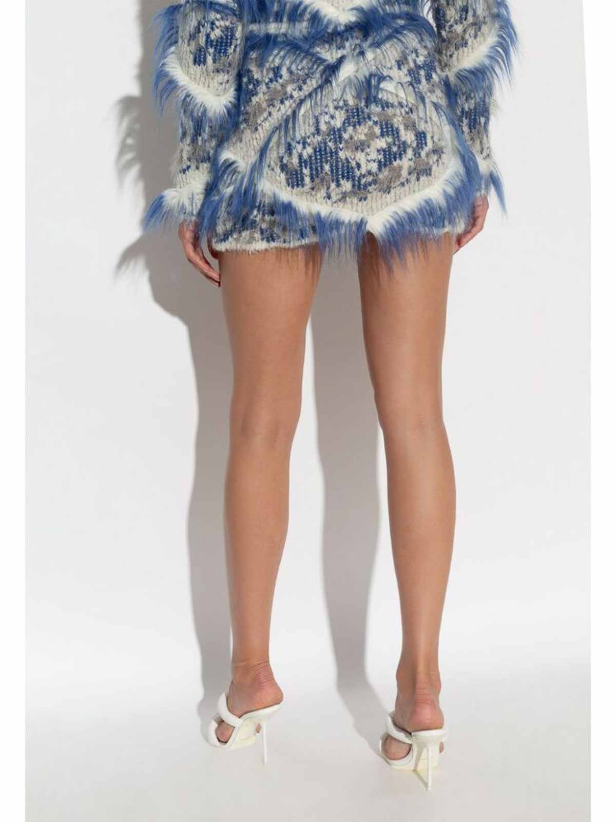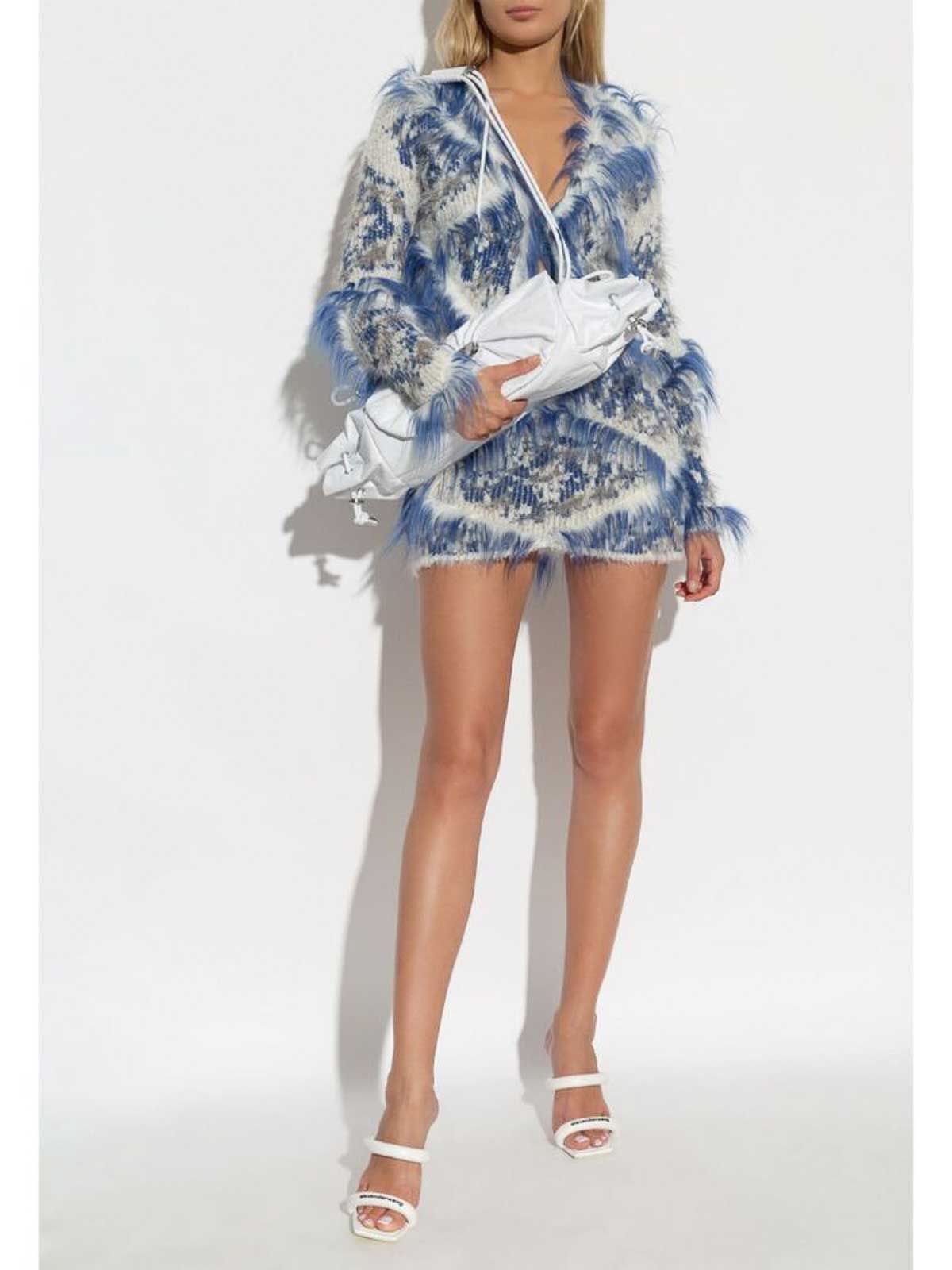 Costruzione a maglia blu indaco con dettagli sfilacciati e orlo dritto stampato con motivo astratto