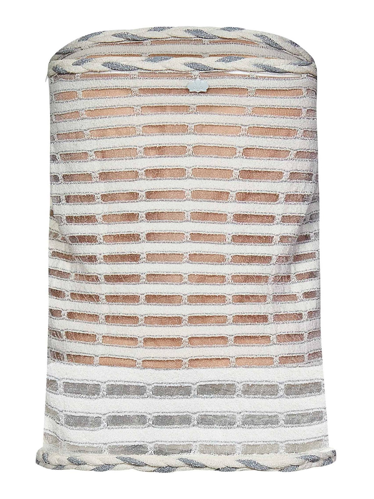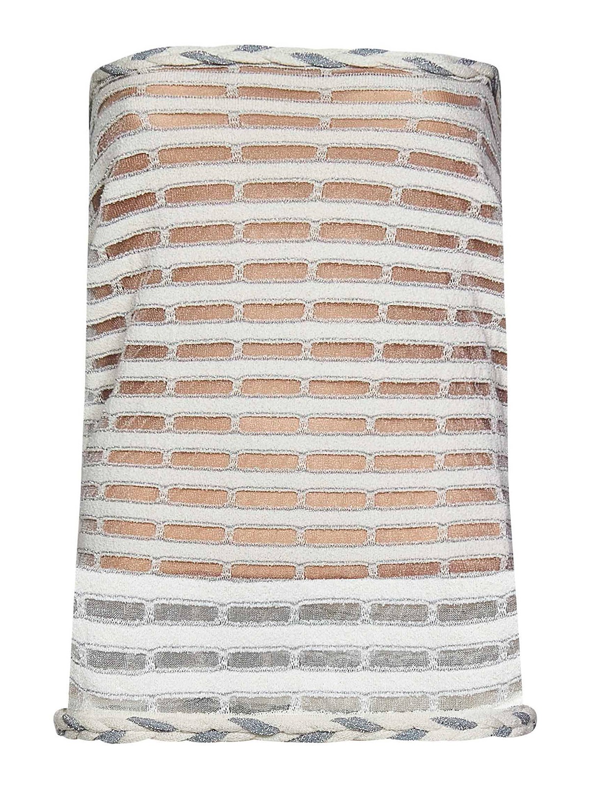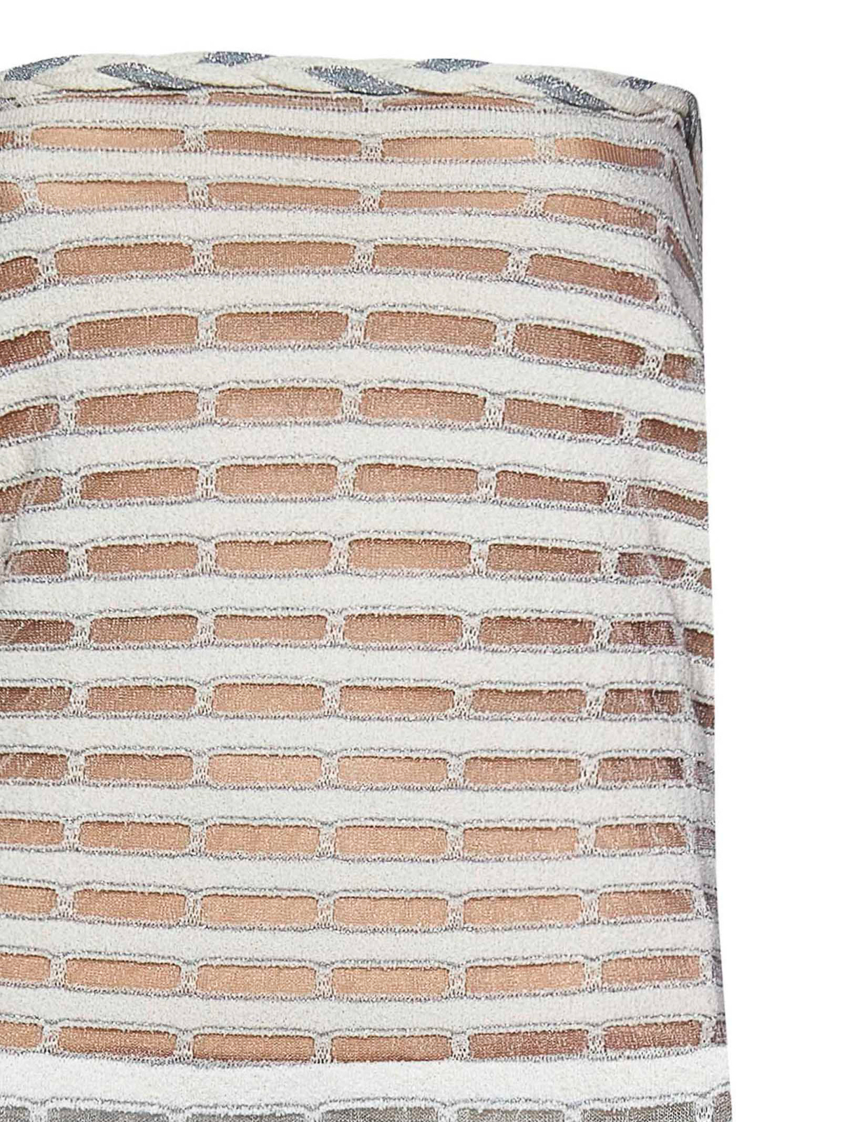 Chiusura laterale con zip a scomparsa Dettaglio ritorto in lamella bianca e argento in vita Targhetta logo sul retro Dettaglio ritorto in lamella bianca e argento al fondo Maglia traforata con fili di lamè argento all over filo crepe alternato a un filo di nylon che dona trasparenza al disegno nude- fodera colorata slim fit bianco cotone 30% poliammide fodera 100% poliammide made in italy l'articolo in foto corrisponde ad una it