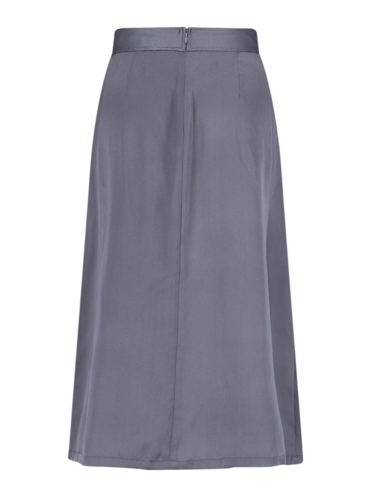 Gonna in seta aspesi, grigi, vita media elasticizzata, chiusura zip retro, dettaglio balze laterale, orlo dritto.