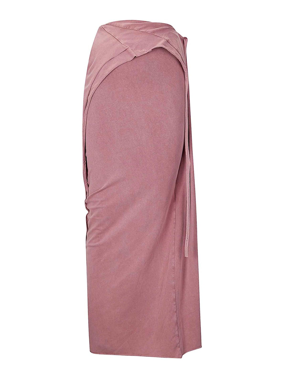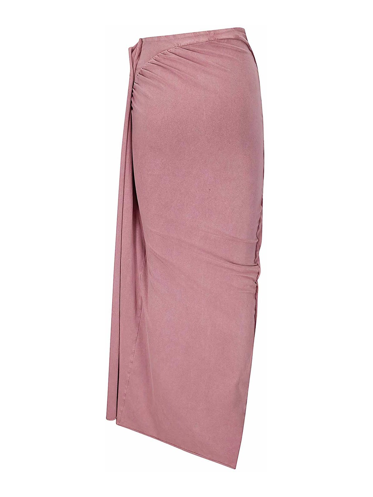 Gonna lunga rosa con spacchi, costruzione a pannelli asimmetrici, bordo grezzo in vita e orlo ripiegati, arricciatura sulla cintura posteriore.