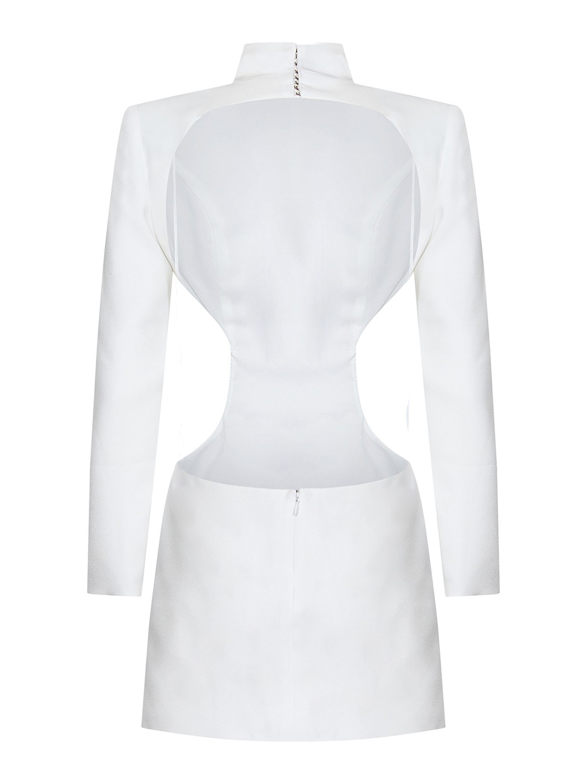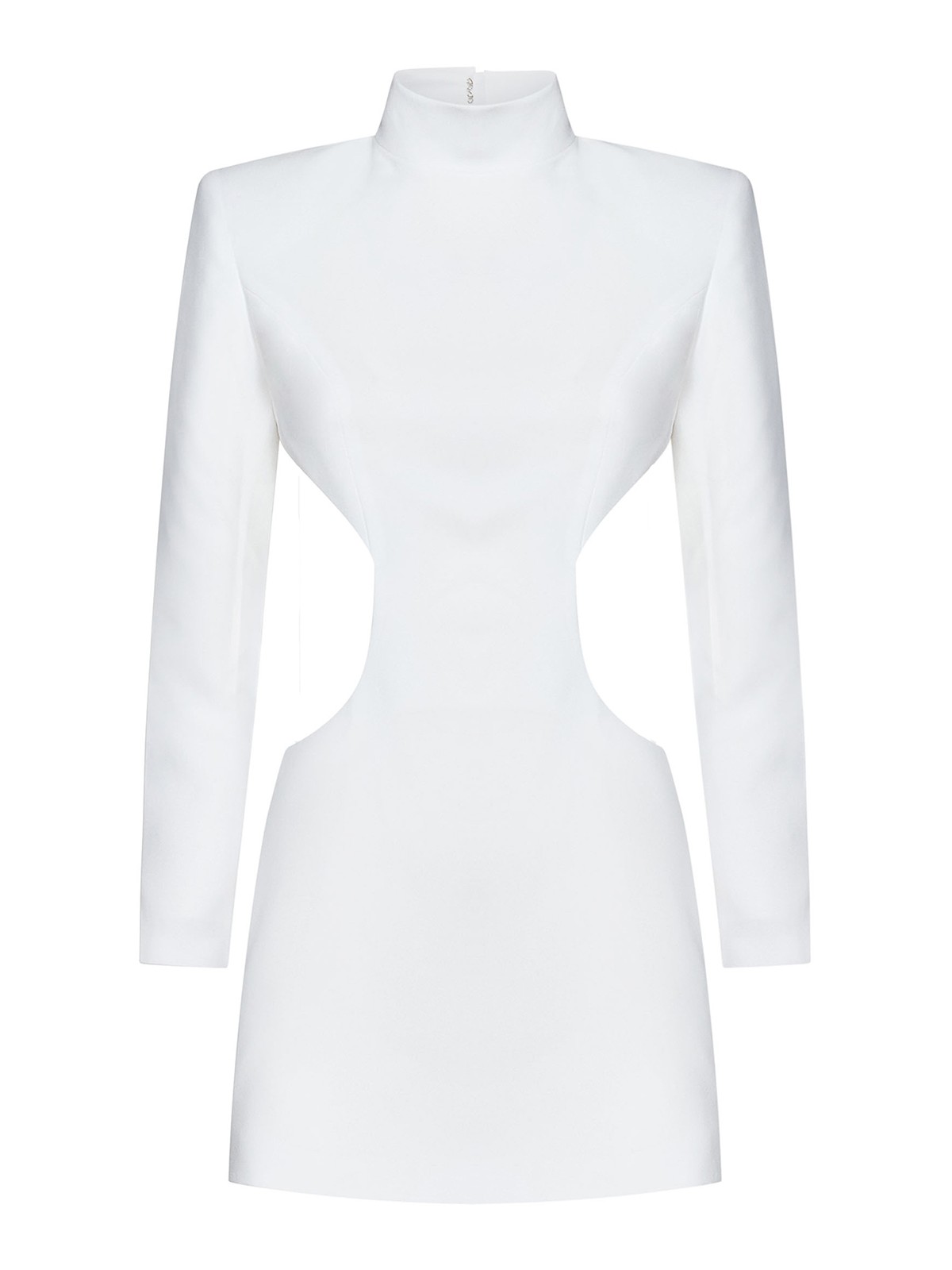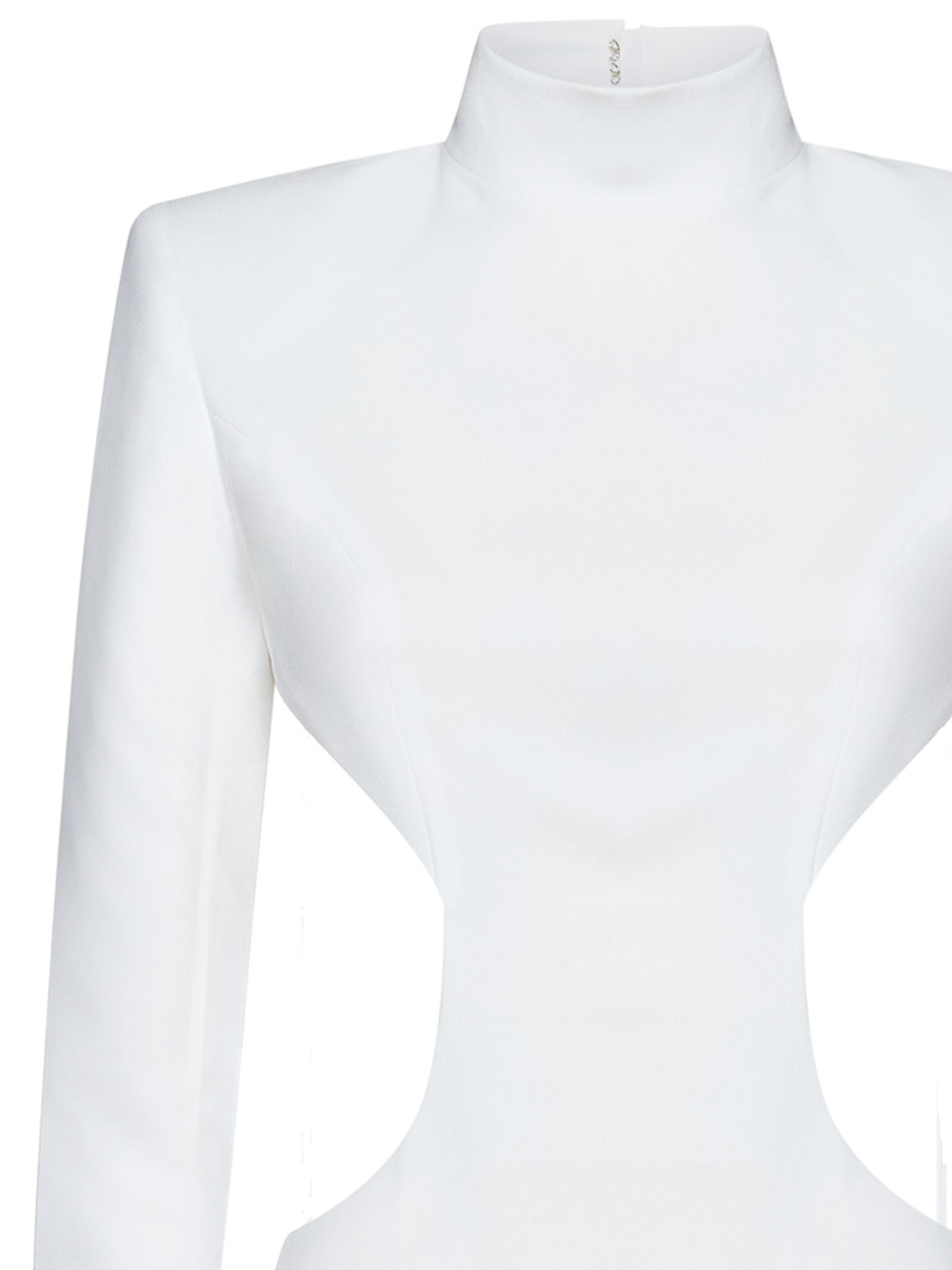 chiusura posteriore con zip nascosta sulla gonna chiusura con gancetto nascosta sul retro del collo collo alto maniche lunghe spalle larghe spalline spalline cut-out in vita vestibilità aderente senza schienale poliestere bianco l'articolo in foto corrisponde a una taglia US
