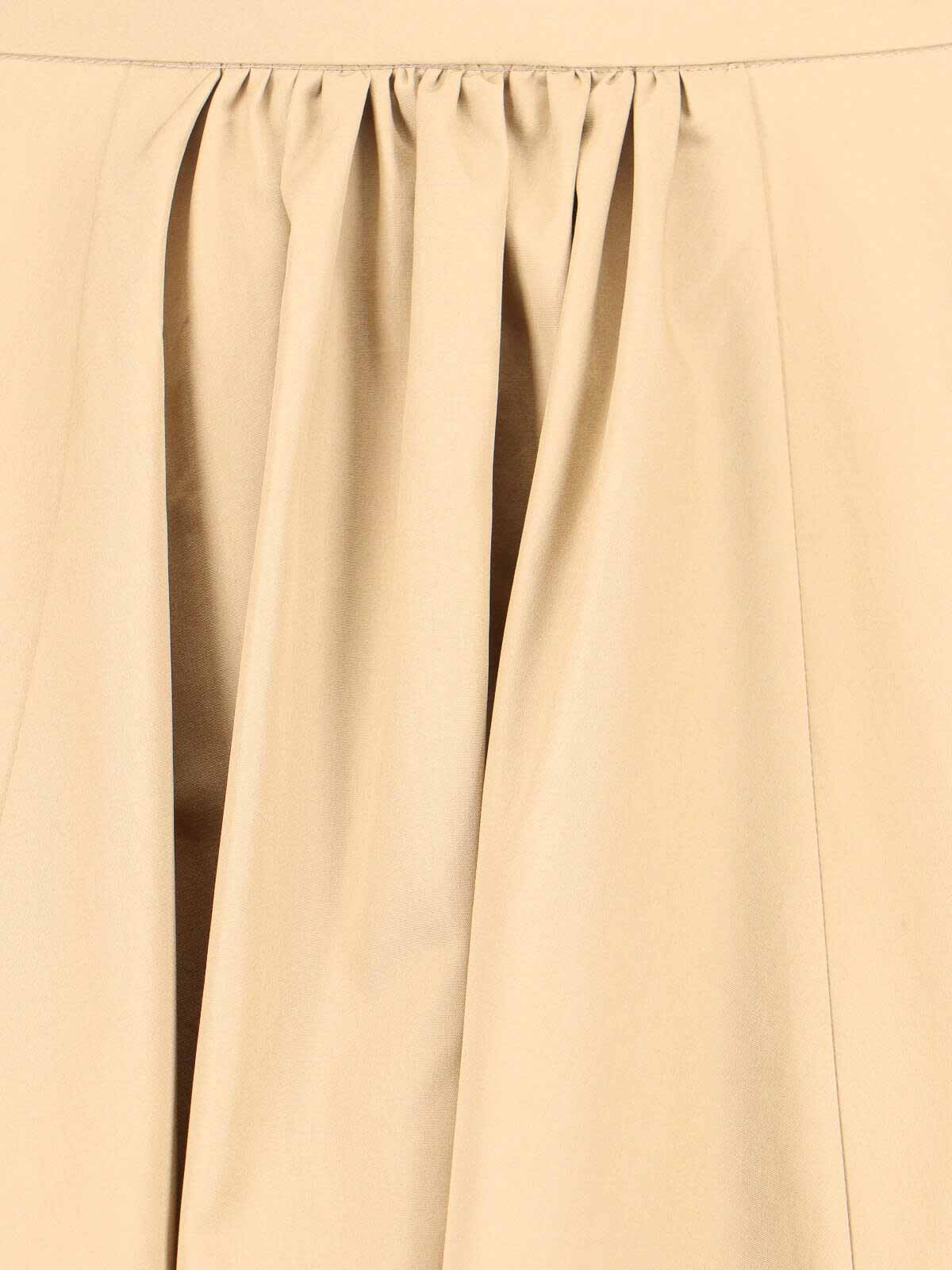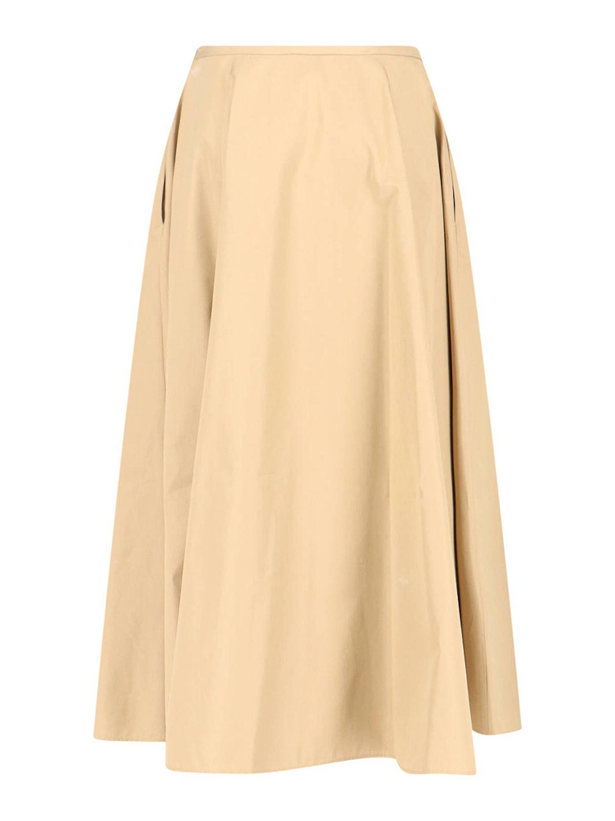 Gonna midi aspesi in cotone beige, design arricciato, vita media, chiusura zip laterale, orlo dritto.