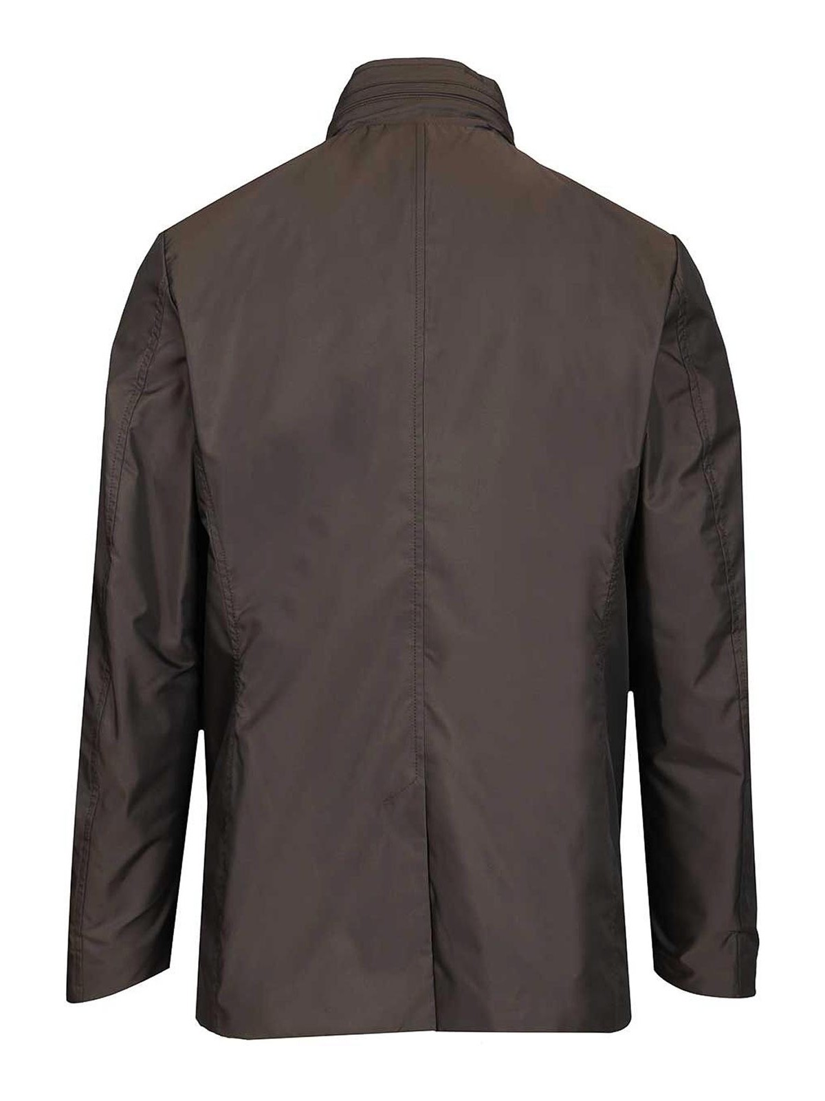 Tecnico memory con finitura leggera cappuccio removibile nascosto nel collo doppio con zip a doppio cursore e asola con bottoni tasche laterali a filetto spacco centrale posteriore