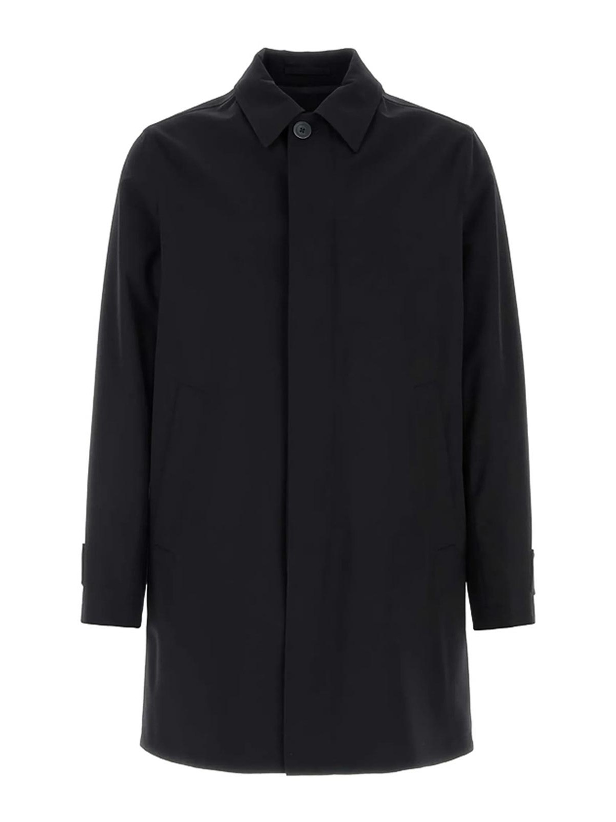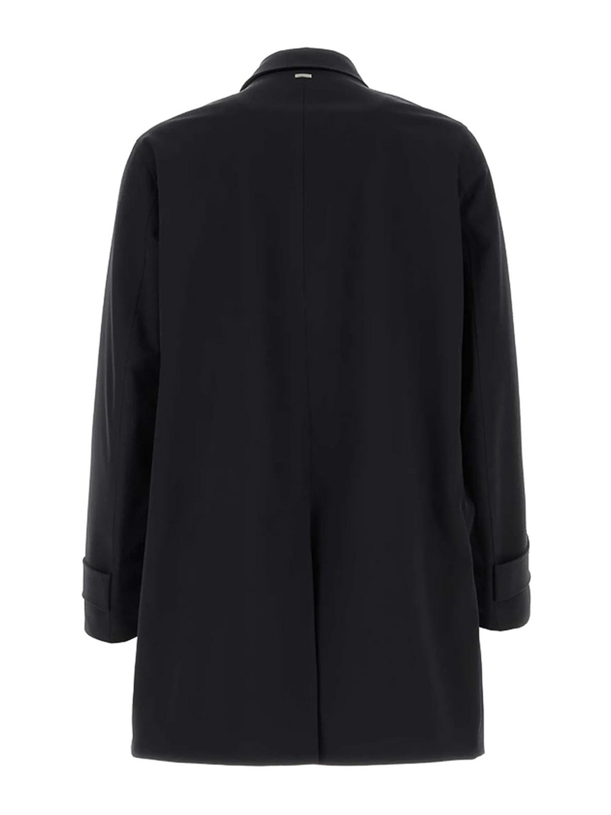Chiusura con bottoni blu, colletto classico, maniche lunghe, due tasche laterali, orlo dritto