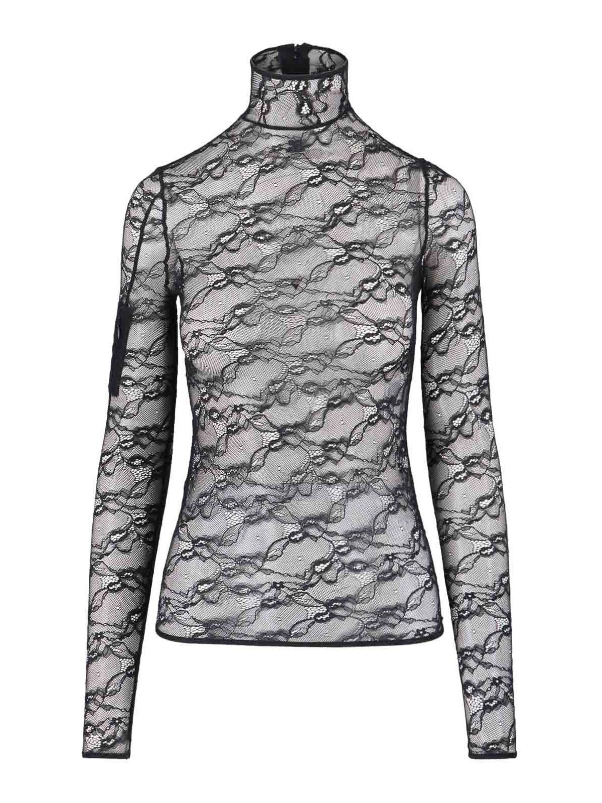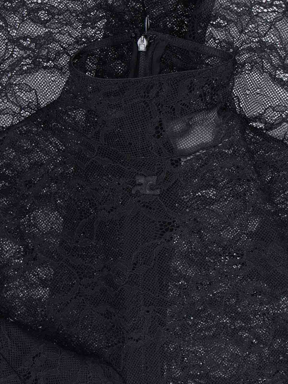 Top in pizzo courrges, nero, collo alto, ricamo logo tono su tono fronte, chiusura zip retro, una tasca zip laterale, orlo dritto.