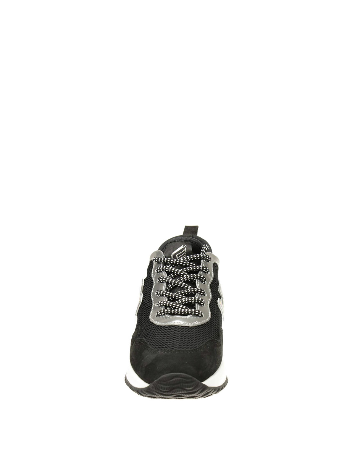 Sneaker in lycra e suede. Inserti in pelle laminata. H laterale applicata. Rialzo interno, suola alta sagomata in gomma. Etichetta logo su linguetta. Logo a rilievo sul tallone.