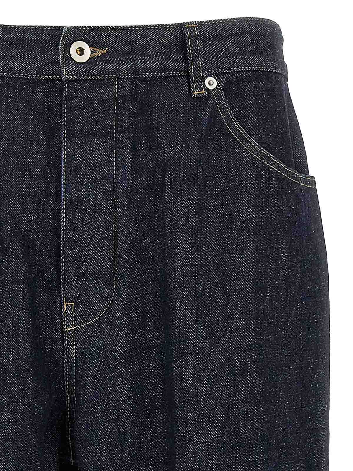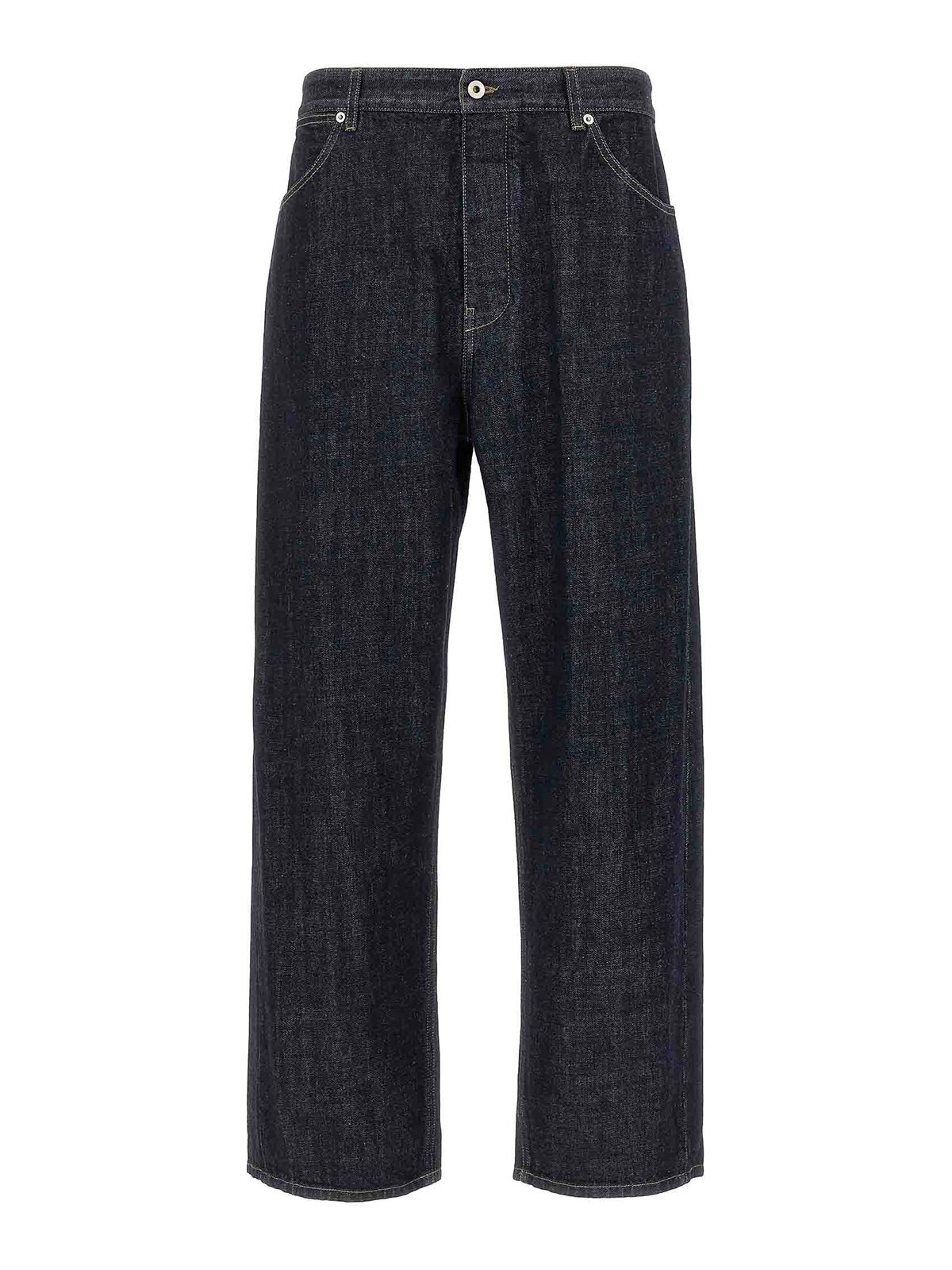 Jeans in denim diagonale pesante con cuciture un pulsante di gamba larga leggermente bassa con cinque tasche ed etichetta logo sul retro