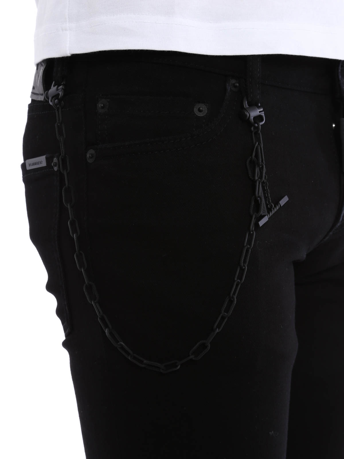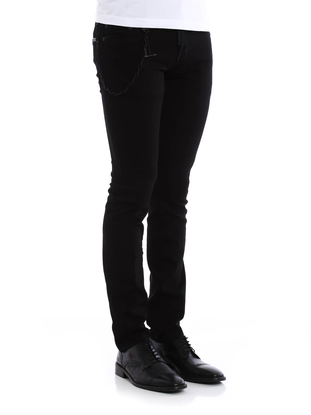Jeans cinque tasche in misto cotone elasticizzato a vita bassa e con chiusura con bottoni, patch logo in pelle dietro, dettaglio catena removibile in metallo tono su tono sul lato destro. Fondo di 16 cm.