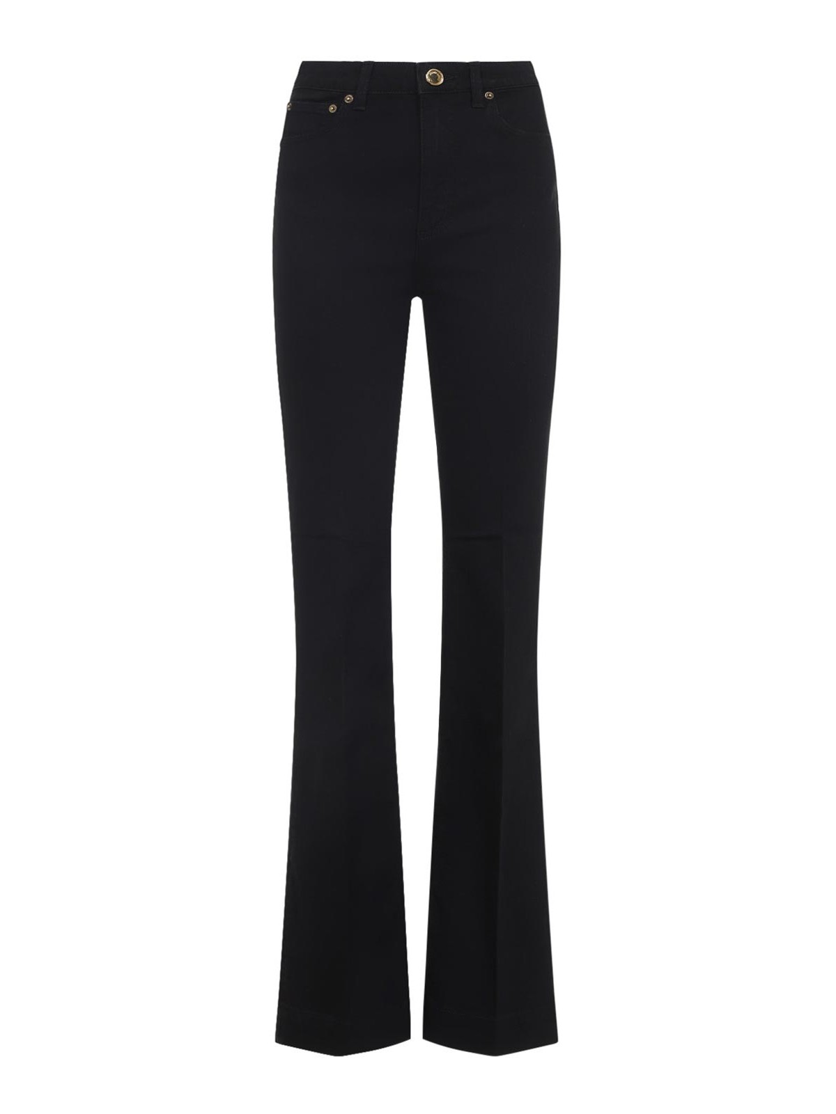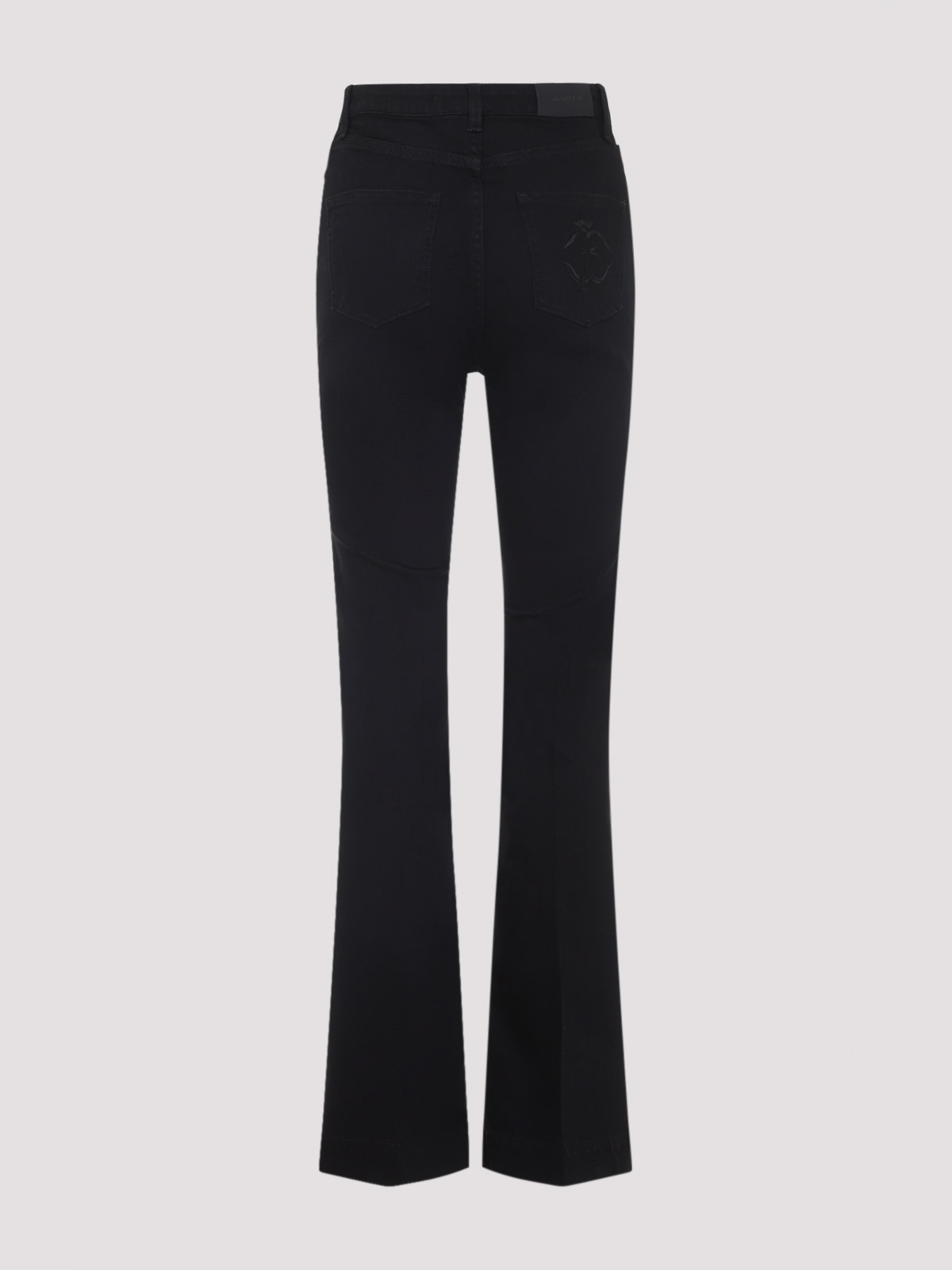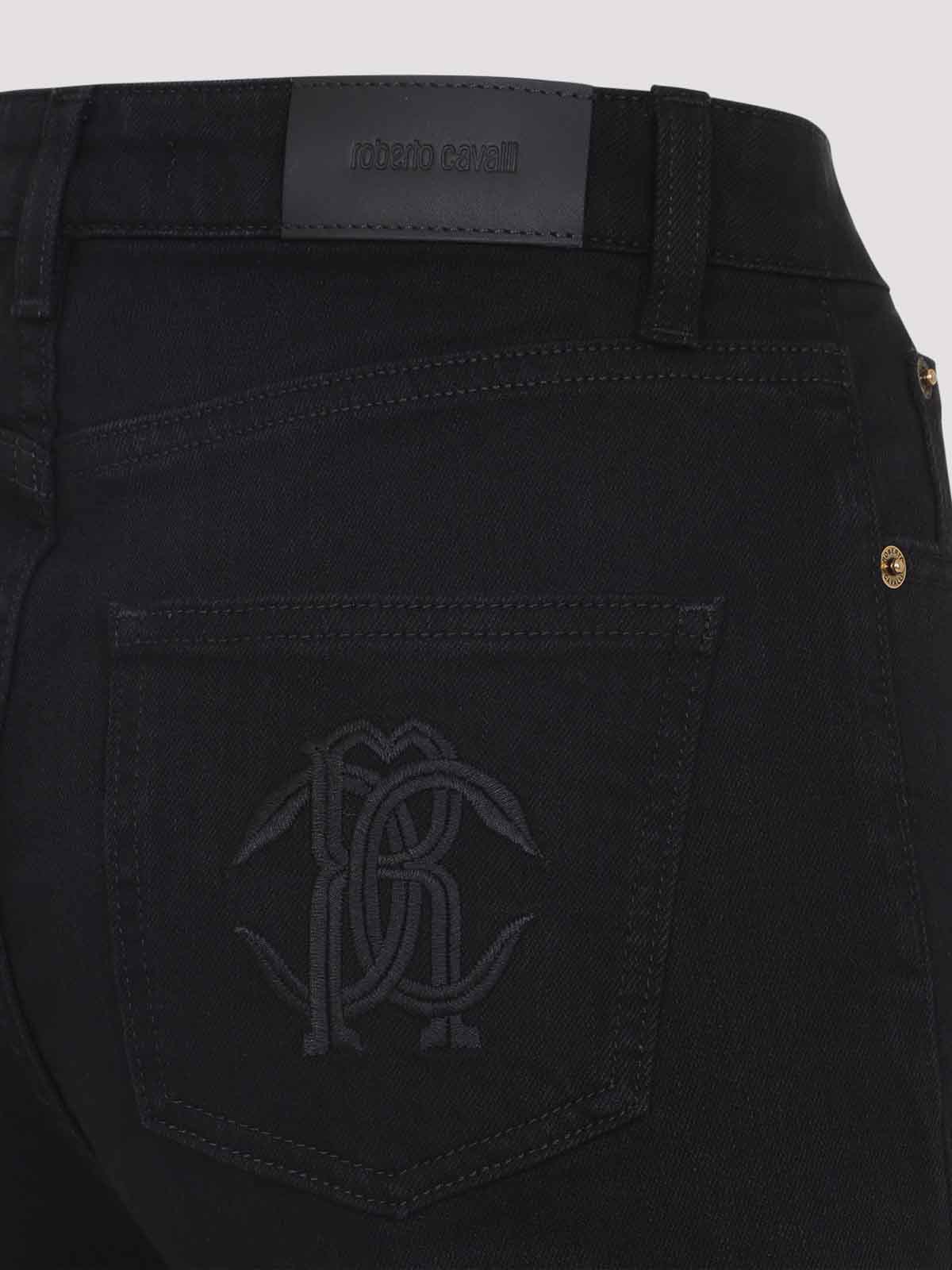 Roberto Cavalli jeans neri realizzati in denim tratto nero, pulsante in vita alta costruzione tascabile e volare, anelli con zip Snake specchio monogramma Snake sulla gamba dritta posteriore leggermente svasato
