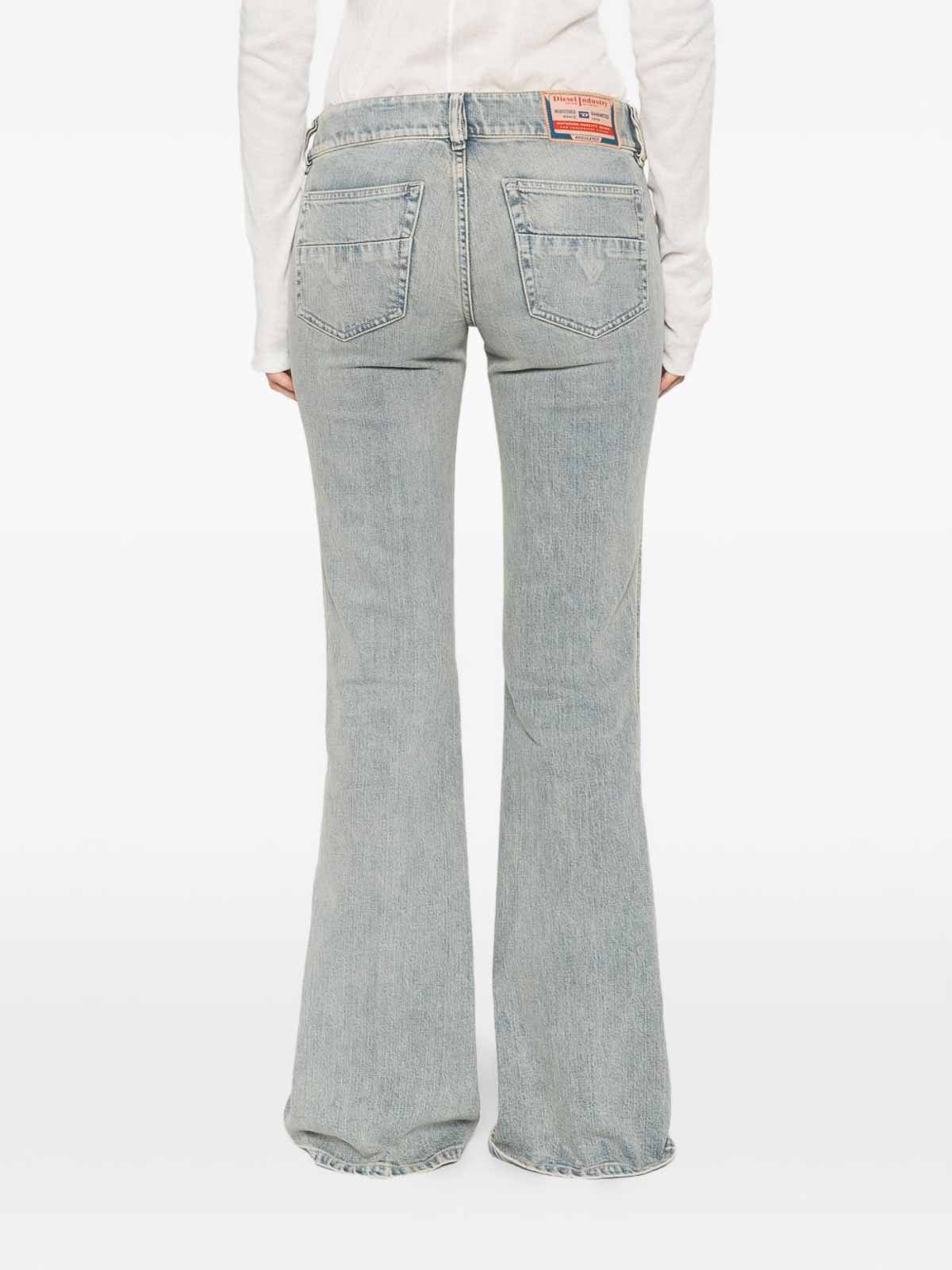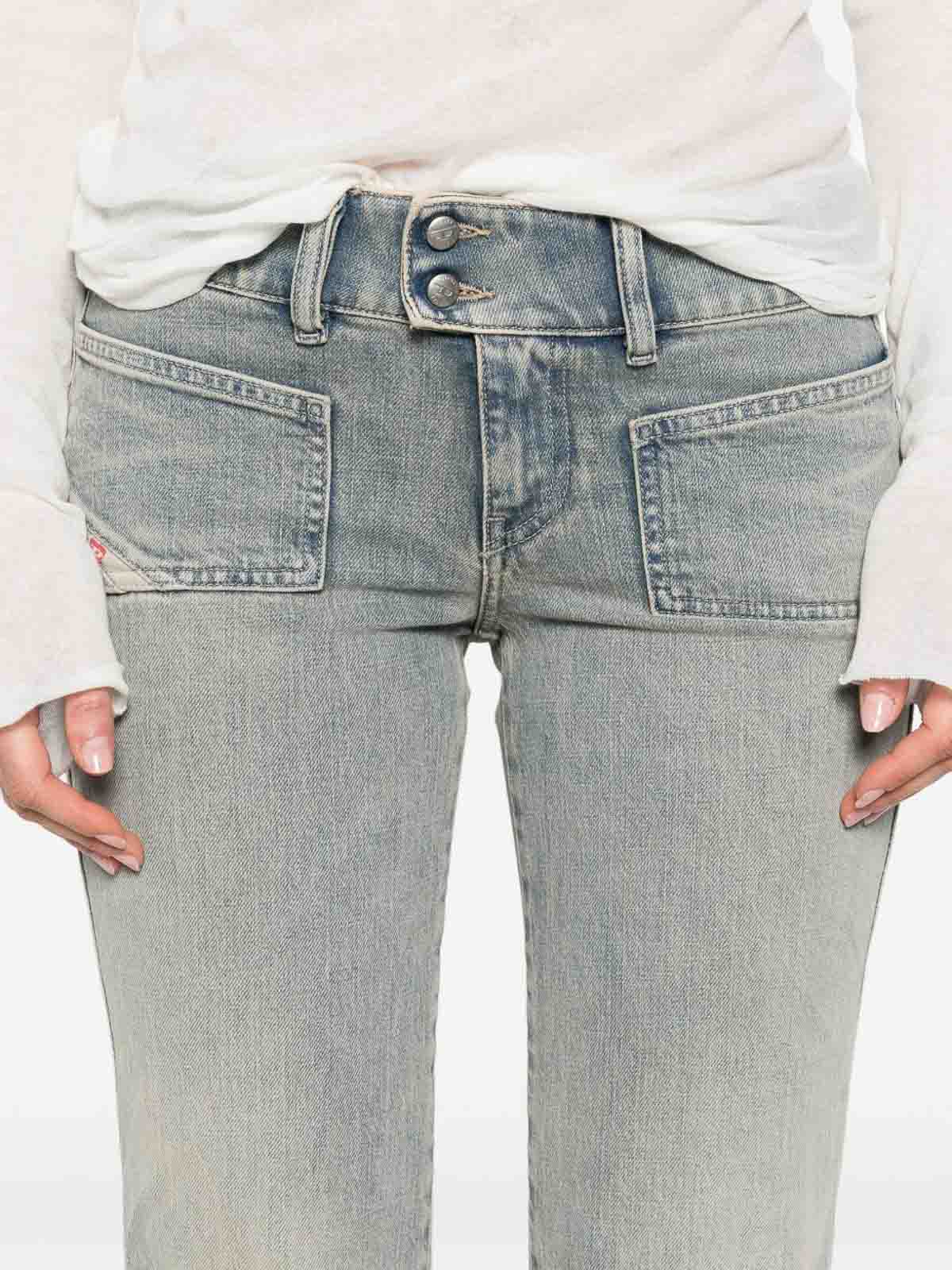 Due tasche blu applicate con passanti per cintura e bottone superiore
