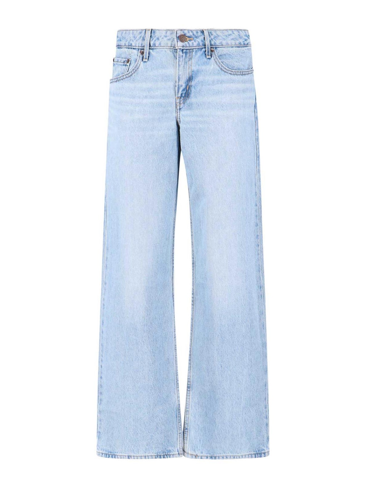 Jeans dritti levi's strauss, in denim azzuro, lavaggio usured, vita bassa, passanti cintura, chiusura bottone e zip, design a cinque tasche, patch logo retro, gamba dritta.