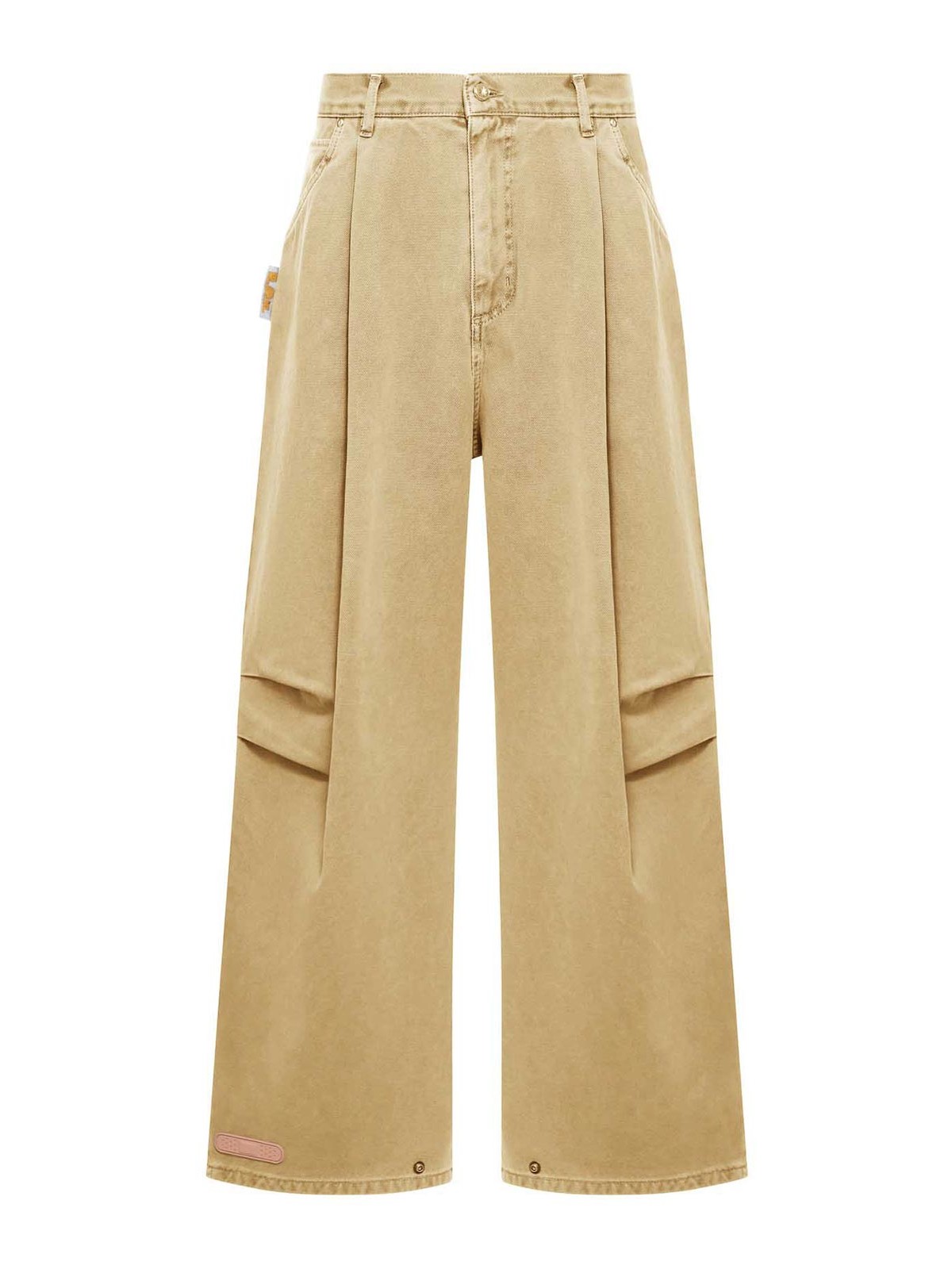 Passanti per cintura in vita, zip e bottone, piega cucita lungo la gamba, tasche, toppa sul retro, tasche posteriori personalizzate, metalleria personalizzata su e retro, gamba dritta ampia, - colore beige