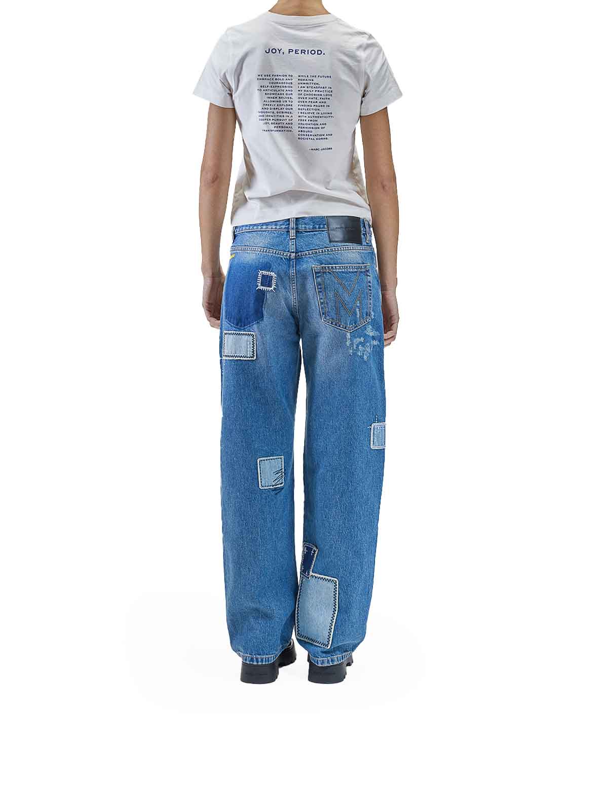 Patchwork straight jeans in jeans. jeans di mar jacobs dalla linea dritta e a vita bassa, caratterizzati da un lavaggi ovintage con toppe applicate sul davanti e sul retro. vita bassa, linea dritta, modello 5 tasche, applicazioni in toppe, chiusura zip e bottone.