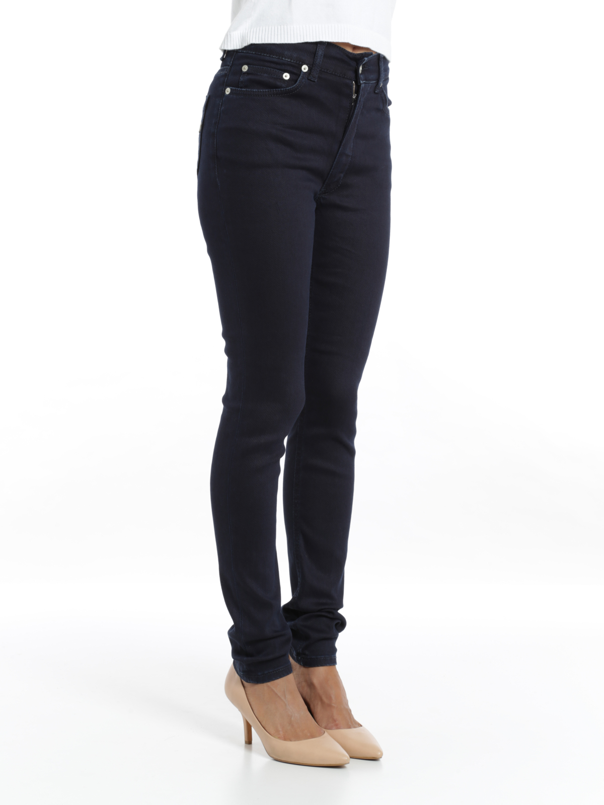 Jeans skinny con vita alta, chiusura con zip e bottone, cinque tasche, passanti in vita, impunture tono su tono, placca logo in metallo e patch logata in pelle sul retro.