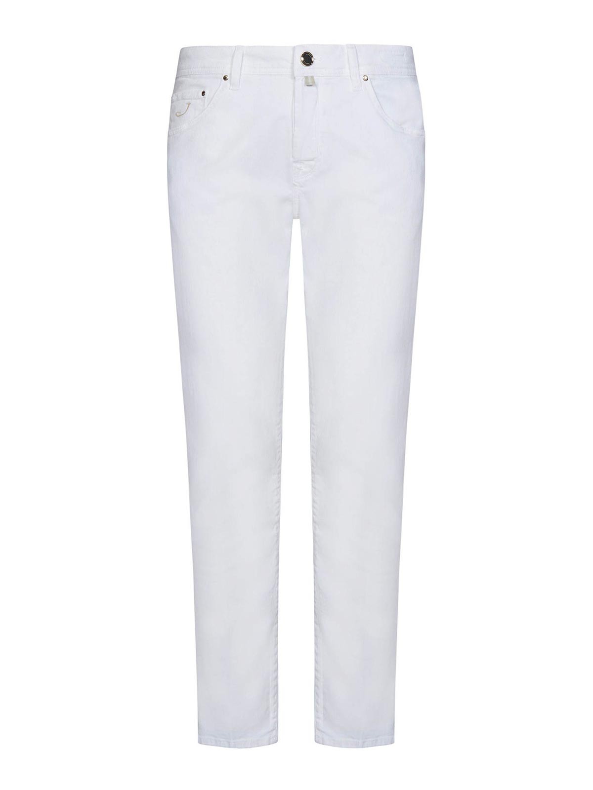 Vita nascosta con passanti per cintura modello cinque tasche logo ricamato a contrasto sul quinto taschino etichetta logo bianco panna cucita sul retro bandana logata beige nella tasca posteriore vestibilità  slim bianca l'articolo in foto corrisponde alla taglia