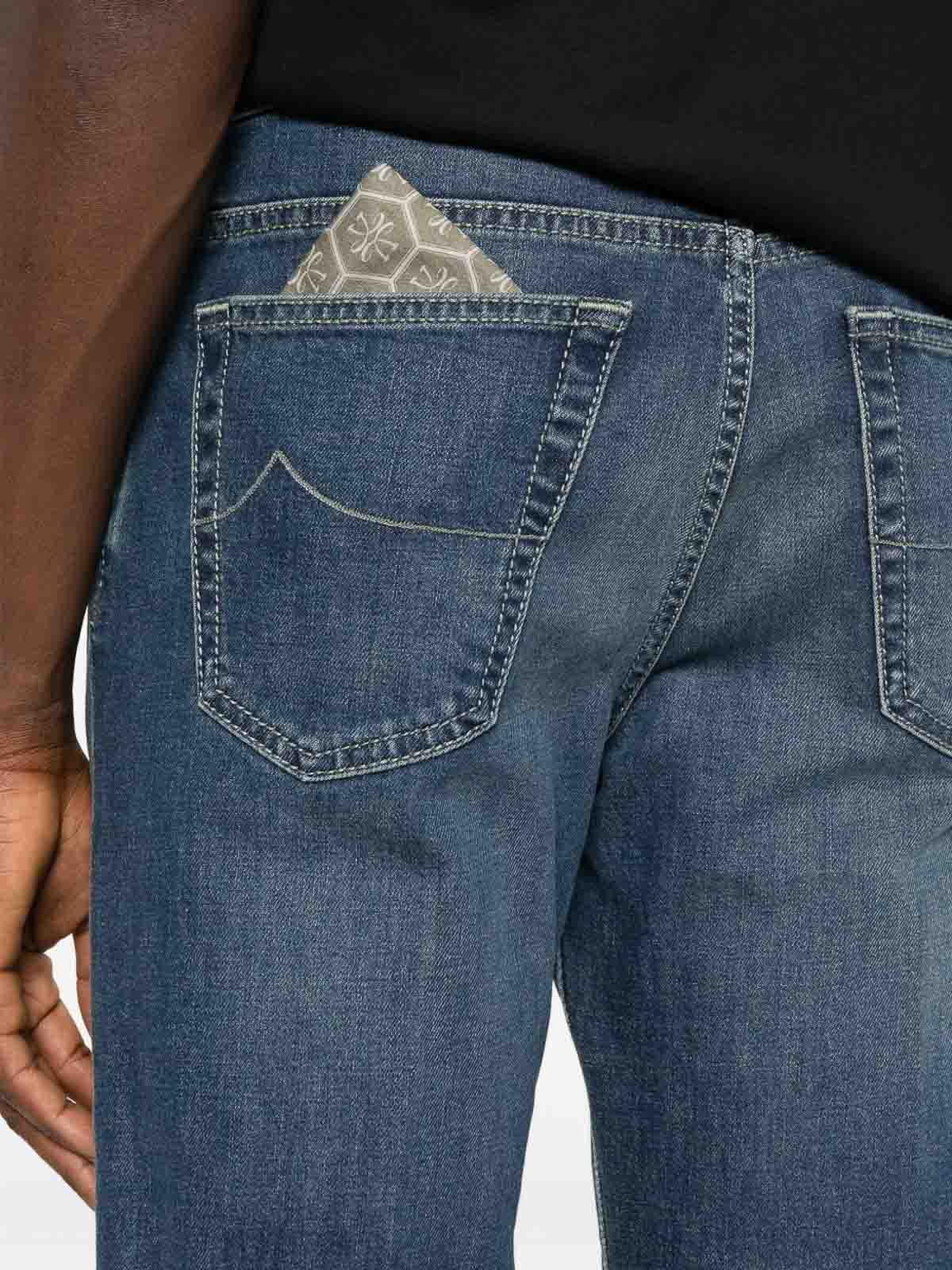 Chiusura frontale con zip e bottone blu, classica toppa con logo posteriore a cinque tasche con passanti per cintura