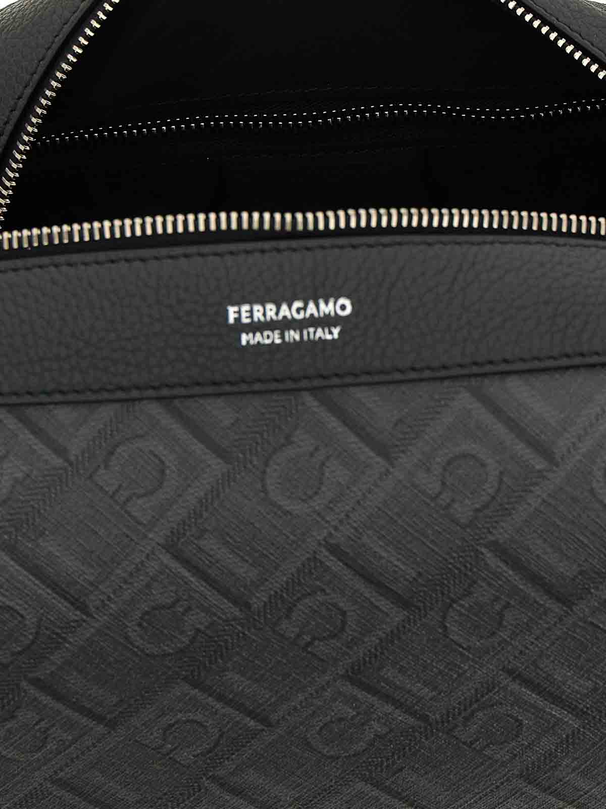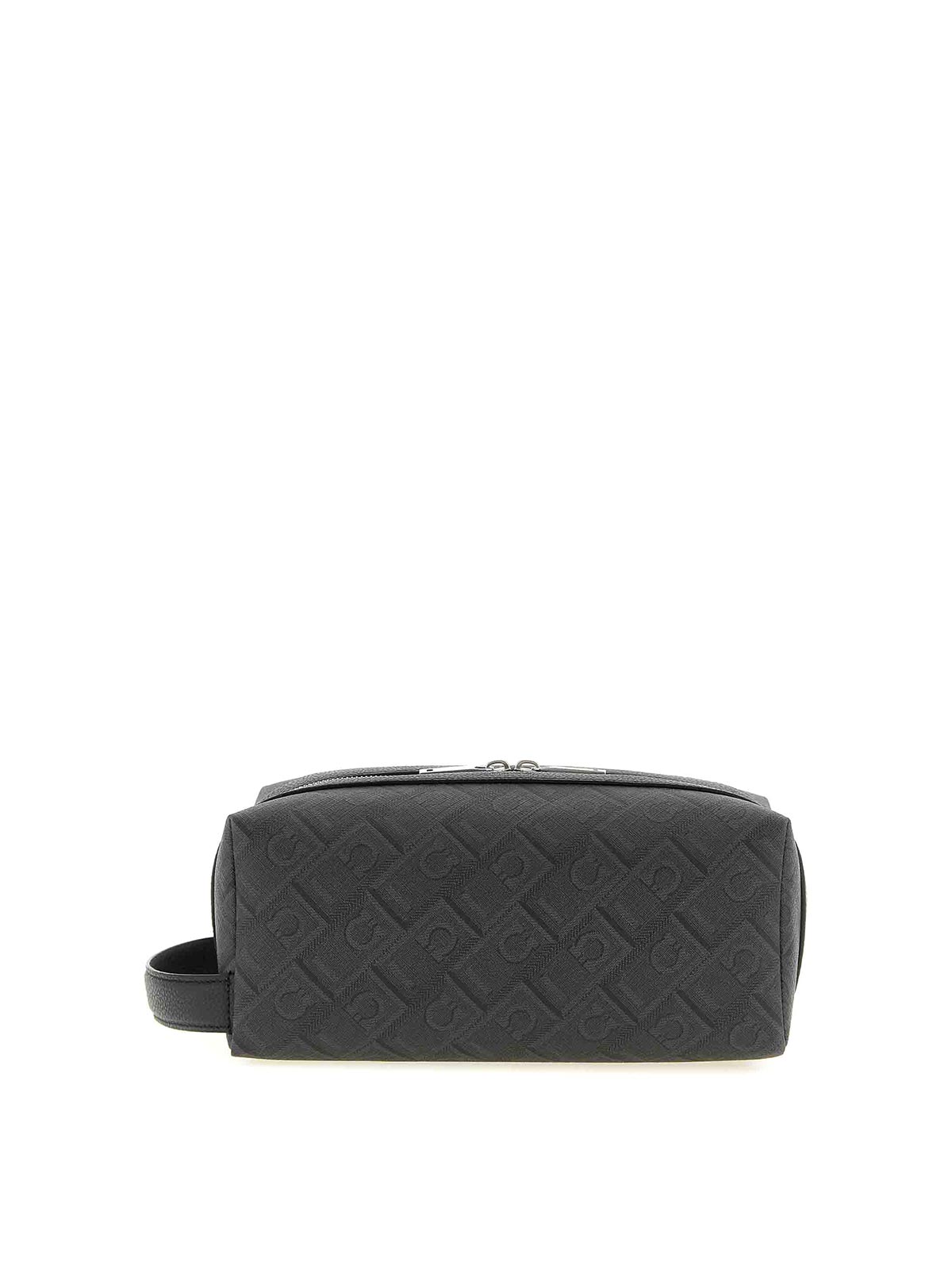 beauty 'dopp kit' in tessuto spalmato con stampa 'monogramma ferragamo' e pelle martellata tono su tono, logo in rilievo e chiusura Top con zip, manico.