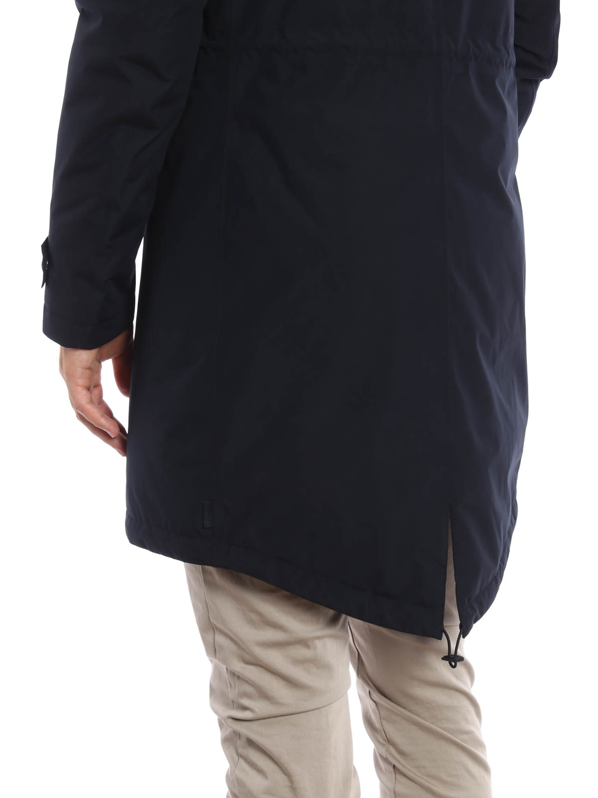 Parka impermeabile con cappuccio imbottito, chiusura con zip e automatici, due tasche con pattina sul davanti, inserti elasticizzati all'interno dei polsini. Interno trapuntato con taschino con zip e una leggera imbottitura in piuma d'oca. Fondo più lungo dietro con coulisse.