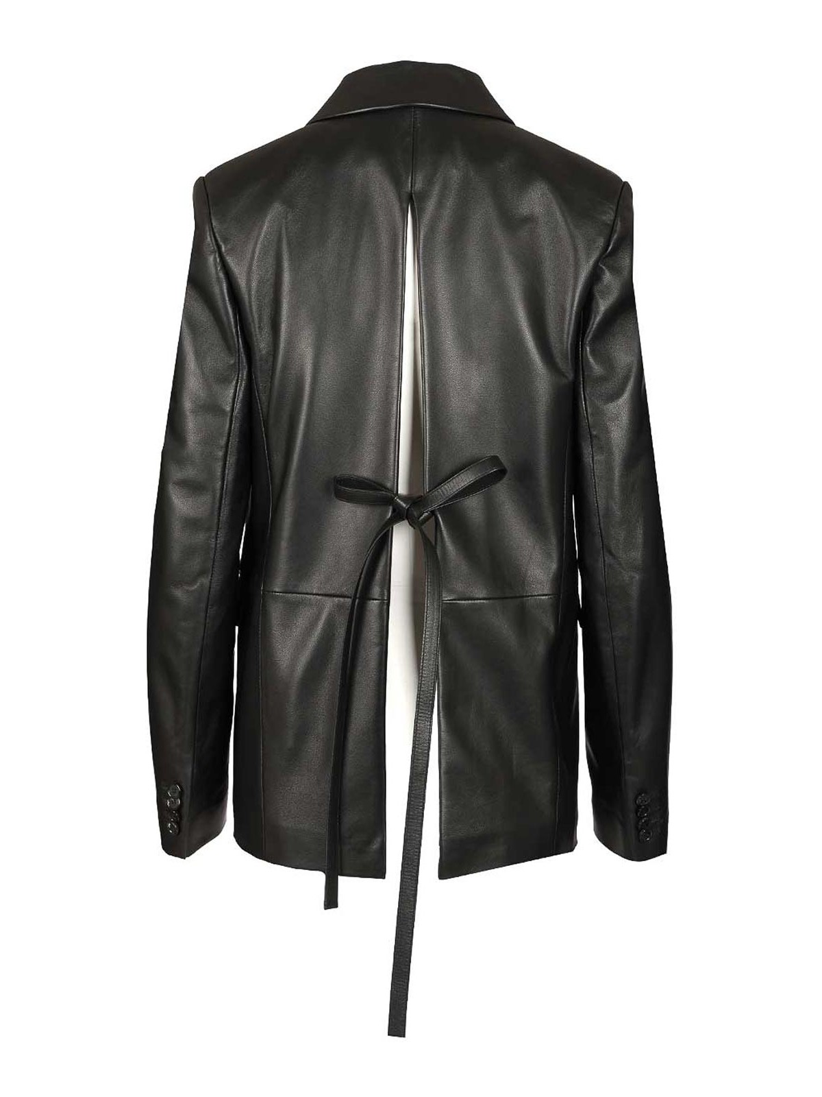 Lambskin nappa jacket by loewe, with back vent and adjustable laces, notched lapels, front button fastening, buttoned cuffs, chest welt pocket, welt pockets