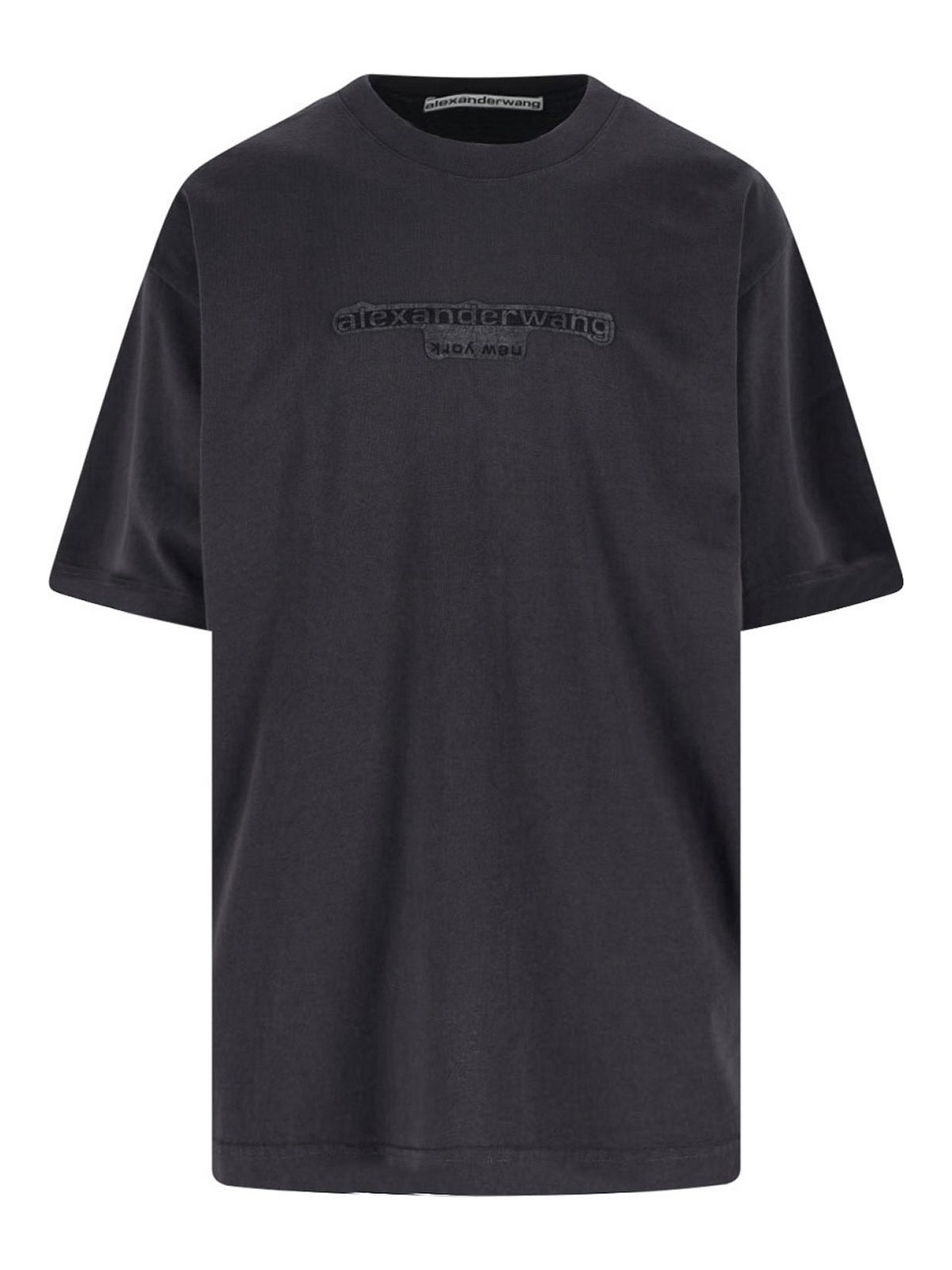 T-shirt logo alexander wang, in cotone nero, spalle scese, girocollo, maniche corte, ricamo logo tono su tono fronte, orlo dritto.