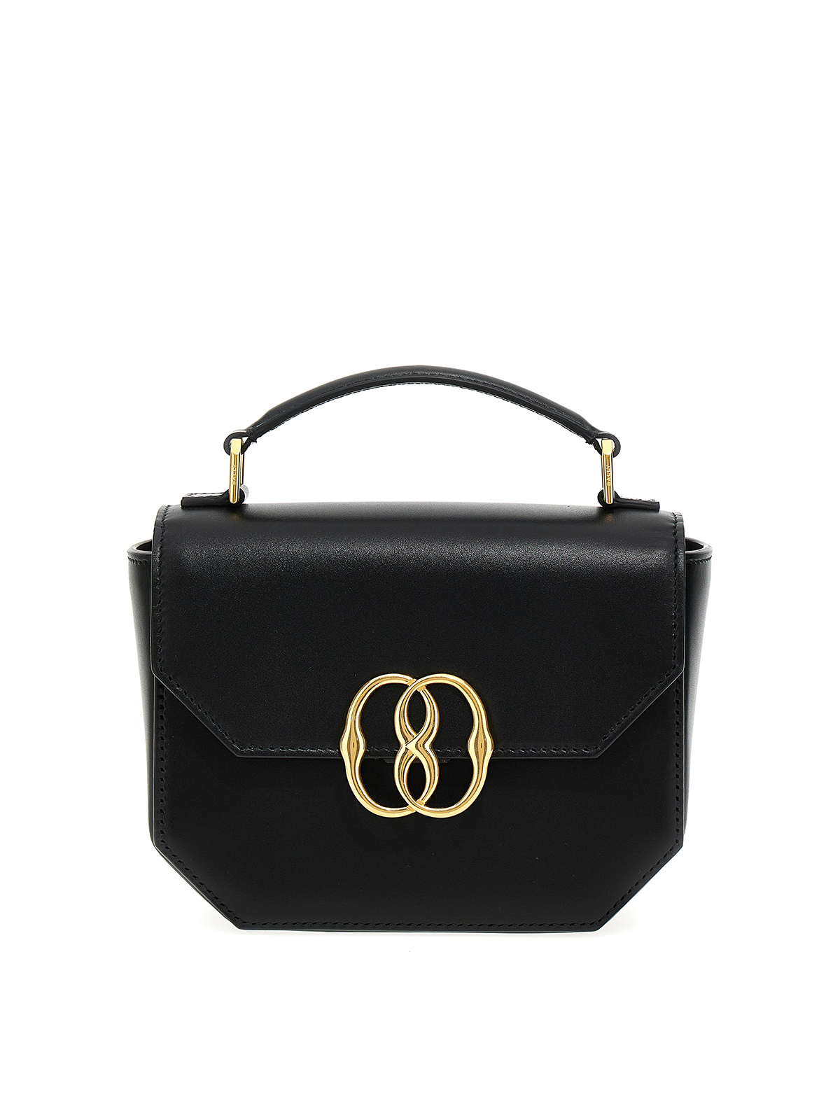 Borsa a mano in pelle con chiusura a patta magnetica con placca logo in metallo dorato applicata sul manico superiore anteriore e tracolla removibile
