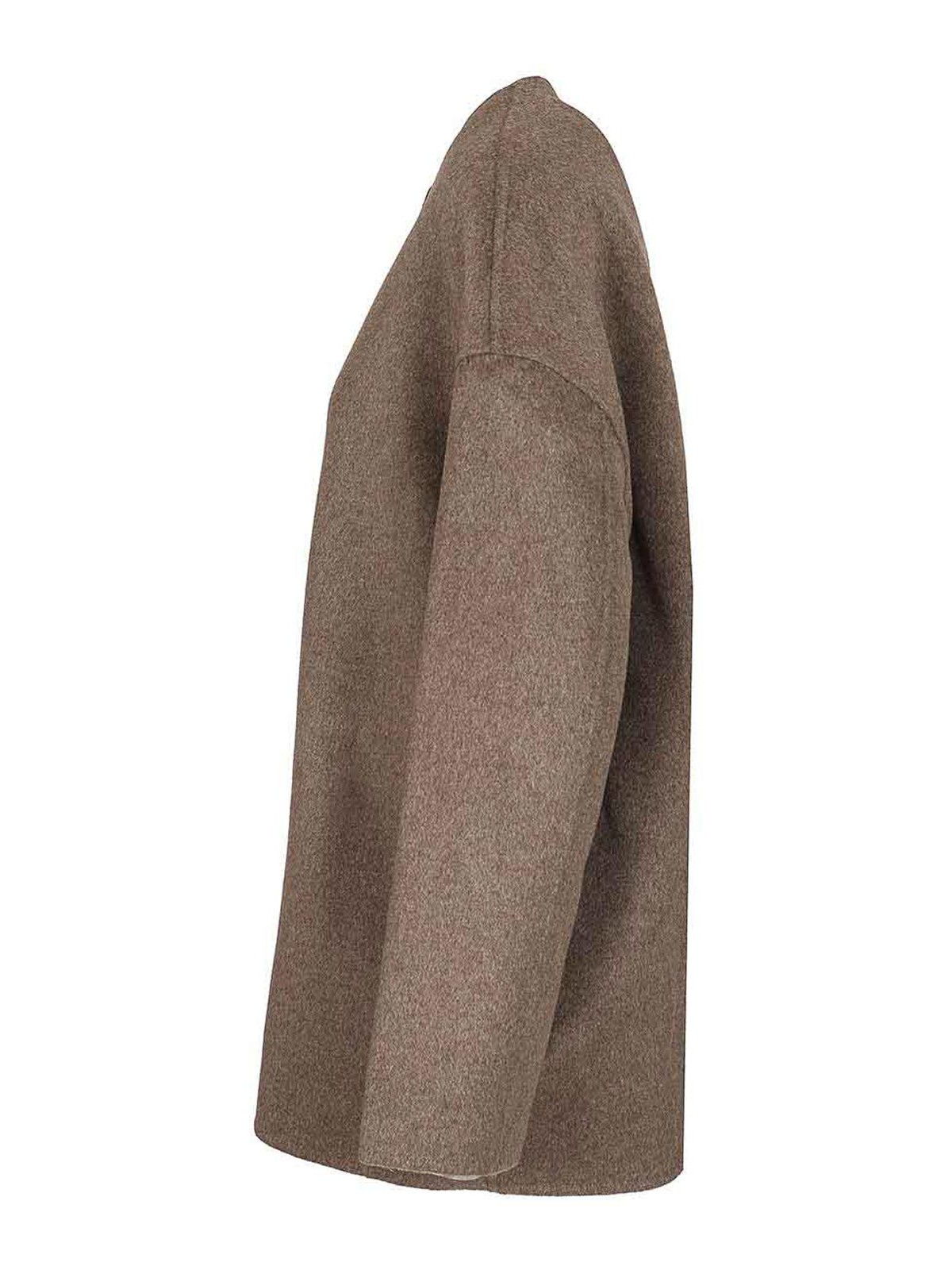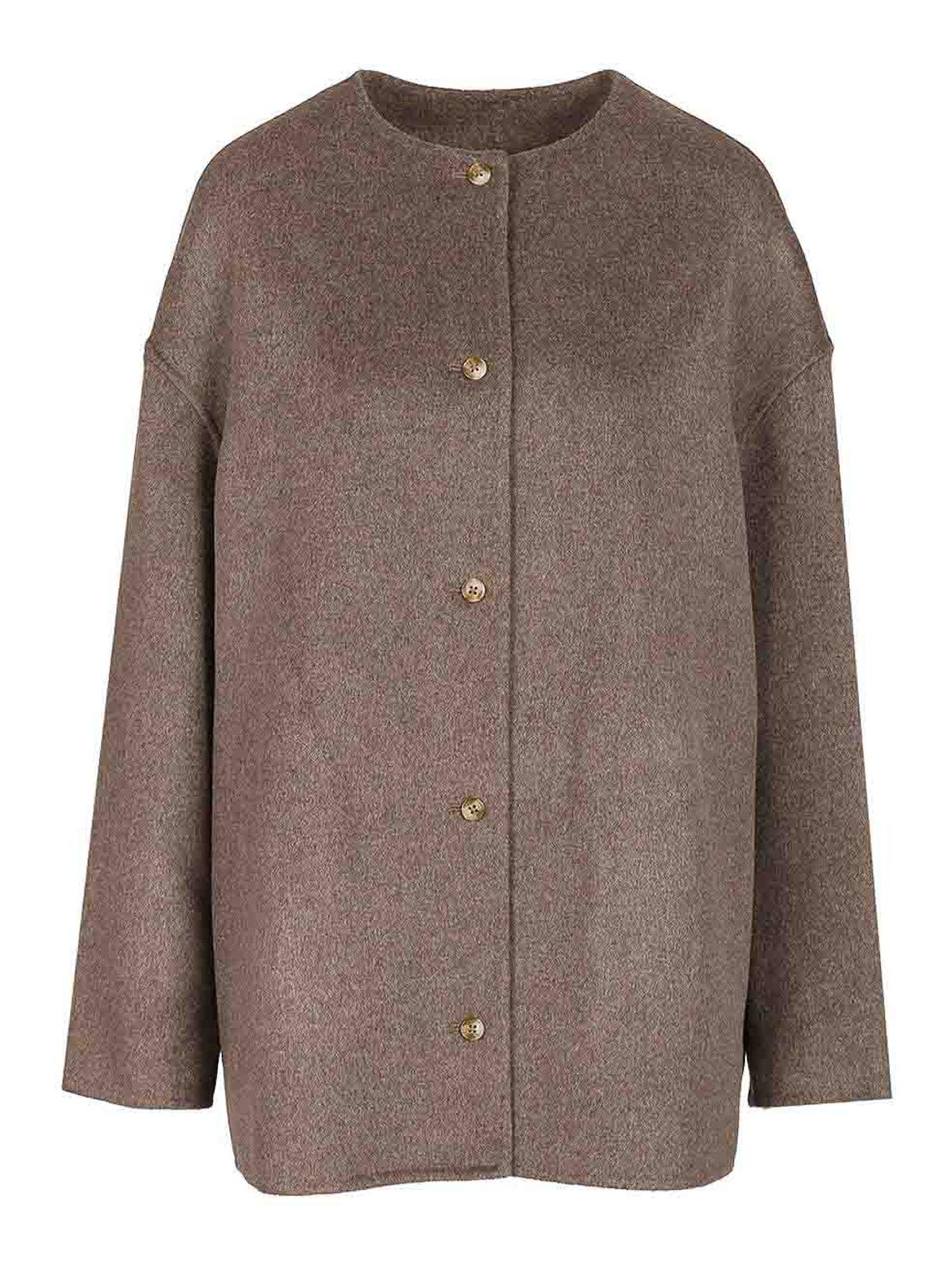 dunne short coat in draped wool and cashmere by lou lou de saison, with a straight fit, single-breasted front opening, round collarless neckline and dropped shoulders.