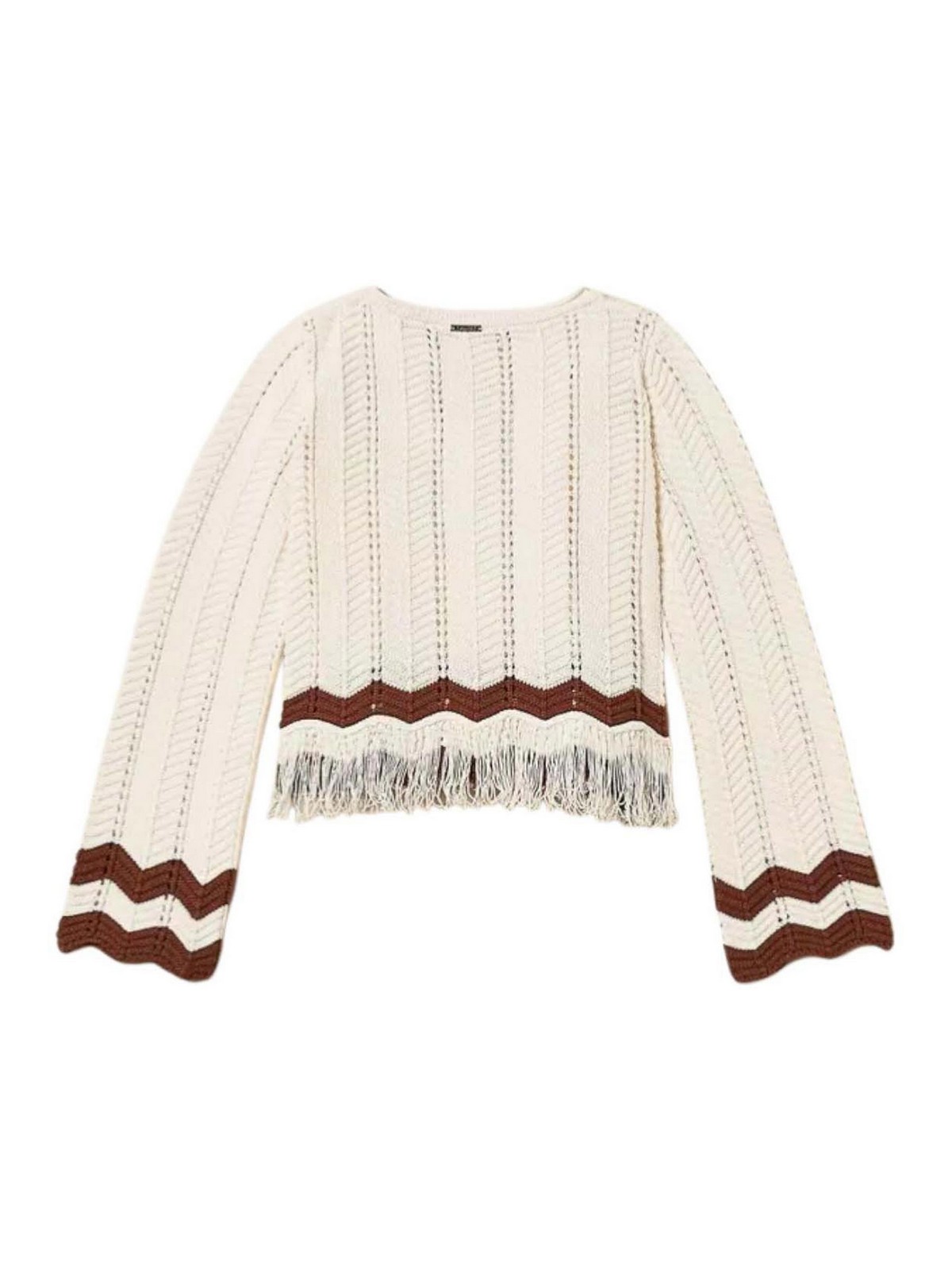 Twinset milano, maglia girocollo con zig-zag e frange, bicolor bianco/marrone,, maglia da bambina realizzata in puro cotone, caratterizzata da una linea dritta che garantisce comfort e libert di movimento. il modello presenta una lavorazione con coste punzonate e un motivo zig-zag al fondo impreziosito da frange, dettaglio che dona movimento e originalit al capo. il design, completato da collo tondo e maniche lunghe, mentre la placchetta logo in metallo applicata sul retro aggiunge un elemento distintivo., puro cotone, linea dritta, lavorazione a coste punzonate, motivo zig-zag al fondo, dettaglio con frange, collo tondo, maniche lunghe, placchetta logo in metallo sul retro.