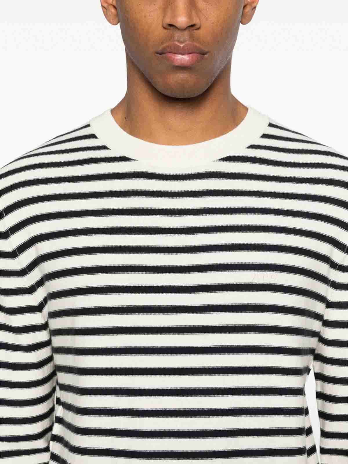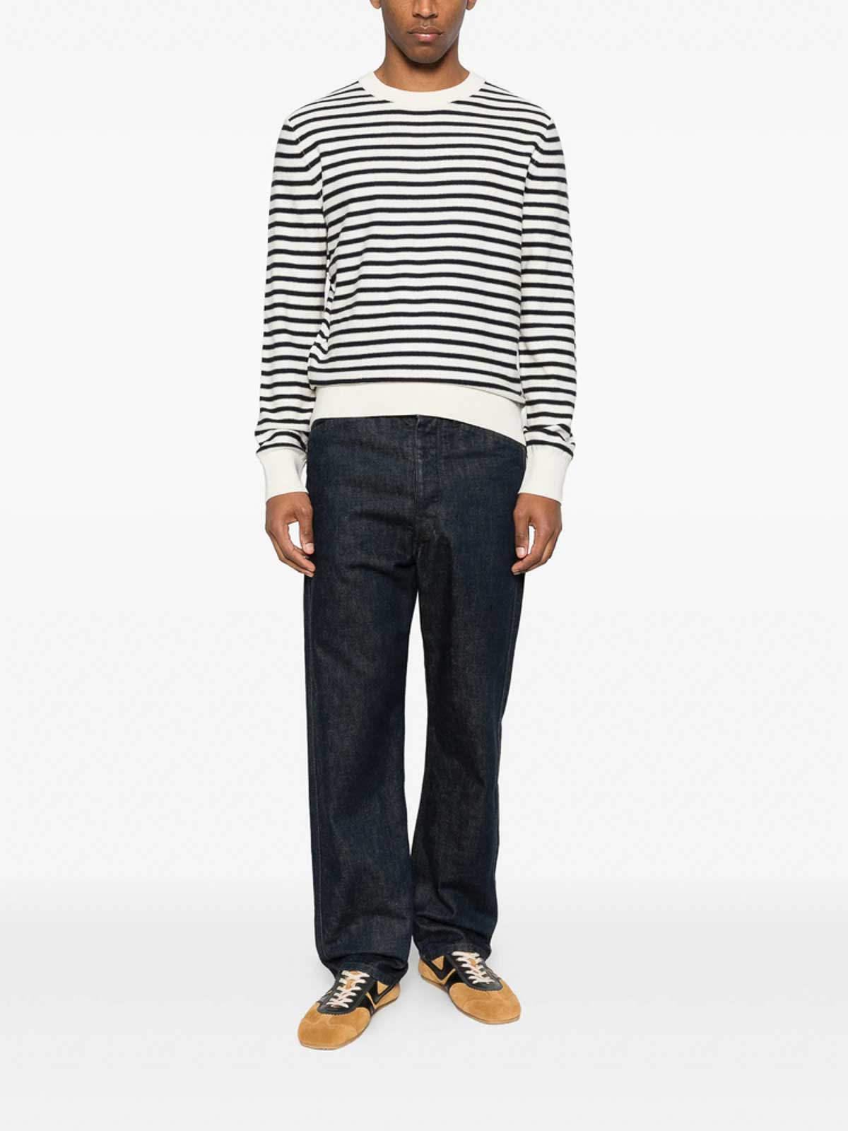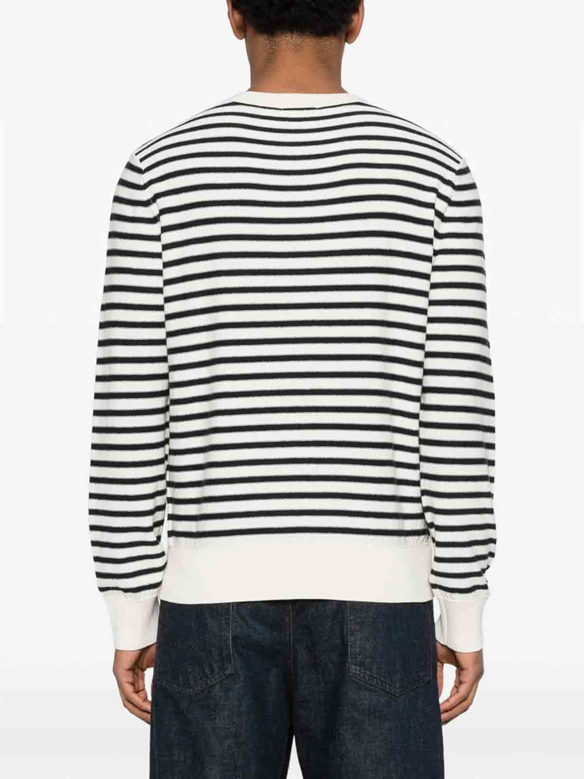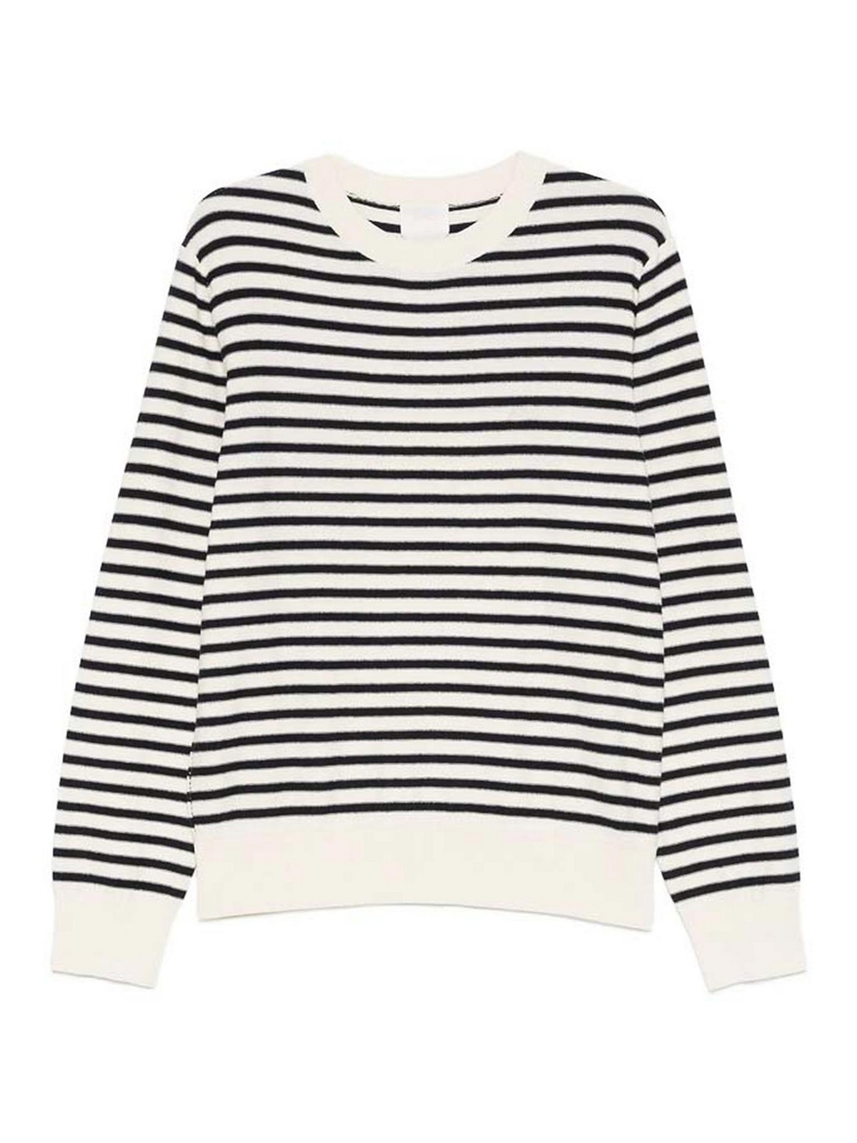 Motivo a righe orizzontali bianco sporco e blu scuro, girocollo, manica lunga, finiture a coste