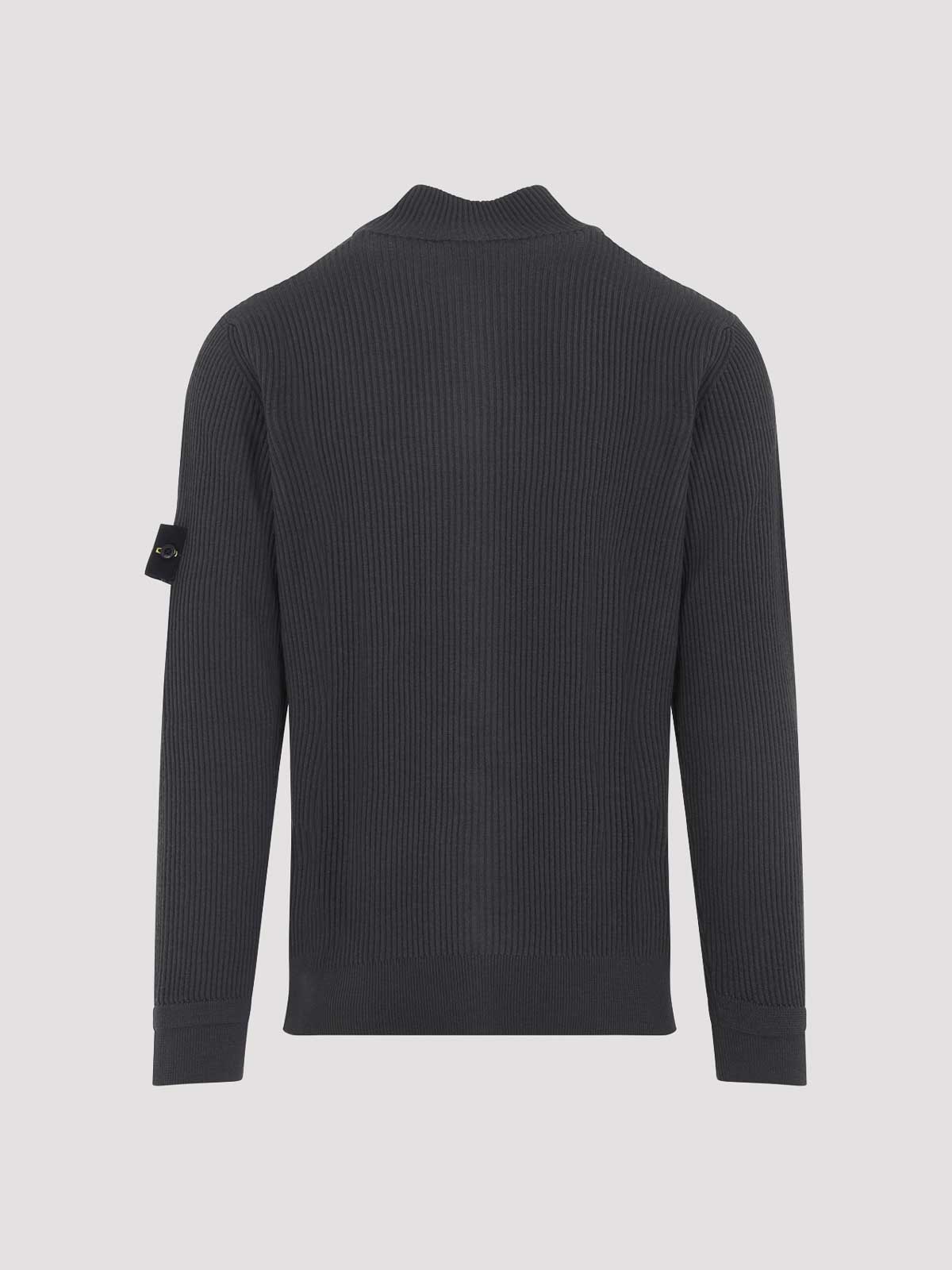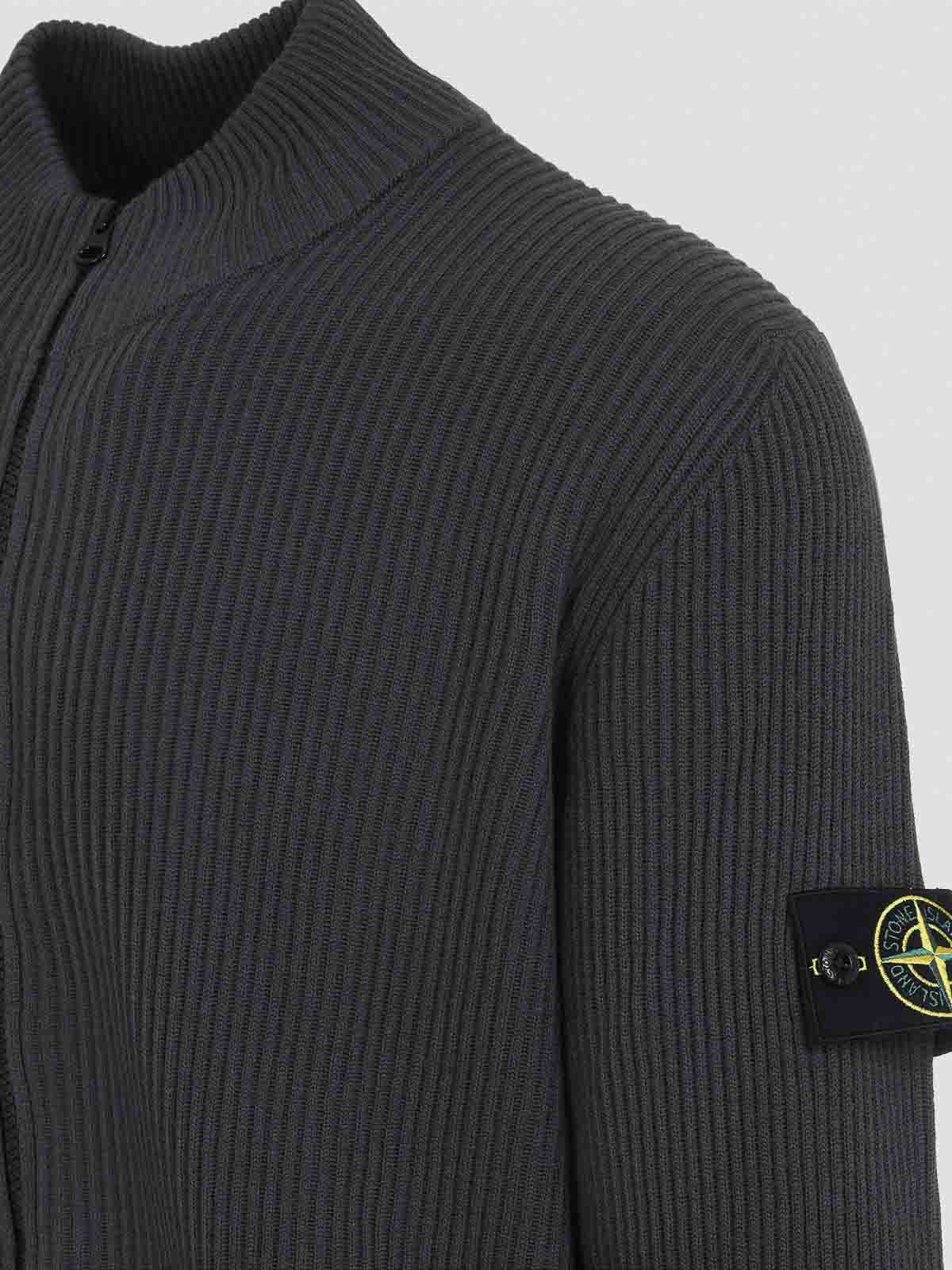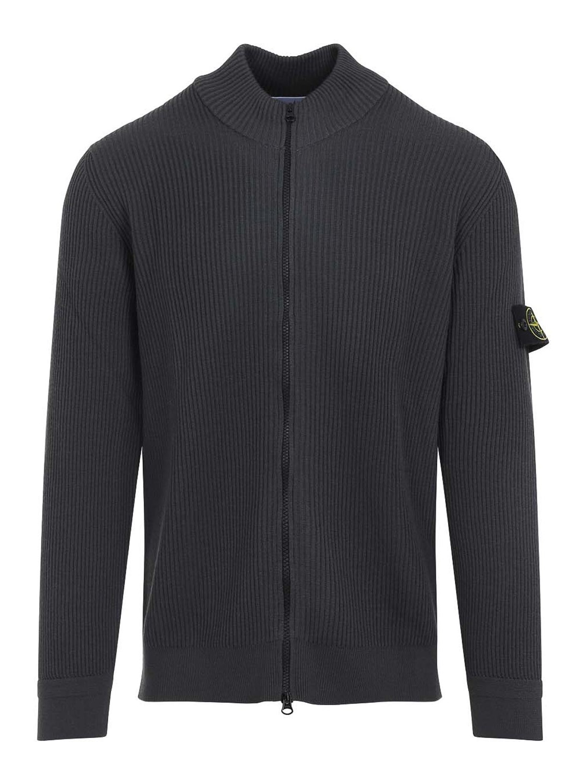 Stone Island Grey Sighi Craumato con scollo rotondo grigio a coste Due, Way Zip Long Logo Patch a l'orlo dritto