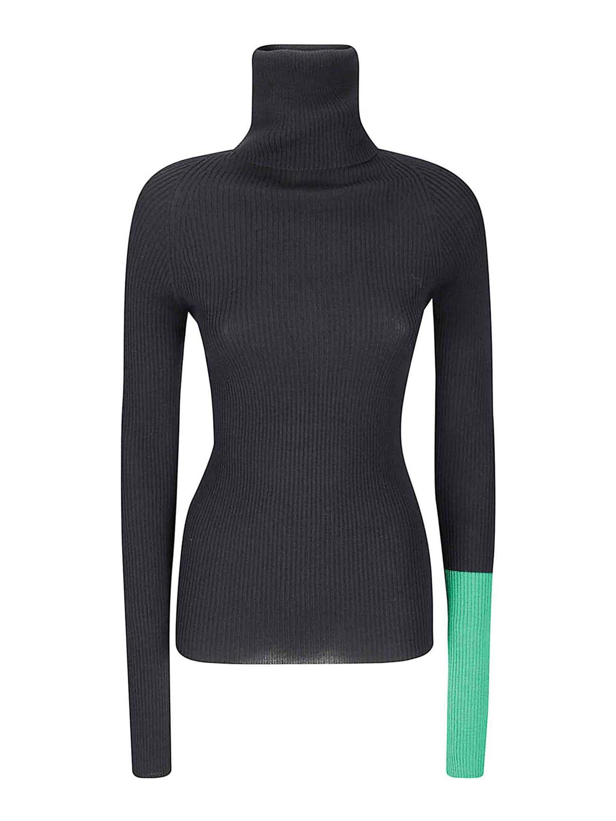 Maglione dolcevita, lavorazione a coste fini, orlo dritto, vestibilita' aderente, dettaglio polsino a contrasto.
