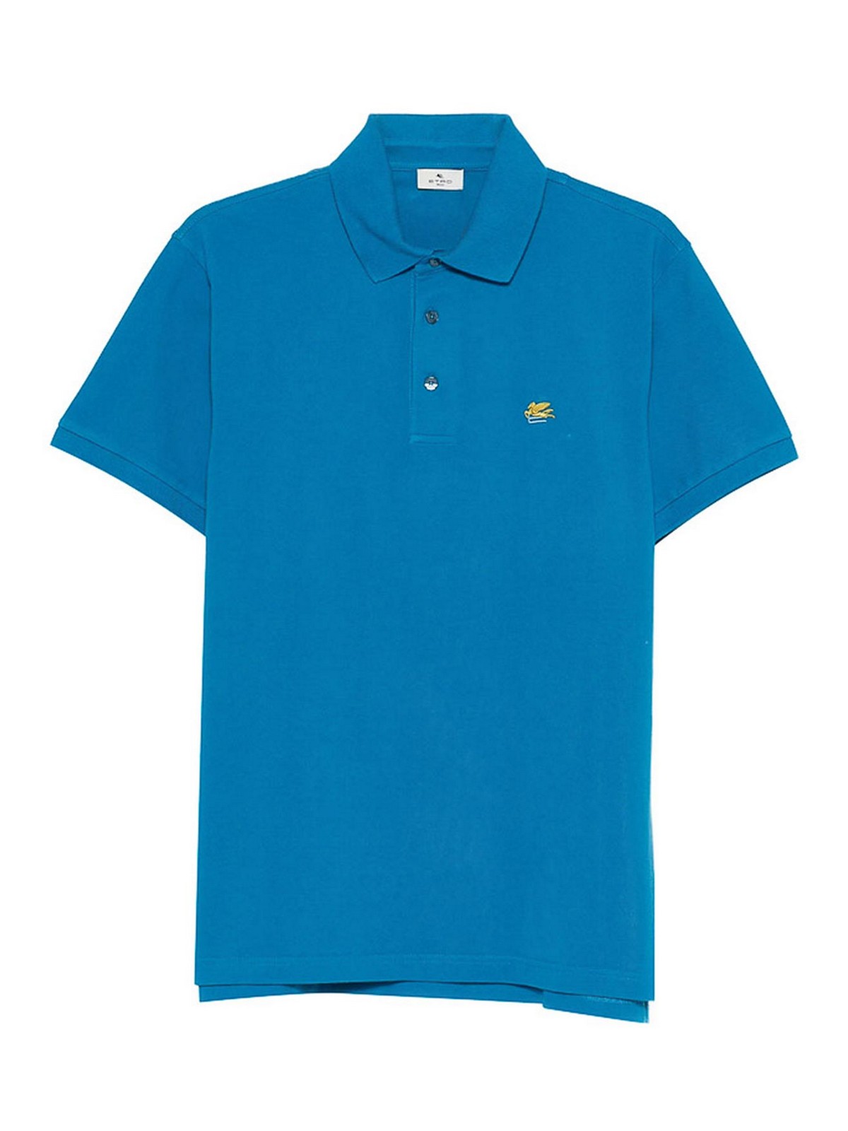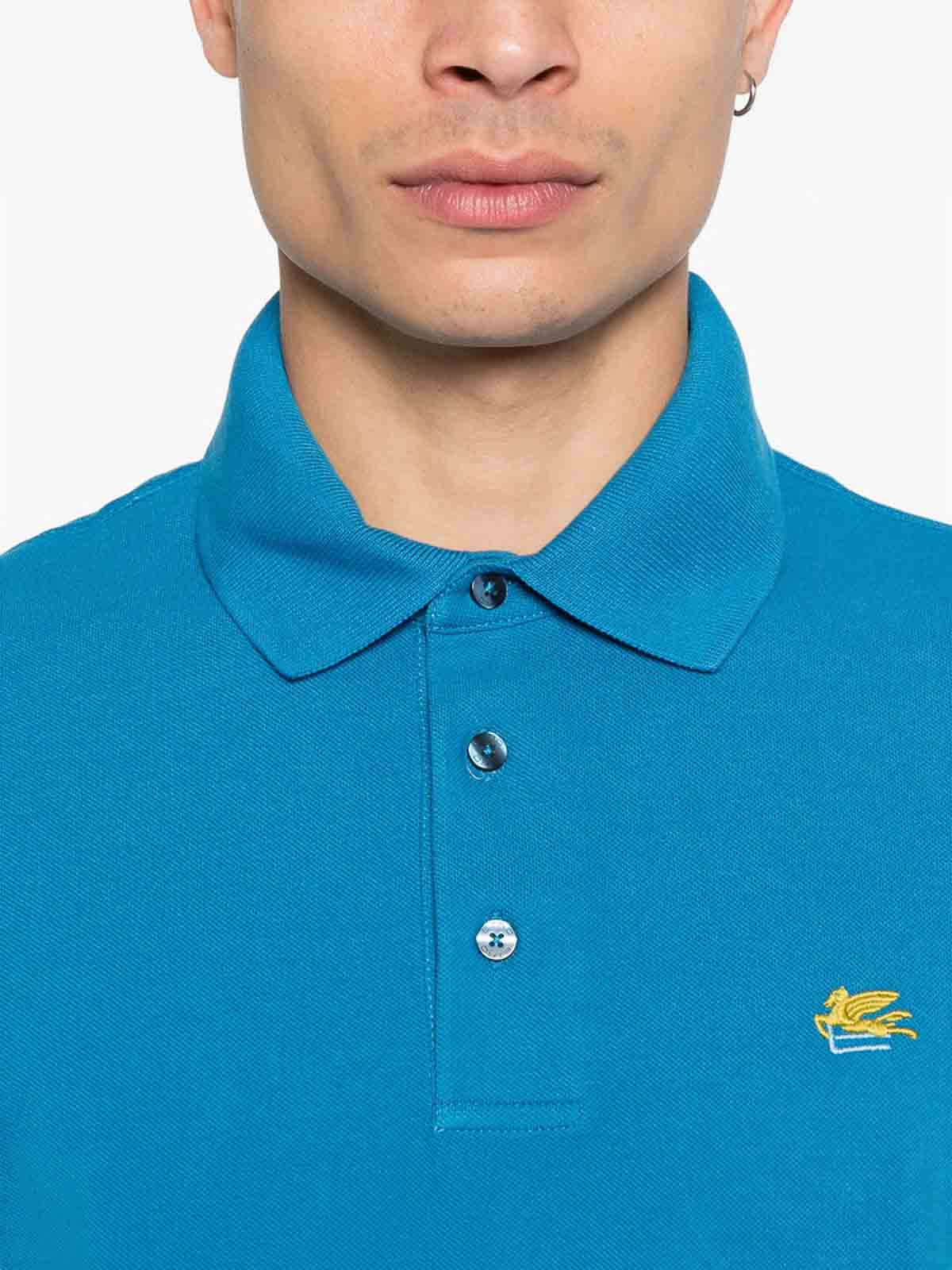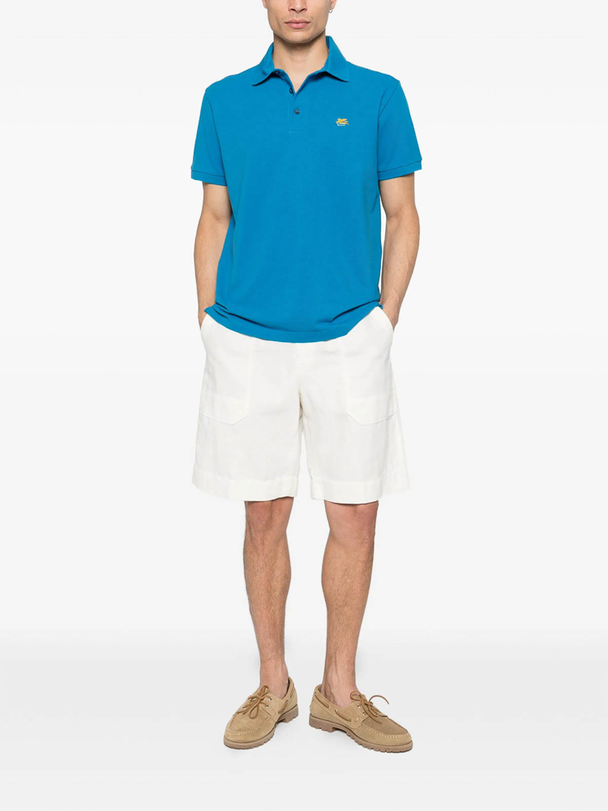 Dettagli ricamati blu, colletto polo, maniche corte, abbottonatura frontale