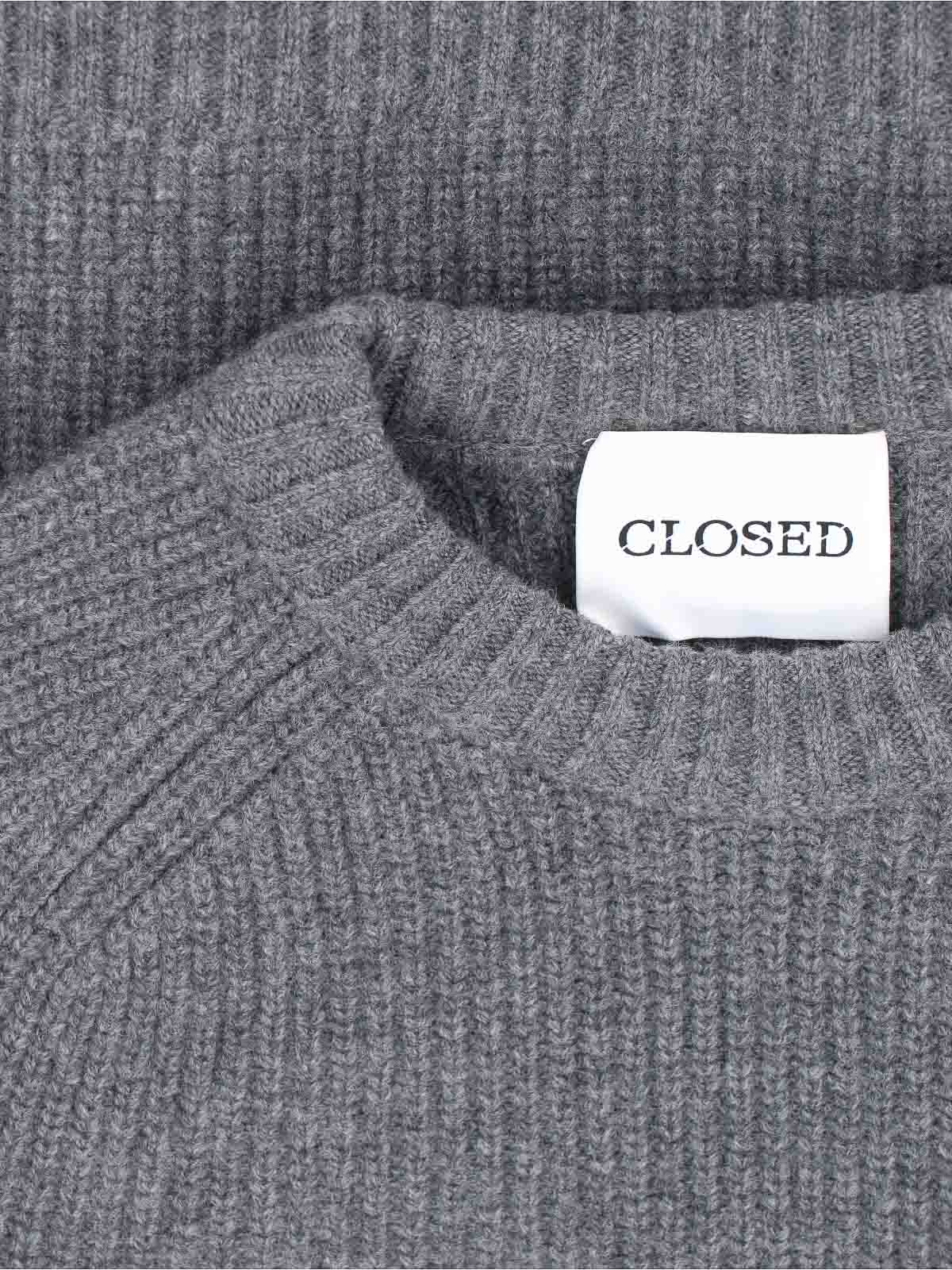 Maglione in lana closed, in lana grigia, girocollo, lavorazione a coste, orlo dritto.