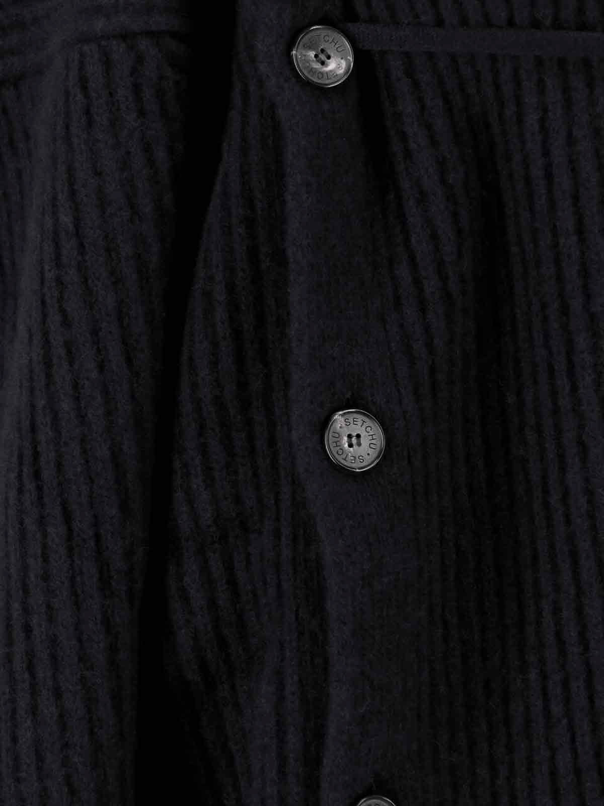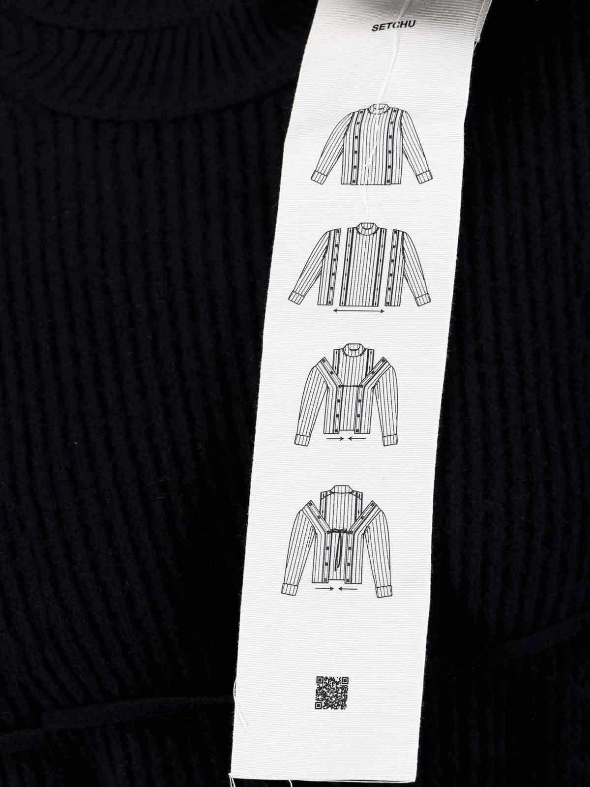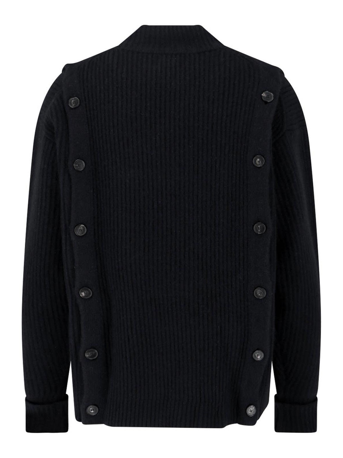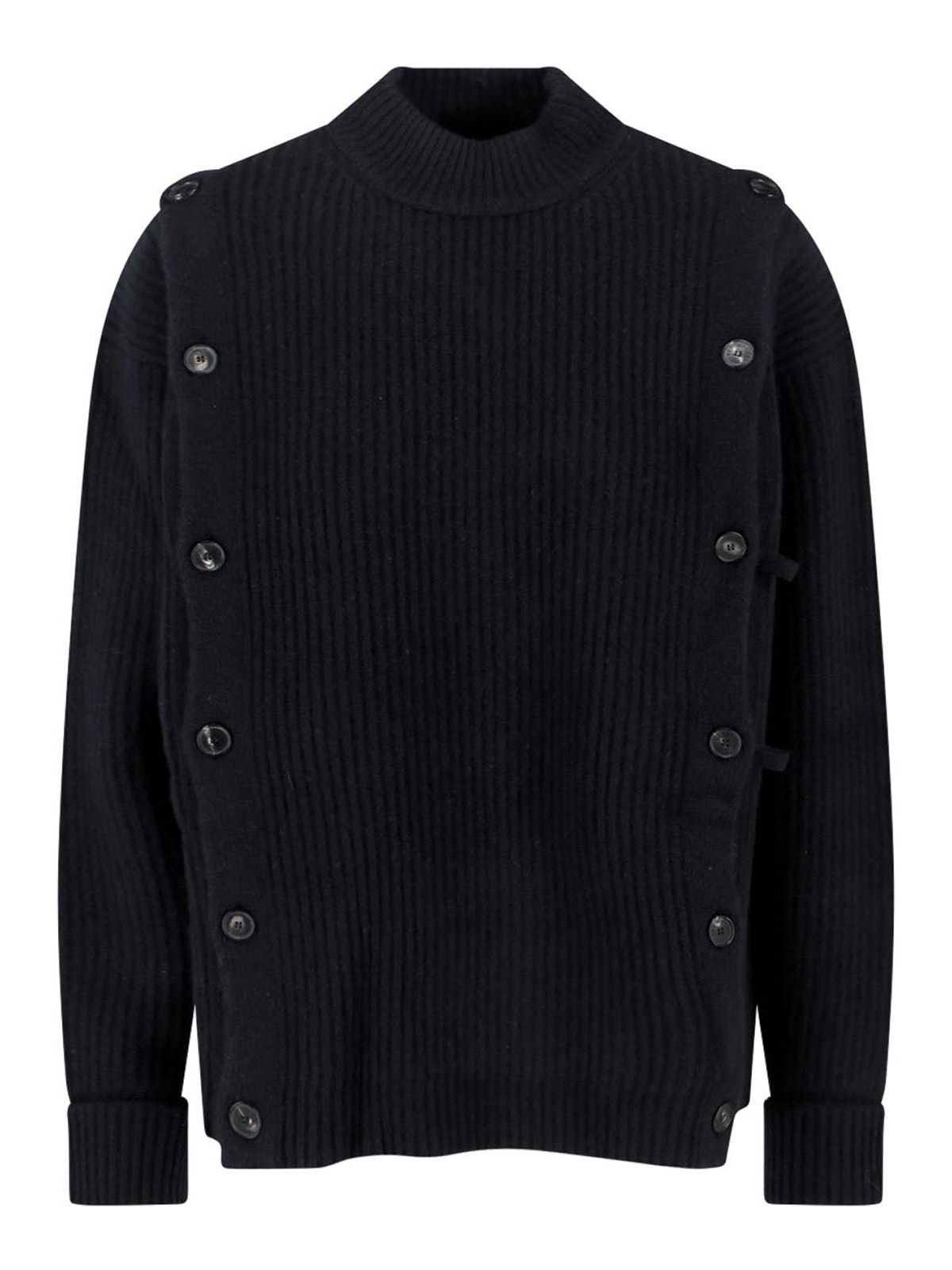 Maglione misto lana e cashmere setchu, nero, lavorazione a coste, collo alto, spalle scese, chiusura bottoni laterali, pannelli rimovibili e regolabili, cinturino regolabile, orlo dritto.