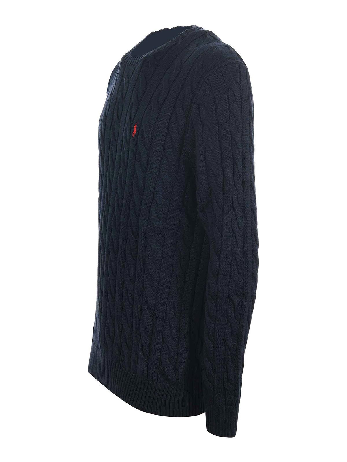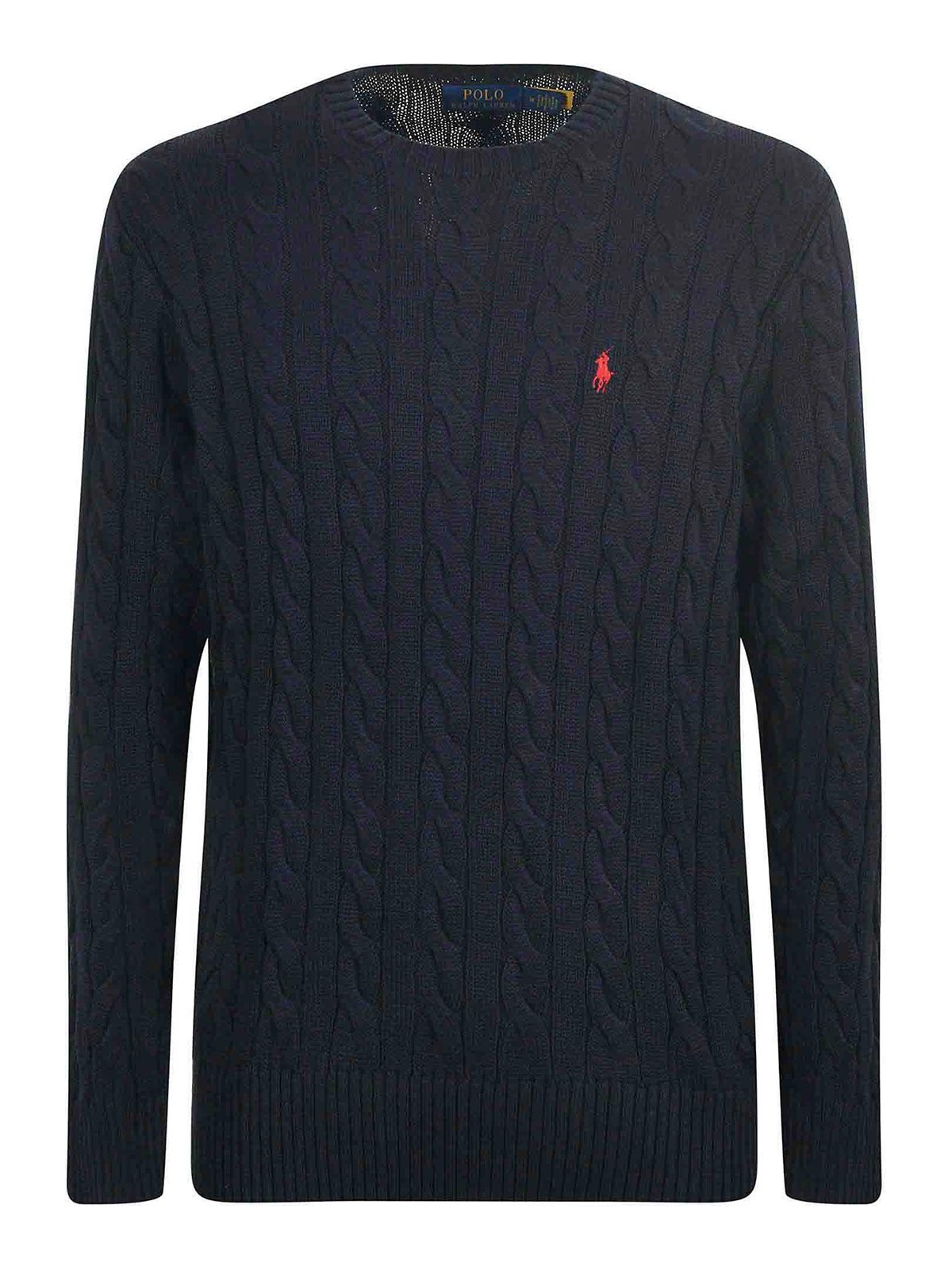 Maglia Polo Ralph Lauren a trecce in caldo cotone nero. girocollo a costine. maniche lunghe. polsini e orlo a costine. logo ricamato a contrasto sul davanti. taglia mostrata: m 100% cotone