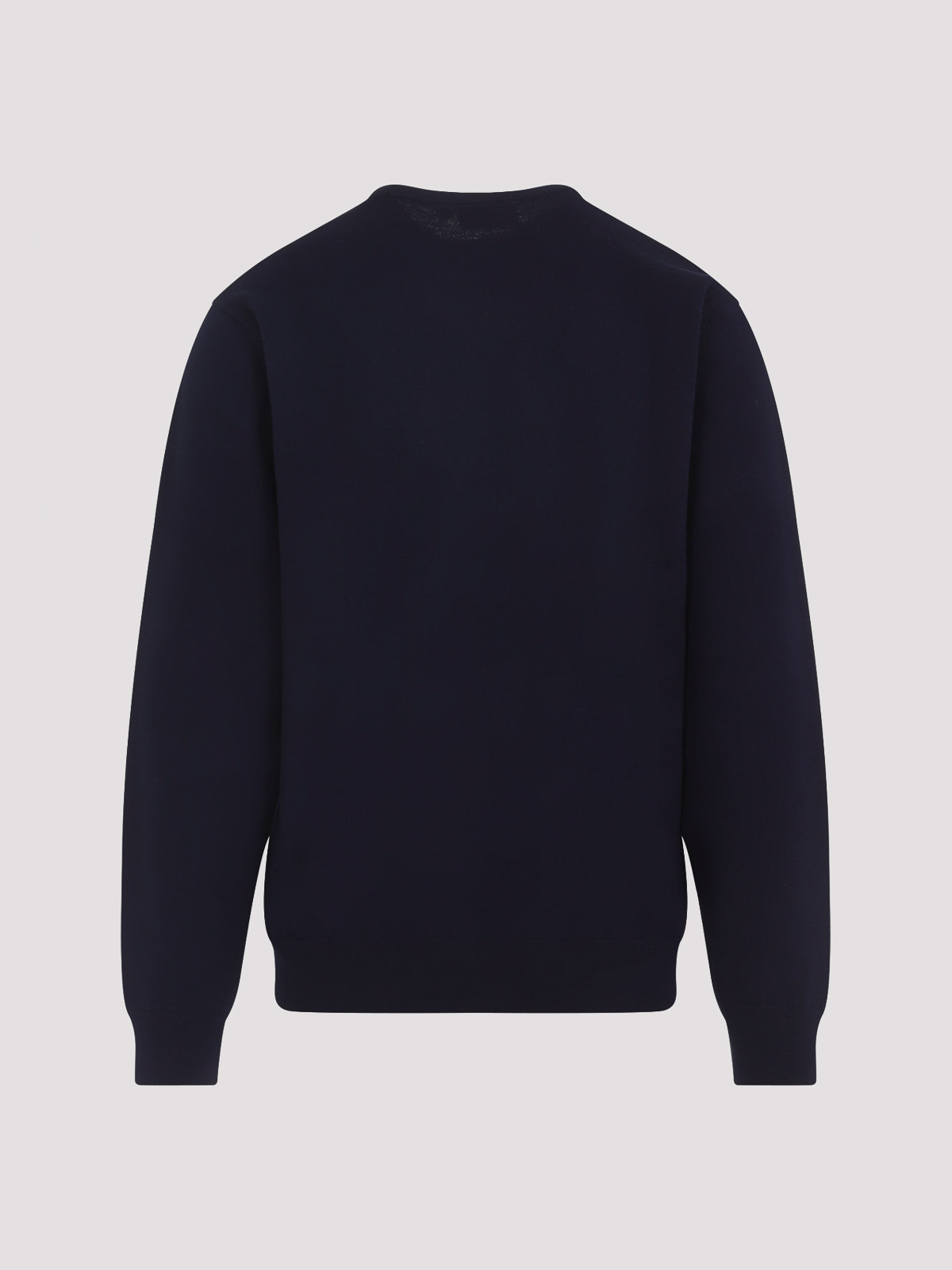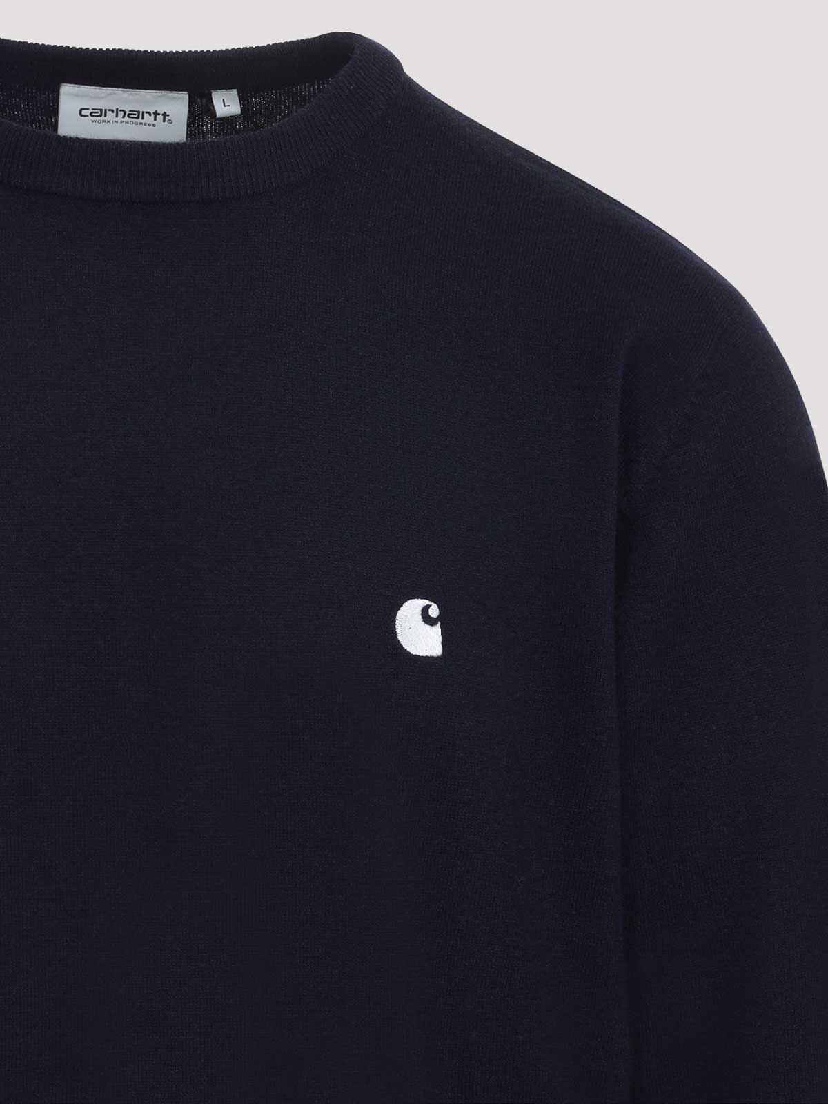 Carhartt Wip Dark Navy Blue Madison maglione realizzato e miscela rotonda torce a costola del petto contrasto bianco ricamato ricamato a maniche lunghe e orlo dritti