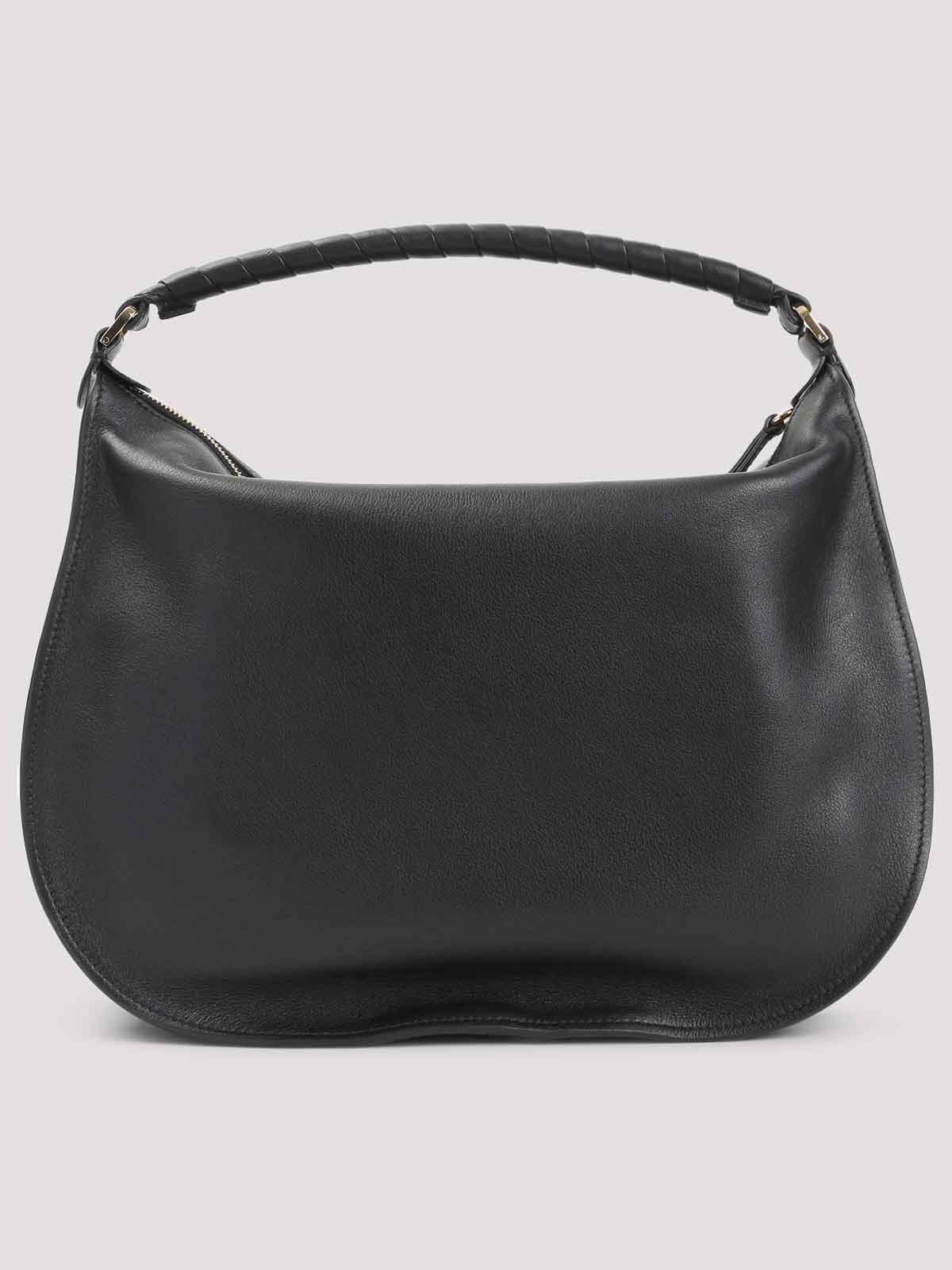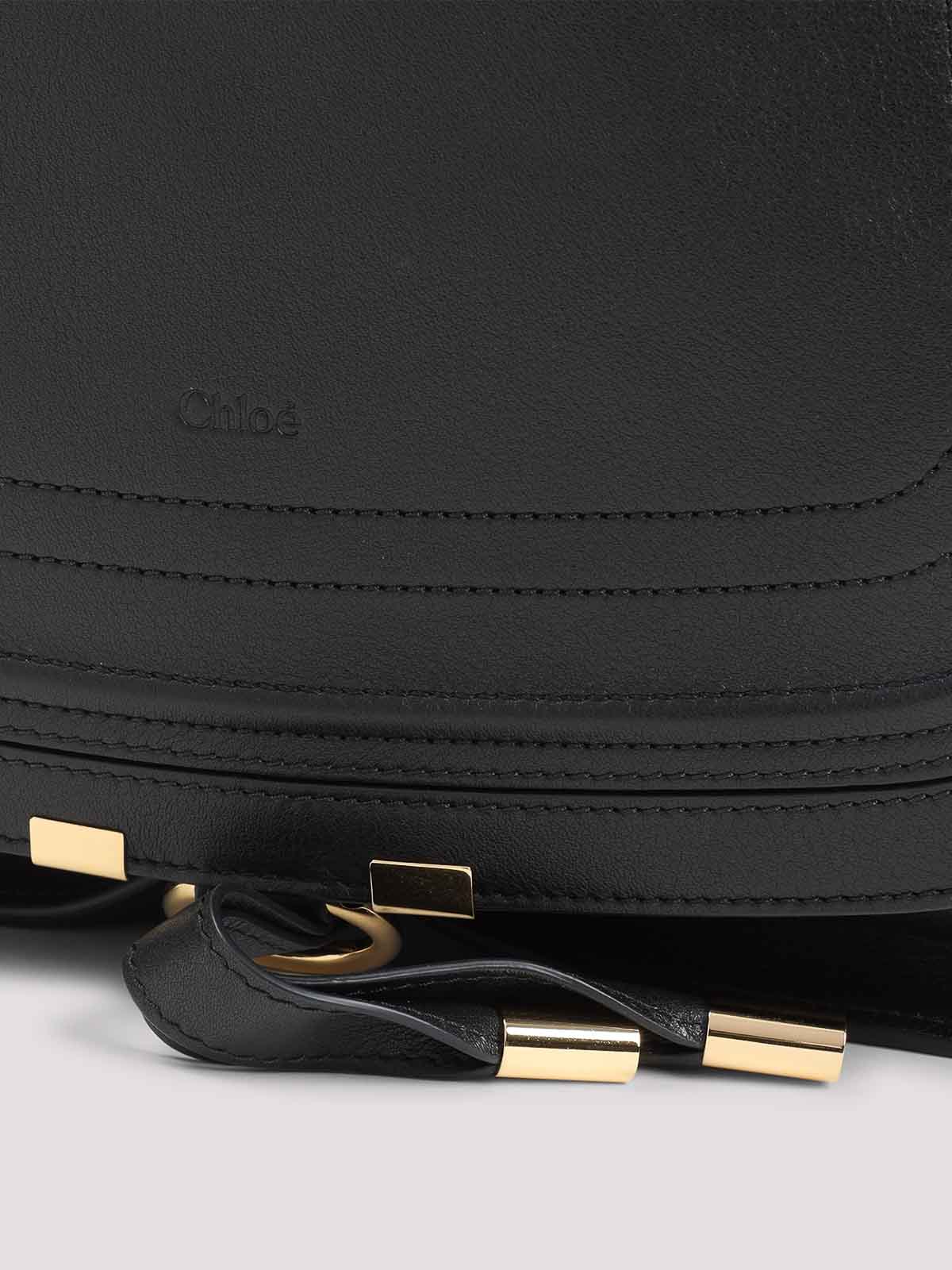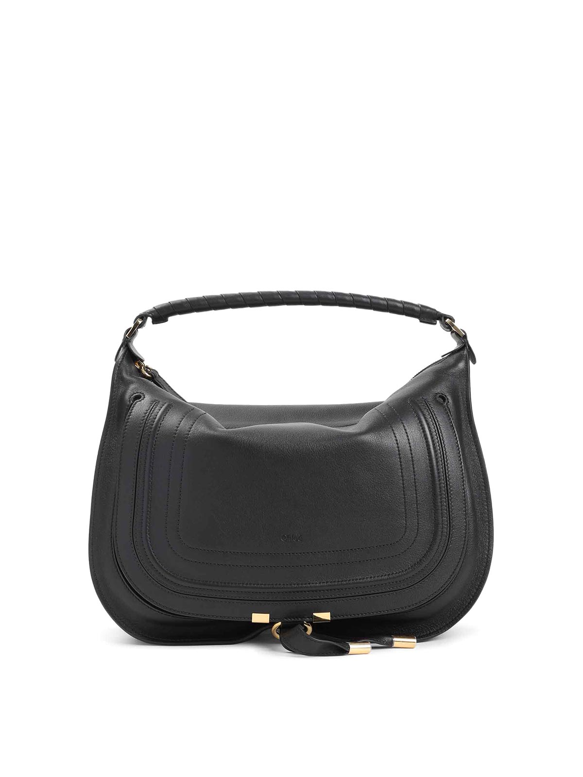 Borsa Marcie Chloe in pelle di vitello nera. borsa in pura pelle di vitello nera, tracolla superiore, chiusura superiore con zip, chiusura con patta frontale, logo inciso sul davanti, tracolla regolabile tono su tono sul davanti con dettagli metallici color oro, uno scomparto principale. hardware color oro.