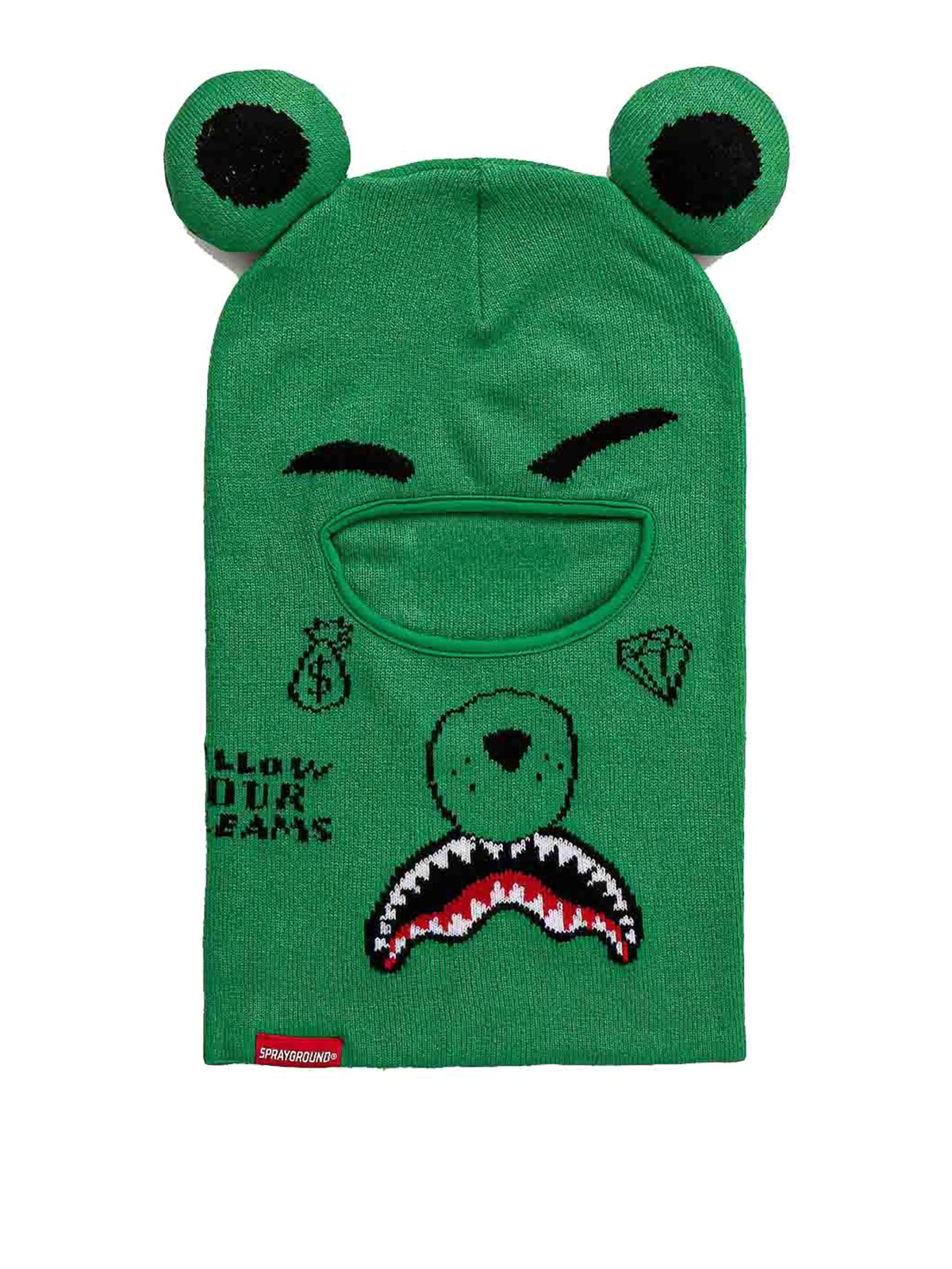 Green money bear ski mask in verde passamontagna di sprayground lavorato a maglia con motivo shark e ricami lavorato a maglia motivo shark ricami etichetta sprayground colore verde