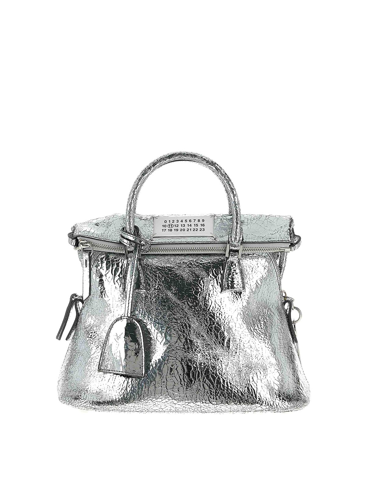 Borsa mini '5ac classique' in pelle craquelé metallizzata, chiusura con zip ripiegata e patch 'firma numerica mm6' in pelle a contrasto, doppio manico fisso, base rigida con piedini in metallo, retro 'quattro punti', portachiavi removibile, tracolla removibile.