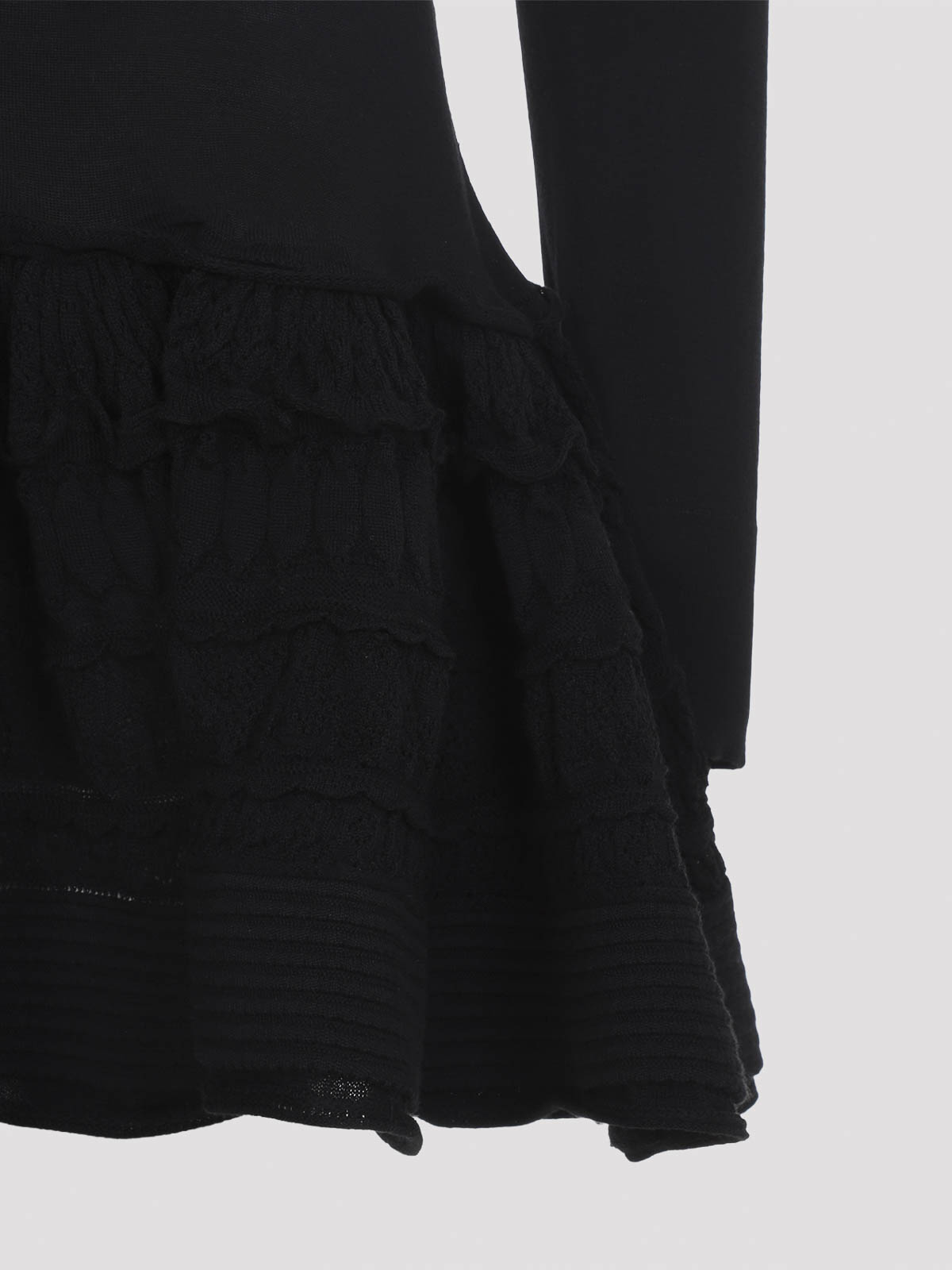 Miniabito Alaa in lana nera con volant. realizzato in maglia di lana nera, presenta uno scollo rotondo aperto, maniche lunghe, gonna voluminosa con pannelli in pointelle, corpetto slim fit.