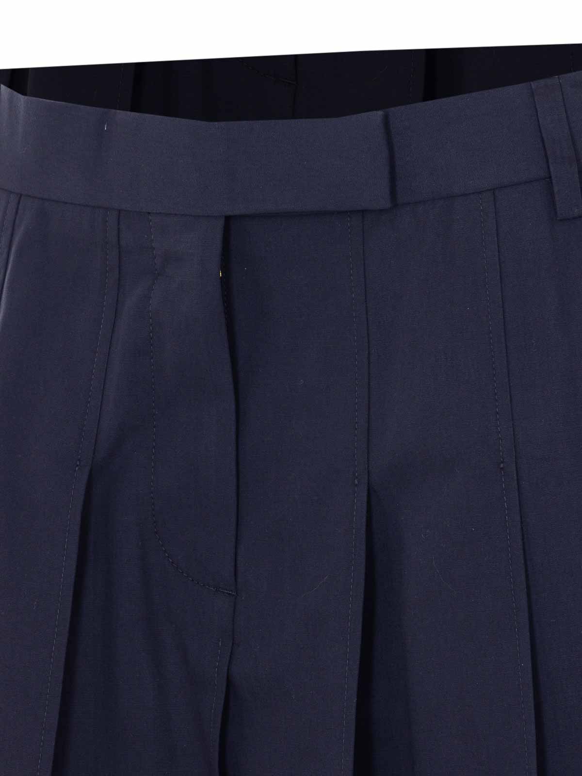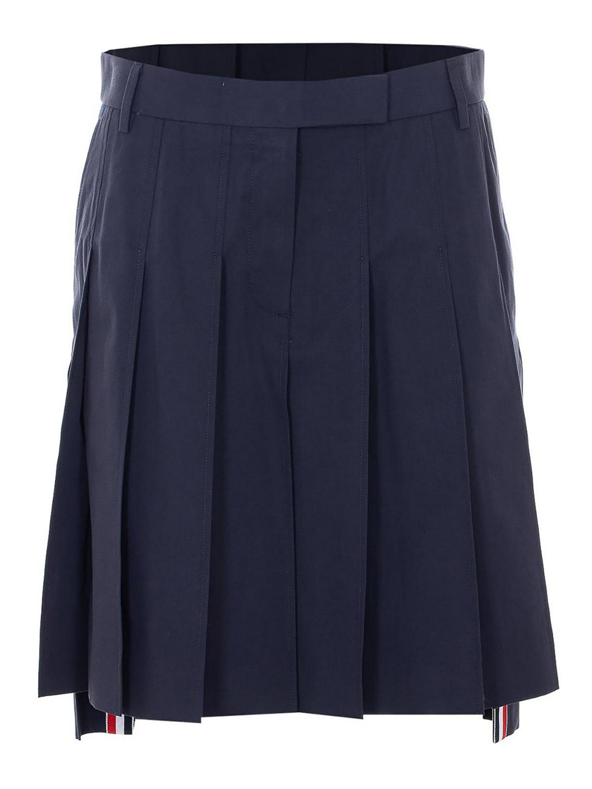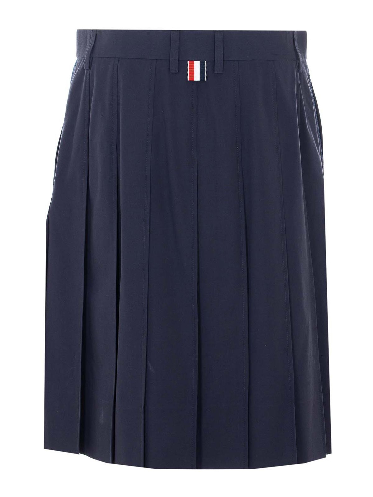 Minigonna Thom browne blu, chiusura con zip e gancio, con logo a righe sul davanti, asimmetrica e plissettata, chiusura con bottoni sul retro