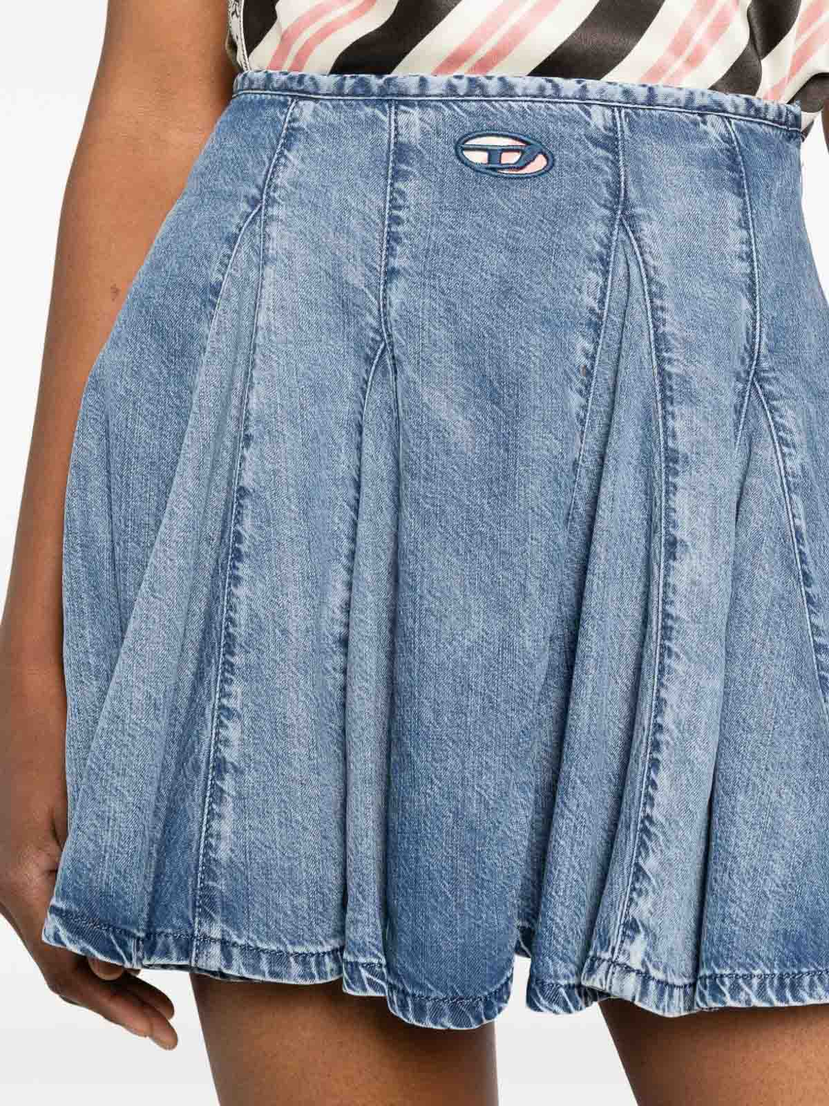 Minigonna di Diesel in denim blu di misto cotone, caratterizzata da toppa con logo, dettagli plissettati, cuciture a vista e orlo a taglio vivo. la silhouette a trapezio esalta il movimento e la forma, perfetta per look casual, serate estive o outfit cittadini contemporanei. il tessuto misto cotone garantisce resistenza e comfort, mentre i dettagli sartoriali rendono questo capo una versione moderna del classico denim, di Diesel.