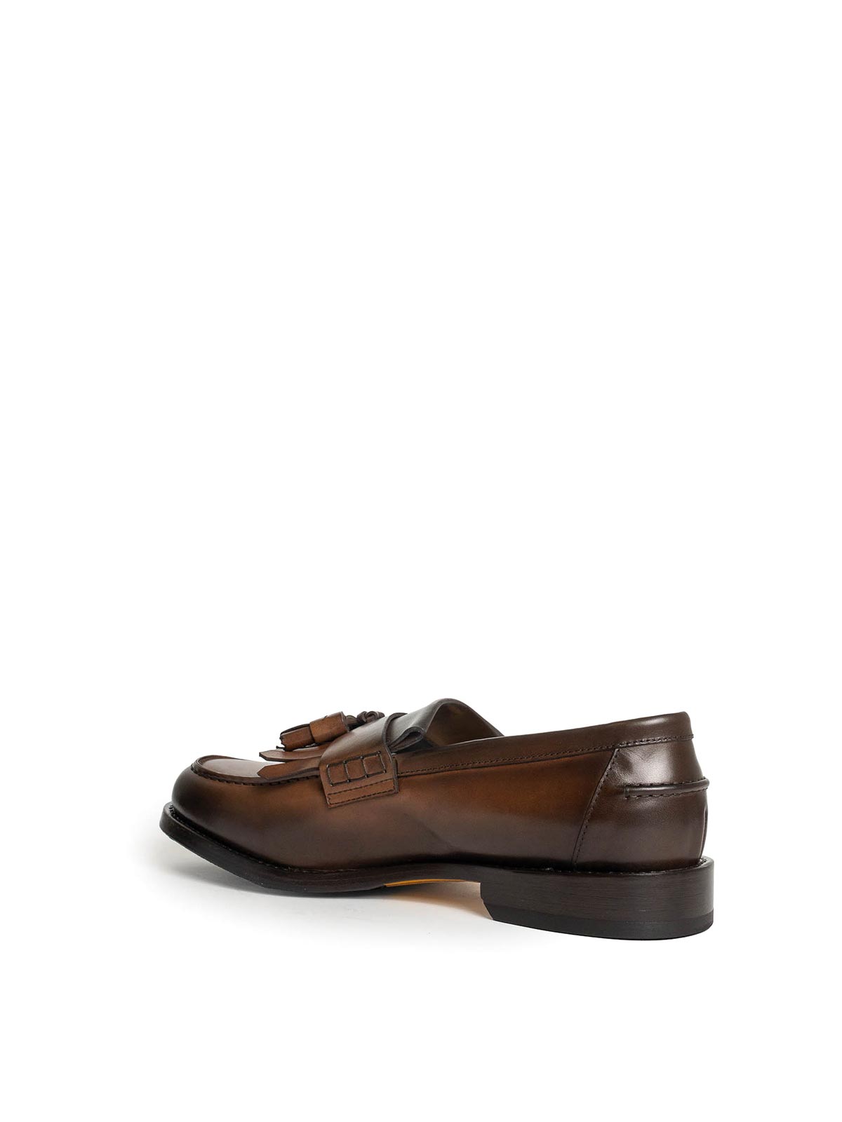 Mocassino marrone con nappine e frange tipo classico mocassino garzato marrone bruciato con frange decorative e nappine sul collo del piede cucitura pan che evidenzia l'eleganza artigianale del modello slip, calzata senza lacci con slip non, per una maggiore aderenza e durata color cuoio morbido e traspirante per il comfort di tutti i giorni con fondo rinforzato basso e stabile